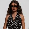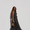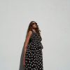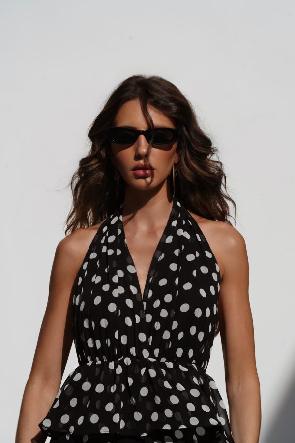 Ficha técnica: confeccionado em tecido leve de poliéster com caimento fluido, sem forro, modelagem longa e solta, decote halter, cor preta com estampa de poá branca, origem nacional, cuidados de lavagem delicada à mão ou em ciclo suave, não usar alvejante e secar à sombra.