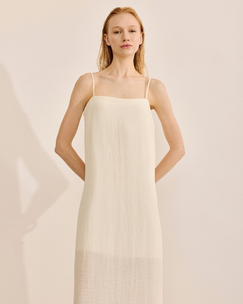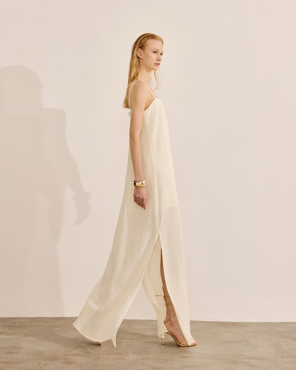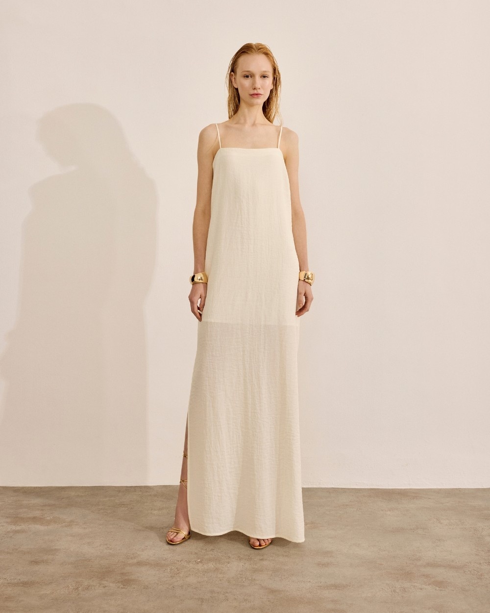 Vestido longo confeccionado em viscose com poliamida, de modelagem fluida e reta. Possui decote reto, alças finas reguláveis e fendas laterais que proporcionam leveza e movimento ao visual. Conta com zíper invisível nas costas e forro em 100% viscose, garantindo conforto e caimento perfeito. 74% viscose 26% poliamida.