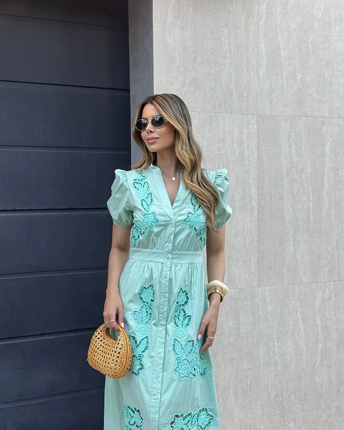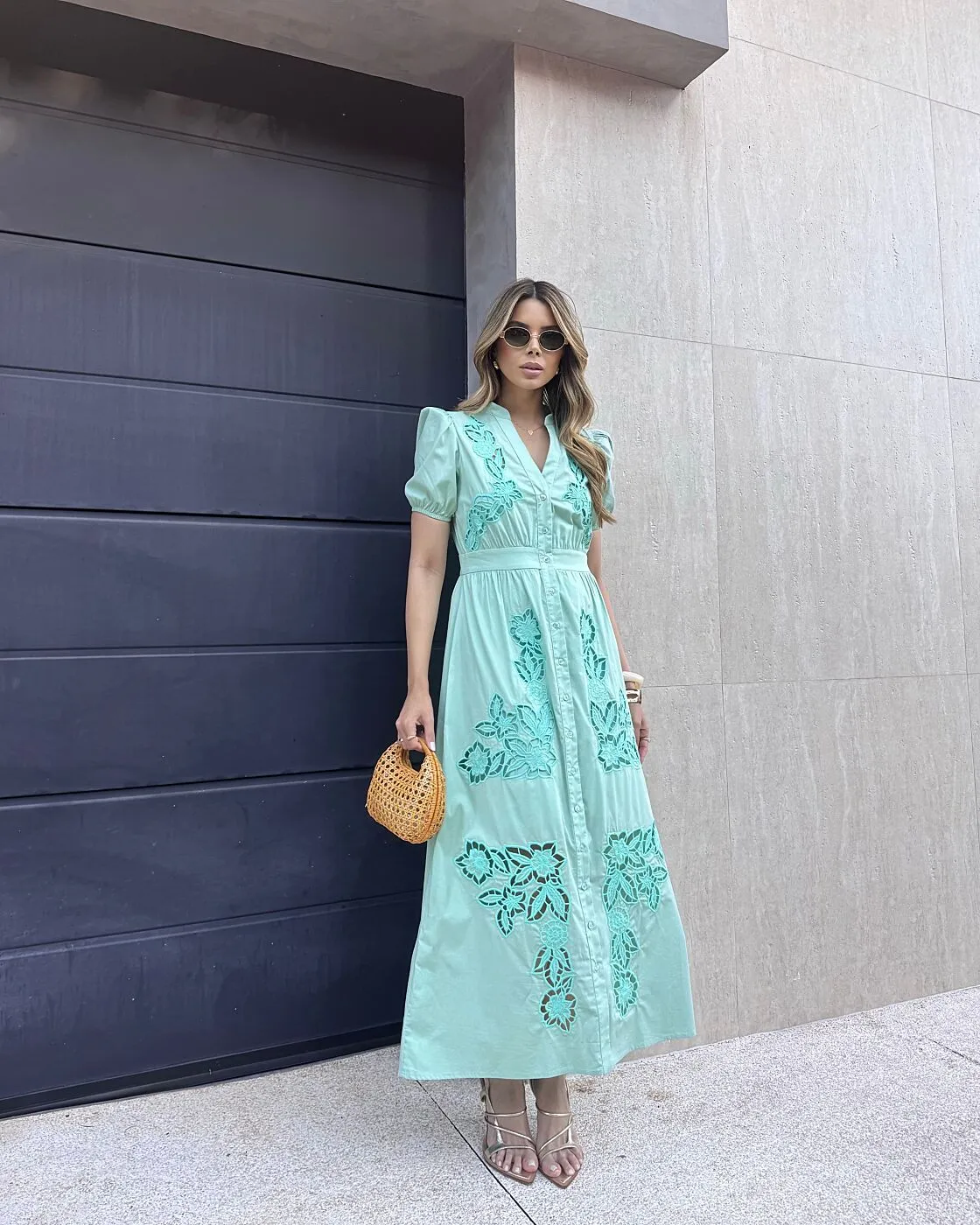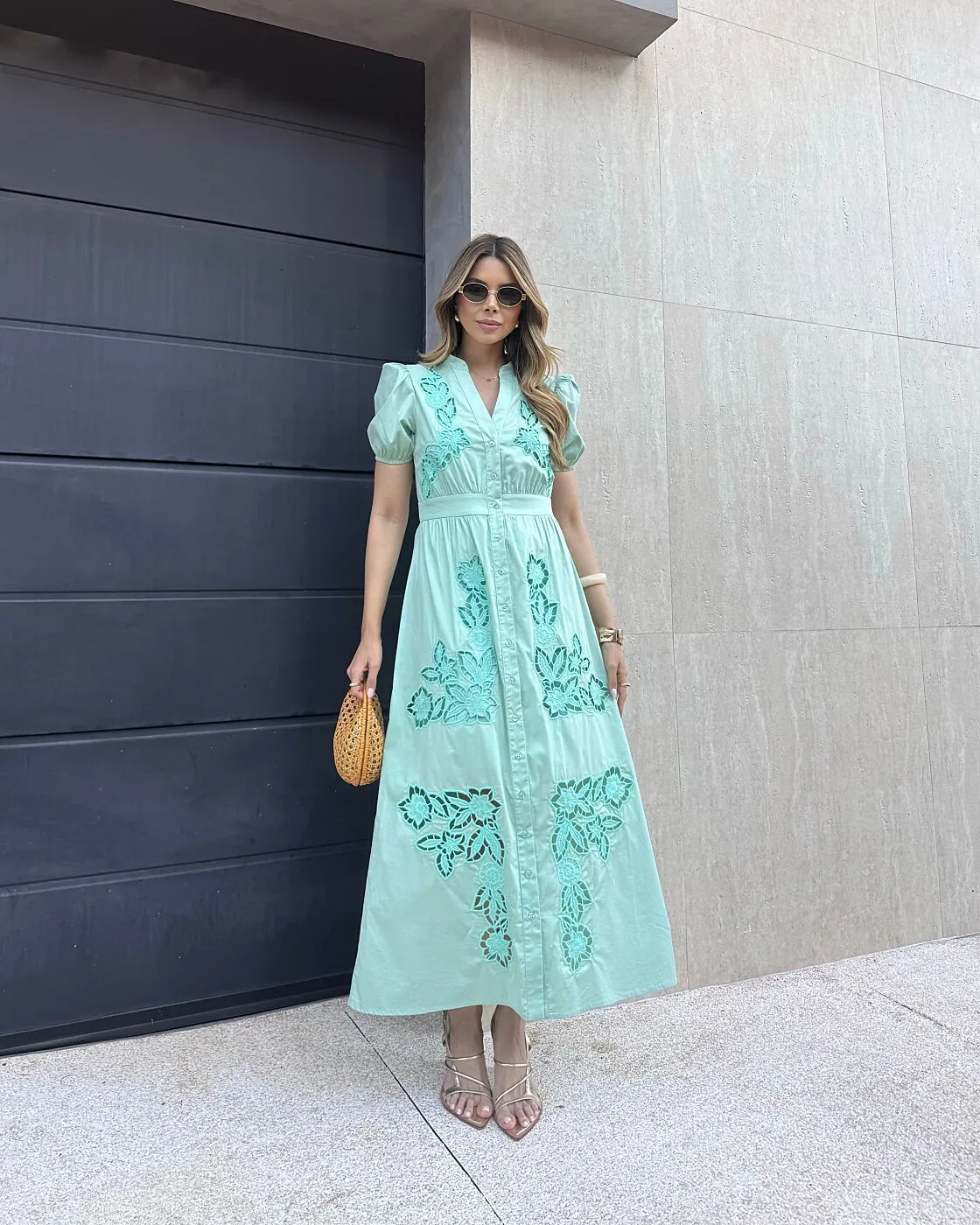 Ficha técnica: confeccionado em tecido leve de toque macio, possui bordado aplicado que valoriza o acabamento da peça, não possui forro, modelagem chemise maxi com fechamento frontal por botões, mangas confortáveis e caimento fluido, cor verde suave, peça de origem nacional, recomenda-se lavar à mão ou em ciclo delicado, não usar alvejante, não torcer e secar à sombra para preservar o bordado e a durabilidade do vestido maxi bordado.