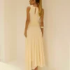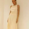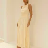 Vestido midi em chiffon. Cava americana com decote franzido. Pala drapeada na cintura. Possui forro.