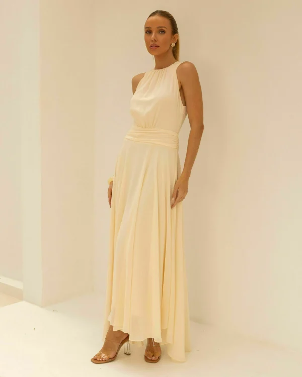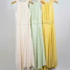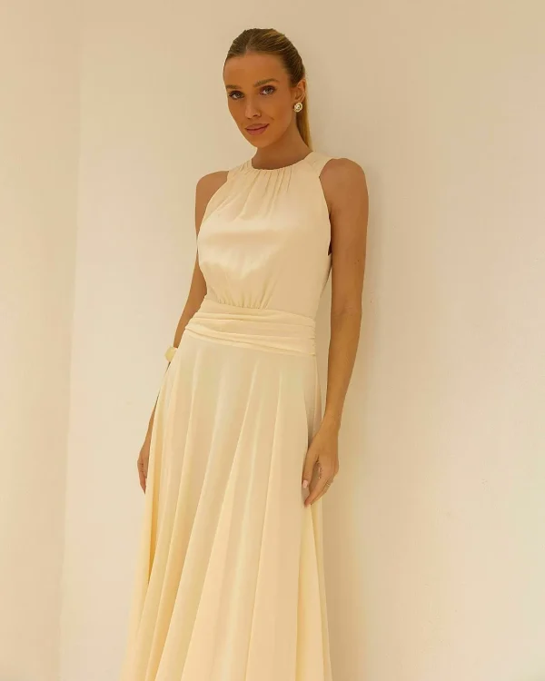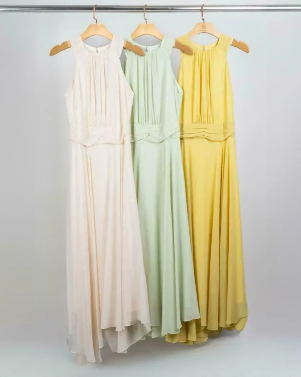 Um vestido que é sinônimo de fluidez e sofisticação. O chiffon leve cria movimento elegante em cada passo, enquanto a cava americana com decote franzido valoriza o colo de forma delicada e atemporal. A pala drapeada na cintura é o detalhe que traz equilíbrio à silhueta, afinando a cintura e destacando a feminilidade com sutileza. O forro garante conforto e segurança no vestir, sem perder a transparência leve do tecido.
