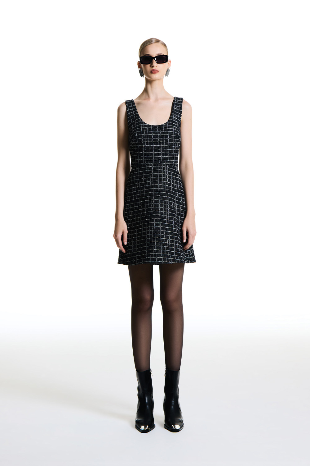Ficha técnica: vestido curto feminino confeccionado em tecido encorpado de alfaiataria com padronagem clássica, sem forro, modelagem ajustada com saia levemente evasê, decote arredondado e alças médias, cor escura com desenho discreto, origem nacional, cuidados de lavagem recomendados a seco ou lavagem delicada conforme instruções da etiqueta. 🧺✨
