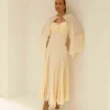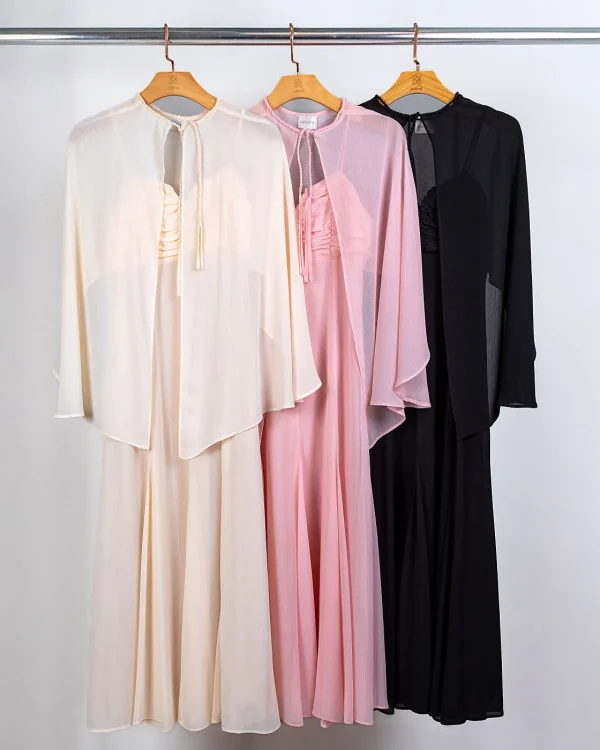 ✨ Dica de uso: para um look mais imponente, use a capa com brincos alongados e sandálias de salto fino. Para uma versão mais leve, retire a capa e combine com sandálias metalizadas rasteiras e clutch delicada — a produção ganha frescor sem perder a elegância.