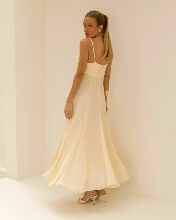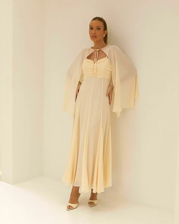 Um vestido que traduz romantismo em cada detalhe. O busto drapeado com alcinhas finas reguláveis valoriza o colo de maneira delicada, trazendo feminilidade imediata. A fluidez do chiffon yorio confere movimento leve, enquanto a capa removível adiciona sofisticação e um efeito impactante, perfeito para ocasiões especiais. Uma peça versátil, que pode ser usada com ou sem a capa, adaptando-se a diferentes estilos e momentos.