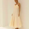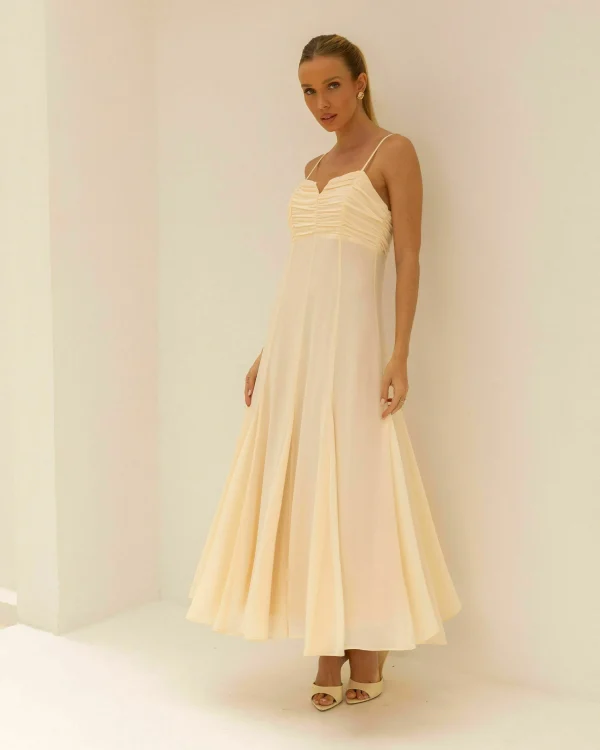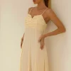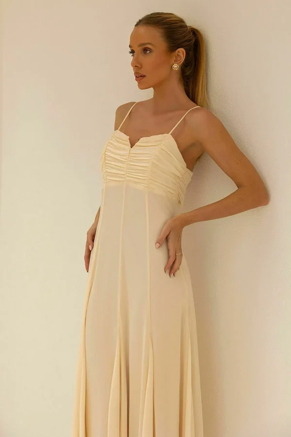 Vestido midi em chiffon yorio. Alcinhas reguláveis. Busto drapeado. Acompanha capa removível. Possui forro.