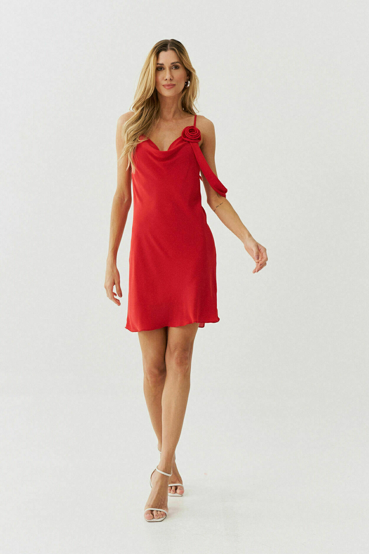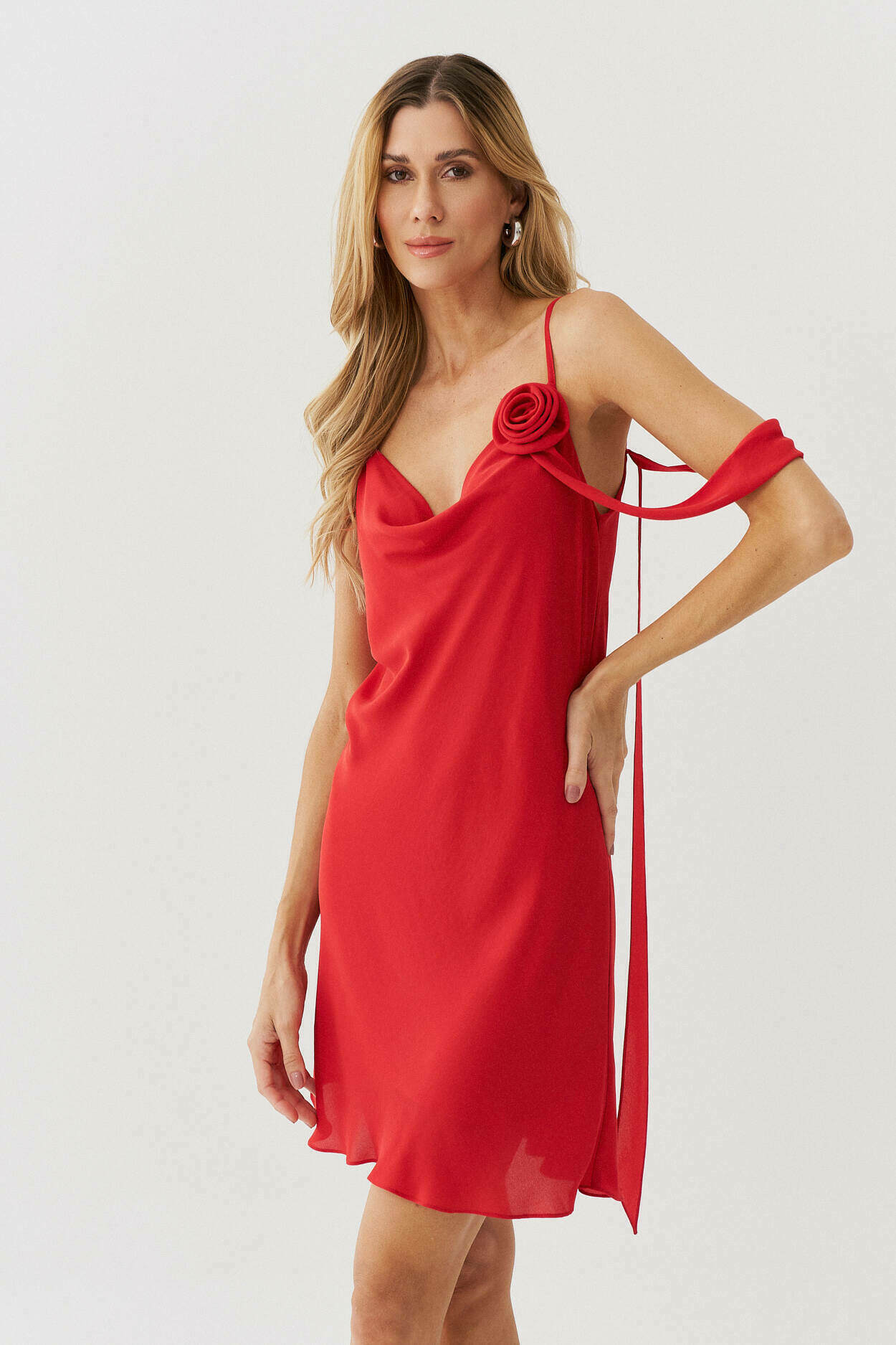 Composição: 100% poliéster. Modelagem: curta, decote degagê, alças finas, aplicação de flor em tecido com detalhe de amarração em um dos ombros. Cor: vermelho. Origem: nacional 🇧🇷. Cuidados: lavar à mão com sabão neutro, secar à sombra e passar do avesso em temperatura baixa.