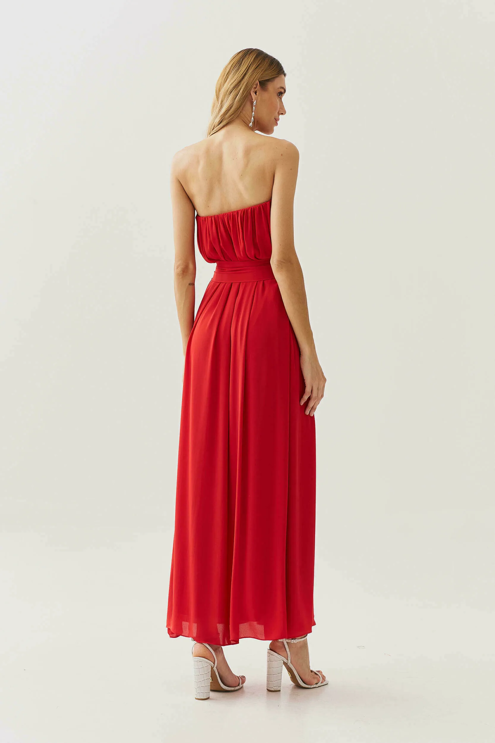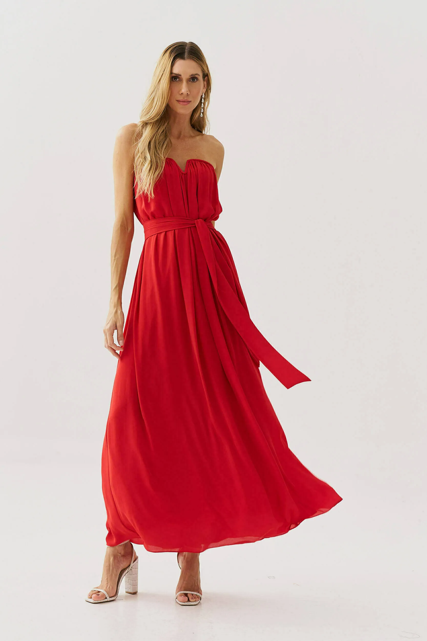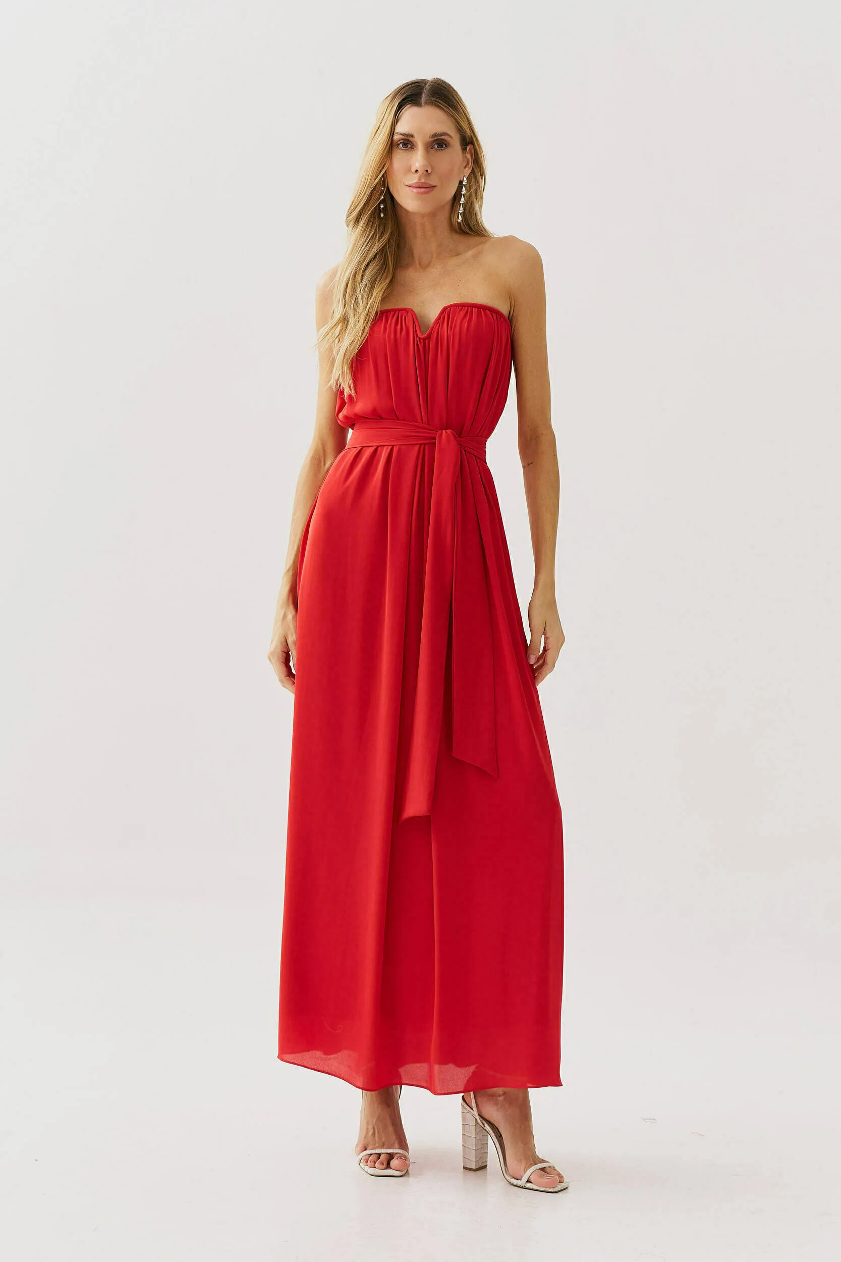 Composição: 100% poliéster | Forro: 100% poliéster. Modelagem: longa, tomara que caia, decote com detalhe e faixa para amarração na cintura. Cor: verde esmeralda. Origem: nacional 🇧🇷. Cuidados: lavar à mão com sabão neutro, secar à sombra e passar do avesso em temperatura baixa.