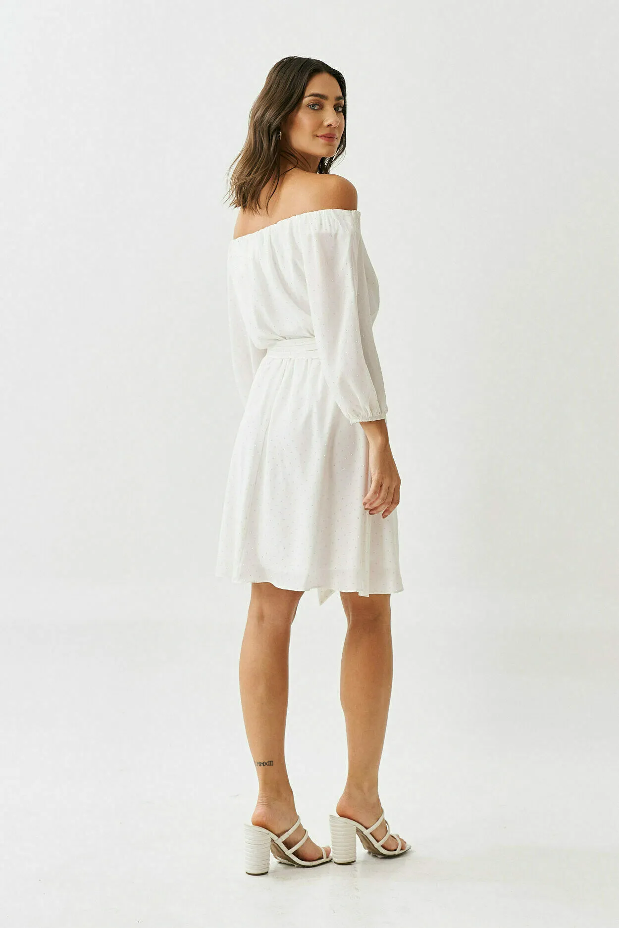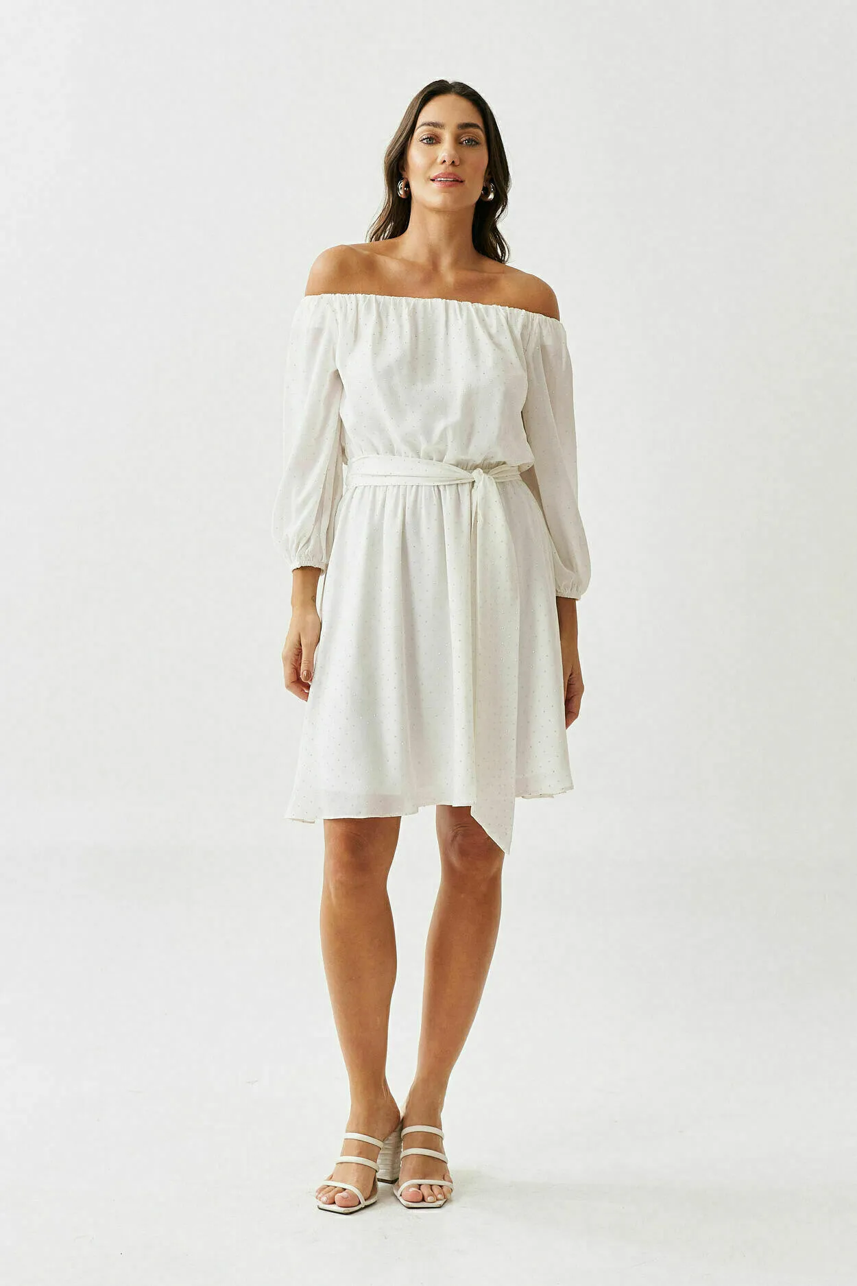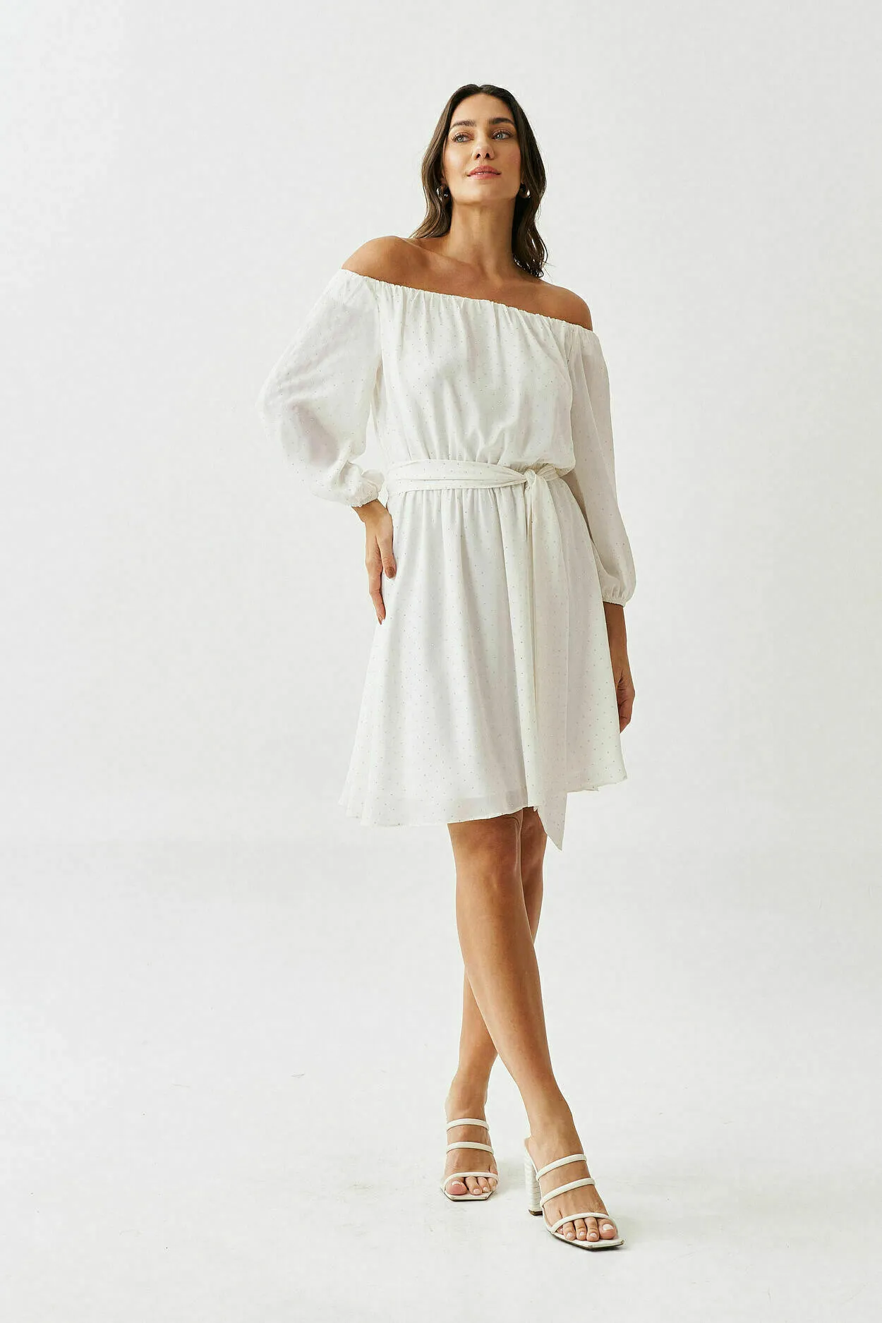 Composição: 100% poliéster | Forro: 100% poliéster. Modelagem: curta, decote ombro a ombro com elástico, manga longa com punho, elástico interno na cintura e faixa para amarração. Cor: off-white. Origem: nacional 🇧🇷. Cuidados: lavar à mão com sabão neutro, secar à sombra e passar do avesso em temperatura baixa.