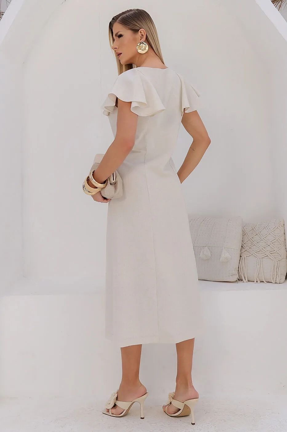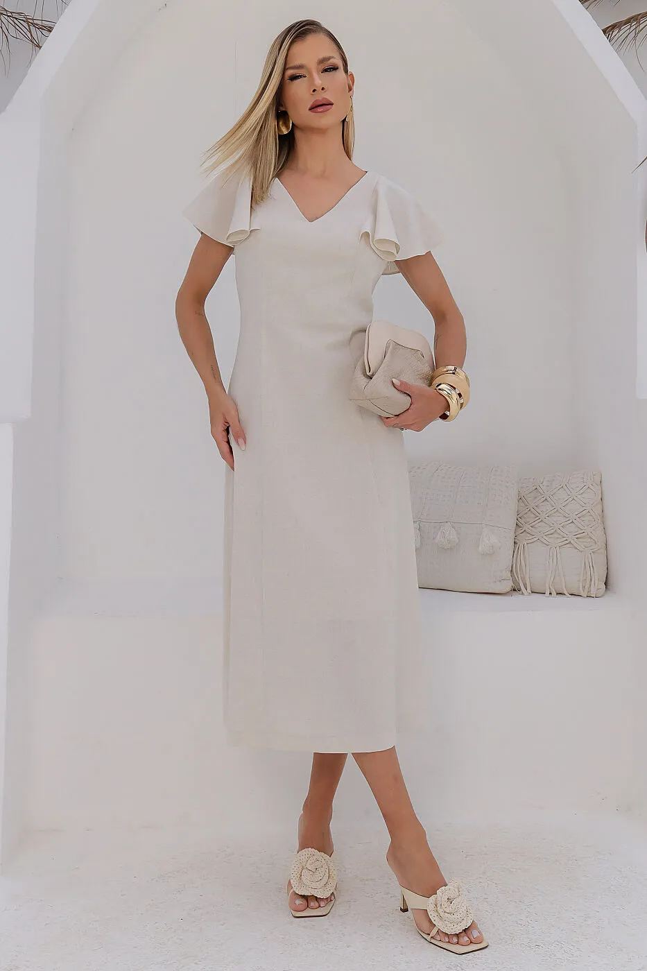 Ficha técnica: vestido feminino midi confeccionado em Linho Eco Washed, linho misto com toque rústico e sem elastano no tecido principal, composto por 39% poliéster, 36% viscose e 25% linho, com forro em 95% poliéster e 5% elastano, garantindo conforto ao vestir. Possui recortes frontais e nas costas, decote em V e babados estruturados que simulam mangas, valorizando a silhueta com elegância. Peça de origem nacional. Recomenda-se lavagem à mão ou em ciclo delicado, não torcer, secar à sombra e passar em temperatura média.