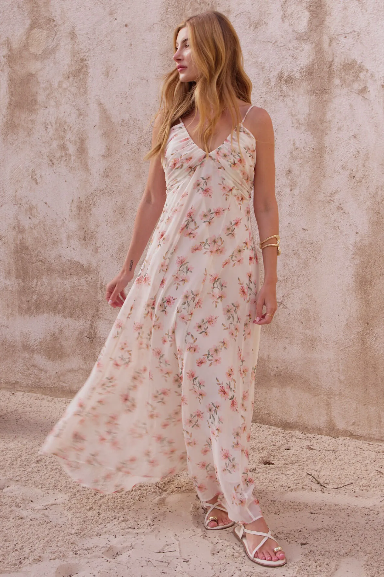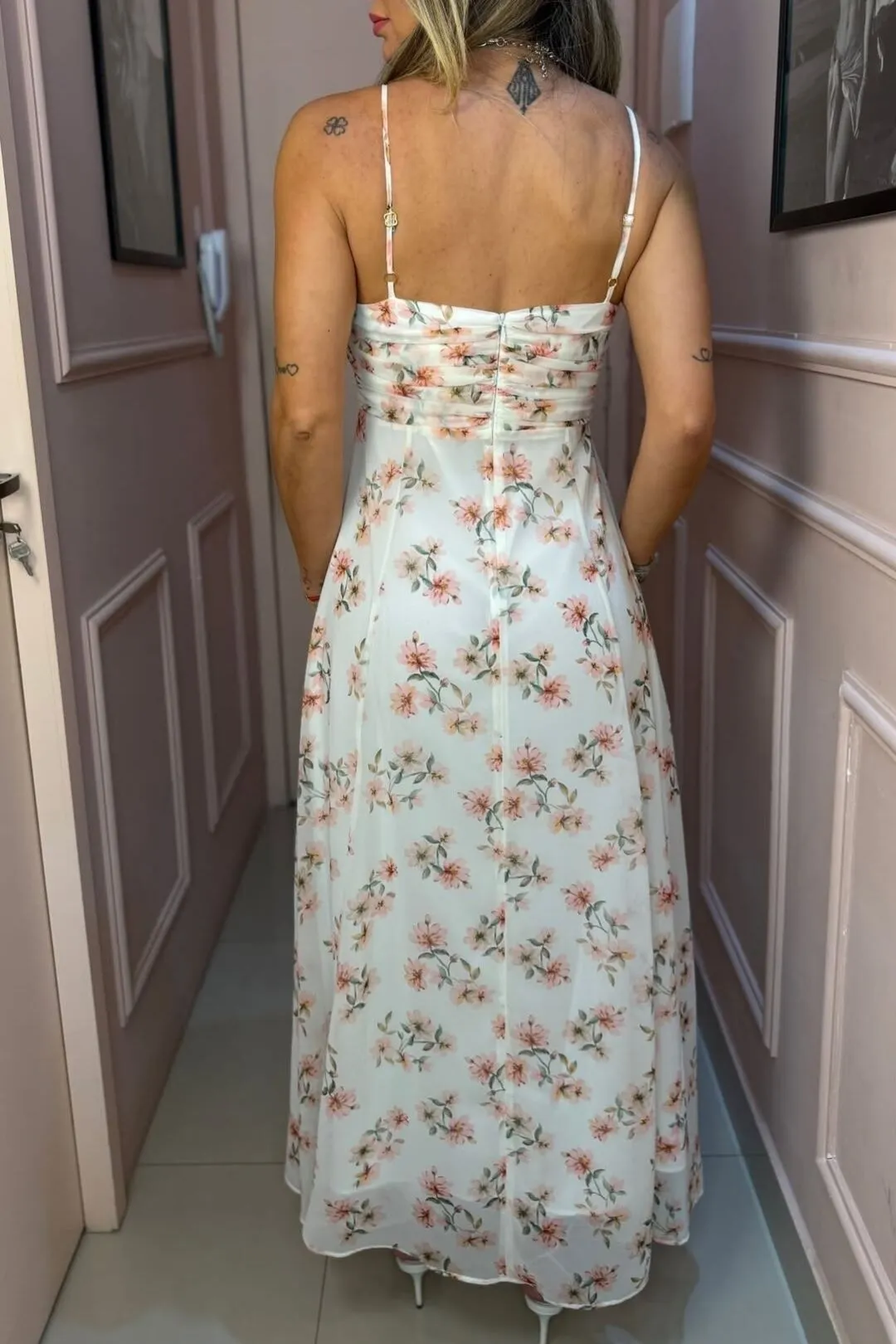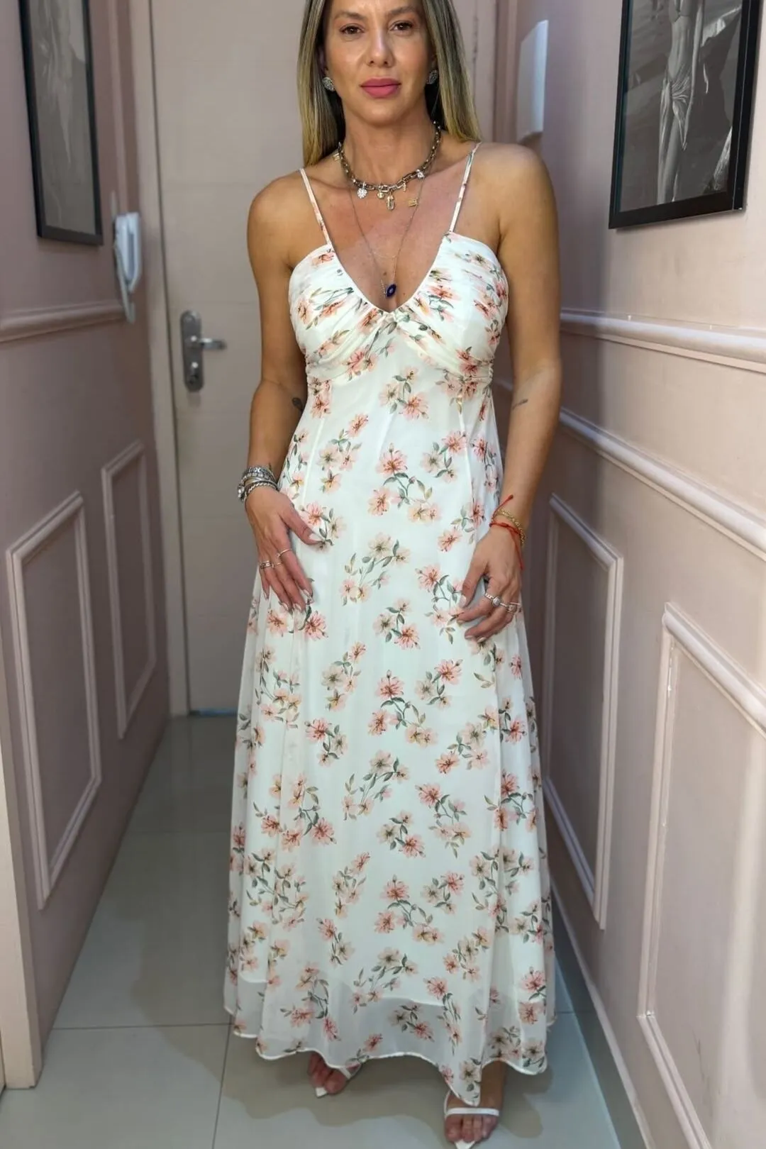 Raquel chiffon Est. – Tecido de chiffon floral – Vestido longo em chiffon forrado, com estampa floral suave e toque delicado. O busto levemente drapeado valoriza o decote, enquanto as alças finas com reguladores garantem ajuste perfeito ao corpo