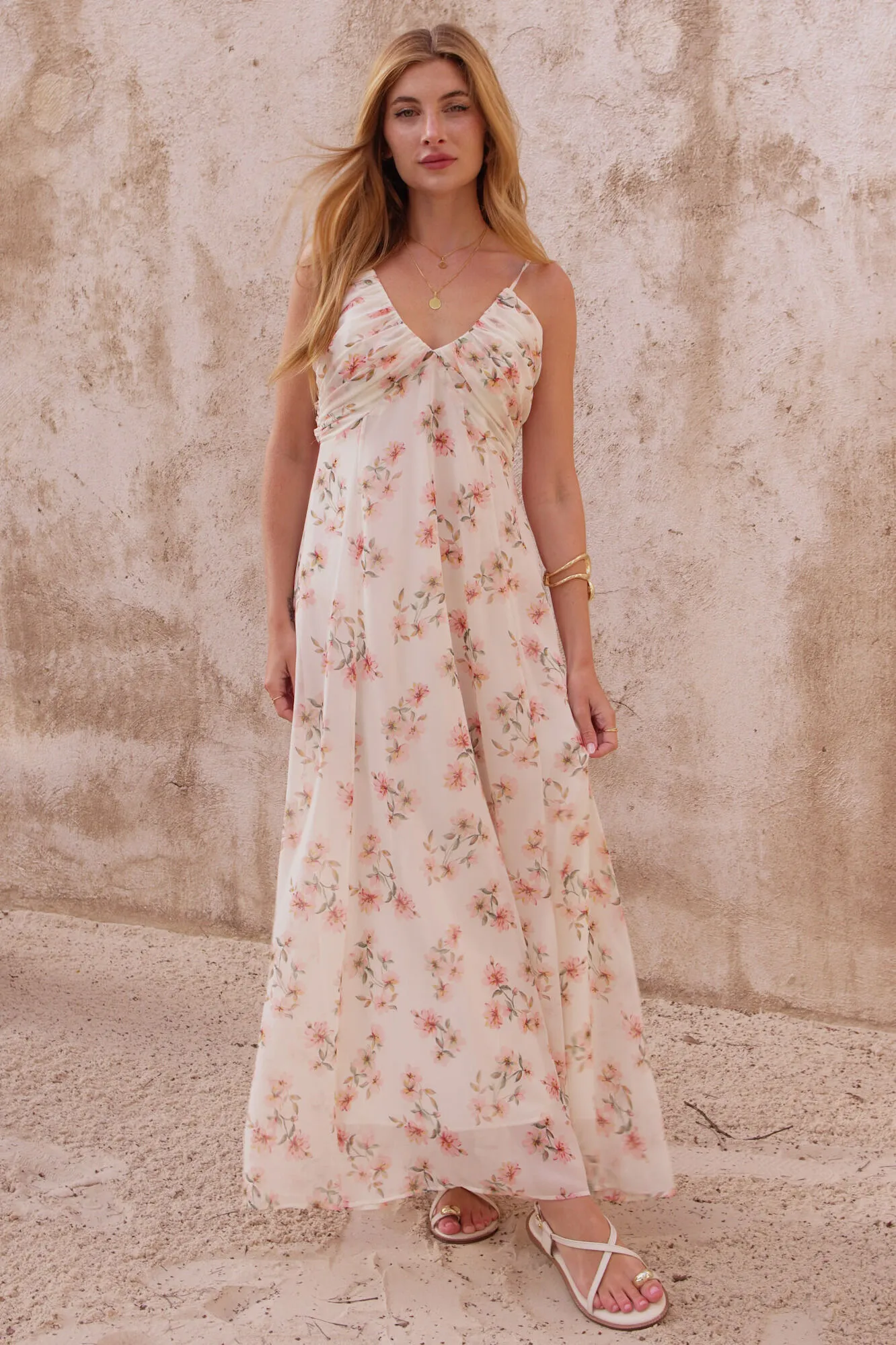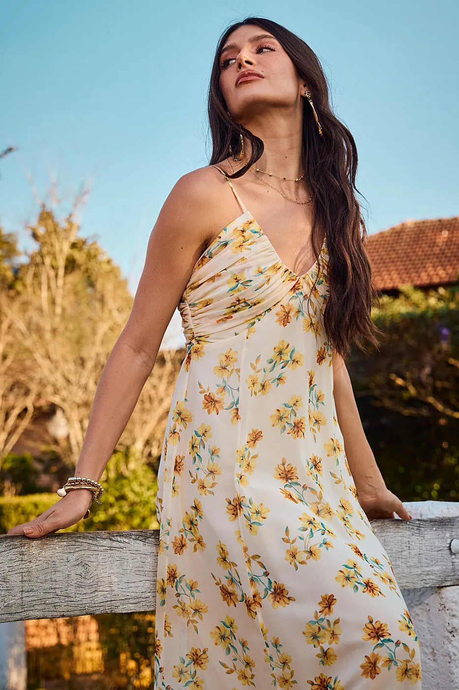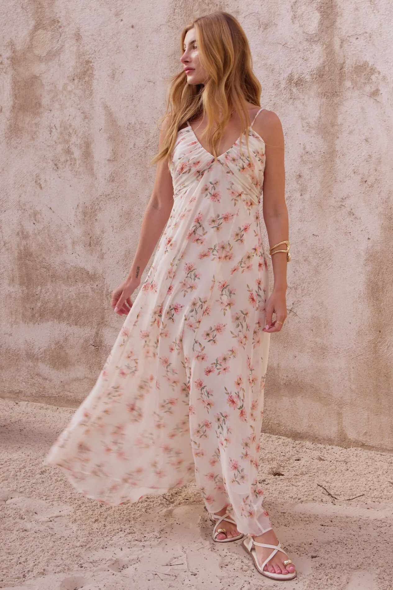 Raquel chiffon Est. – Tecido de chiffon floral – Vestido longo em chiffon forrado, com estampa floral suave e toque delicado. O busto levemente drapeado valoriza o decote, enquanto as alças finas com reguladores garantem ajuste perfeito ao corpo