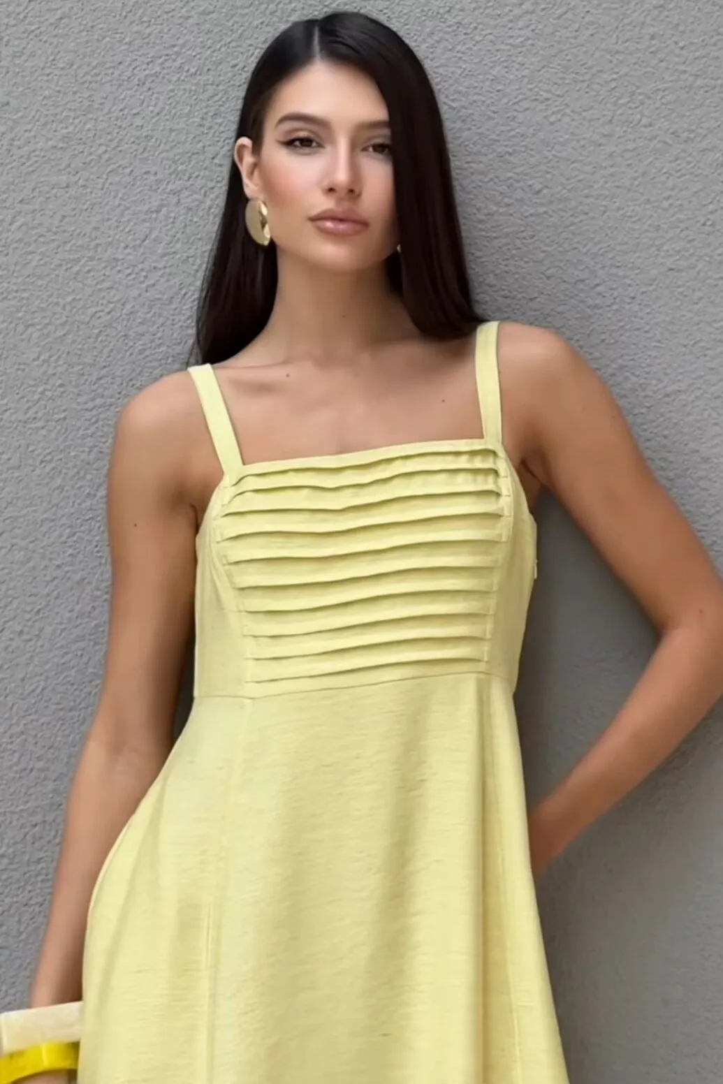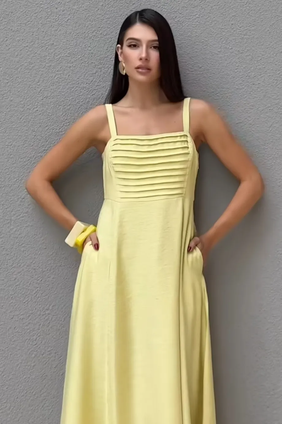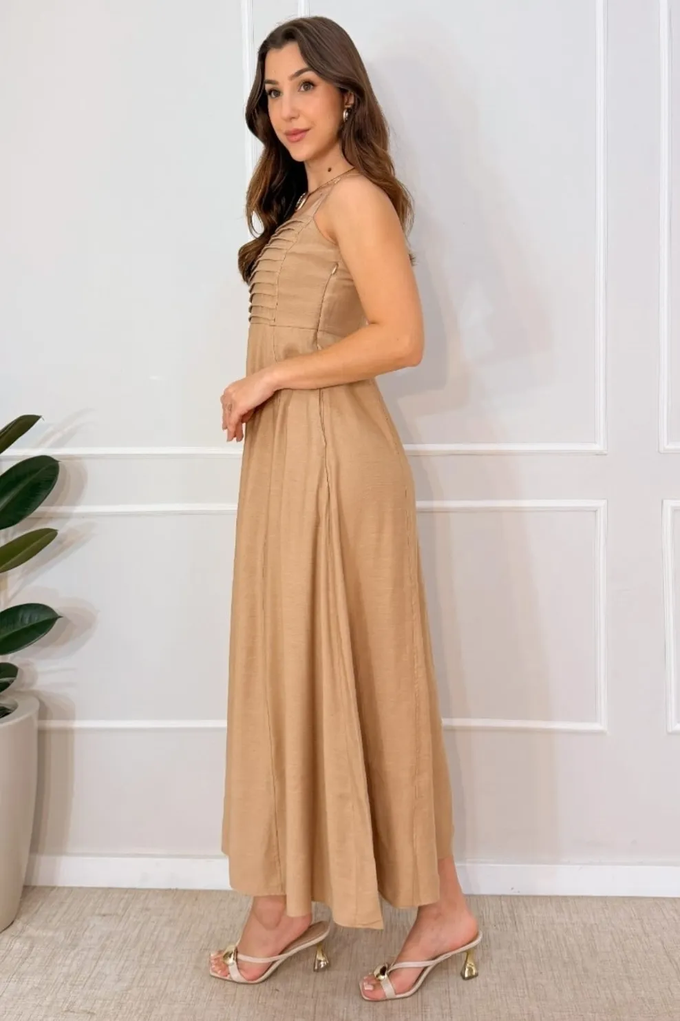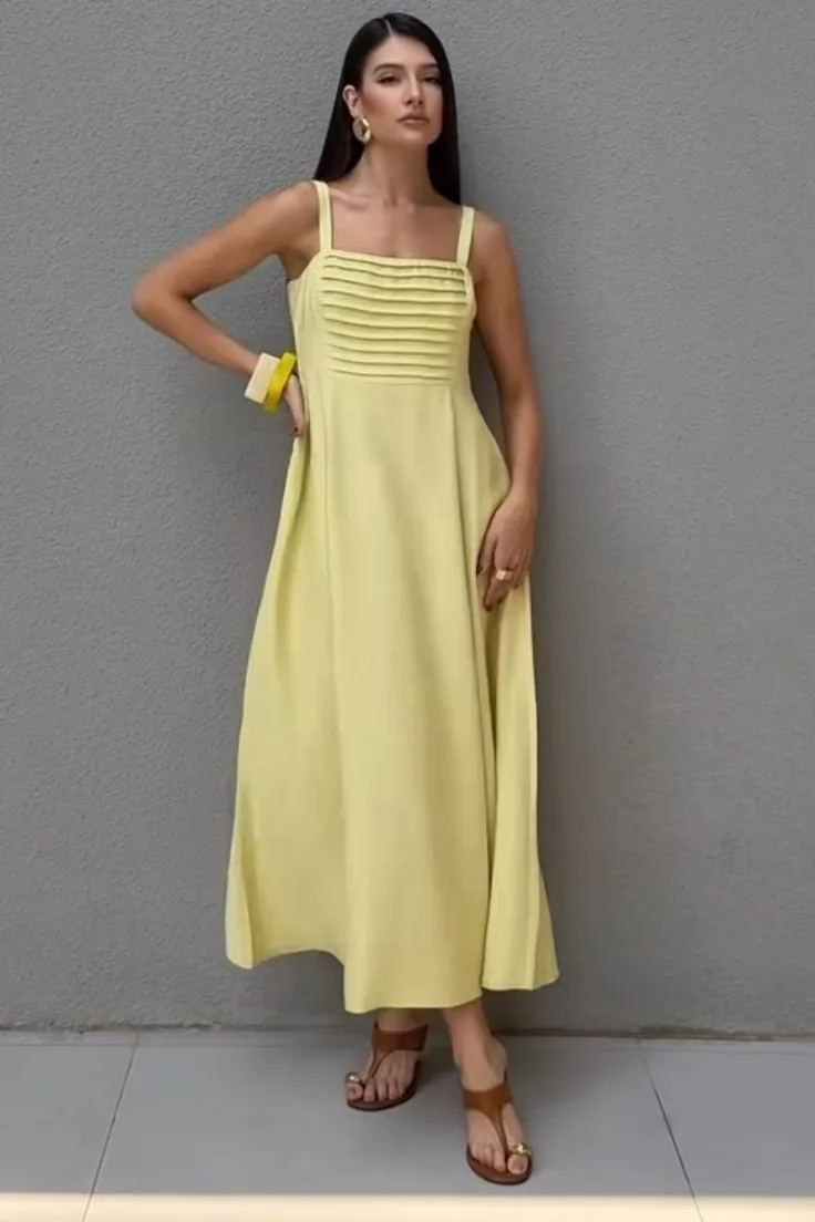 Linen Twill Bruxelas – Tecido com leve textura e de toque macio – Vestido longo de alças largas com reguladores, que proporcionam melhor ajuste ao corpo. O busto apresenta detalhe de pregas e recortes frontais que criam uma composição delicada