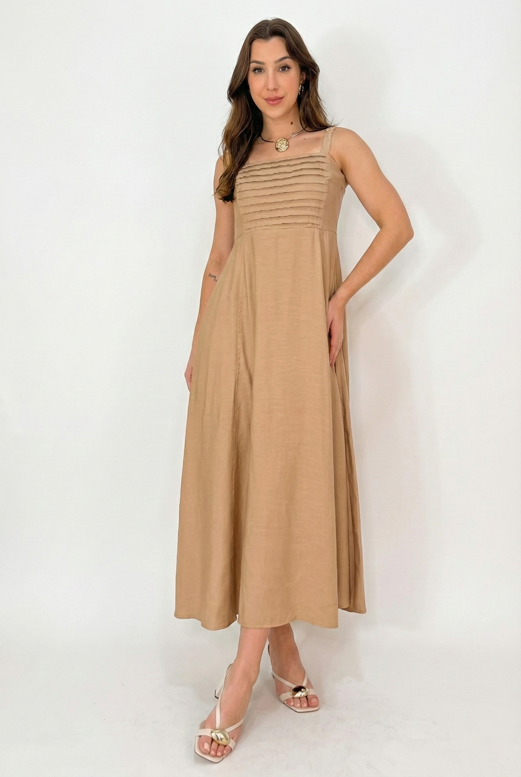 💡 Como dica de estilo, use o vestido com pregas com sandálias delicadas e acessórios dourados para um visual elegante e feminino, ou combine com rasteiras sofisticadas e bolsa estruturada para uma proposta leve e refinada durante o dia.