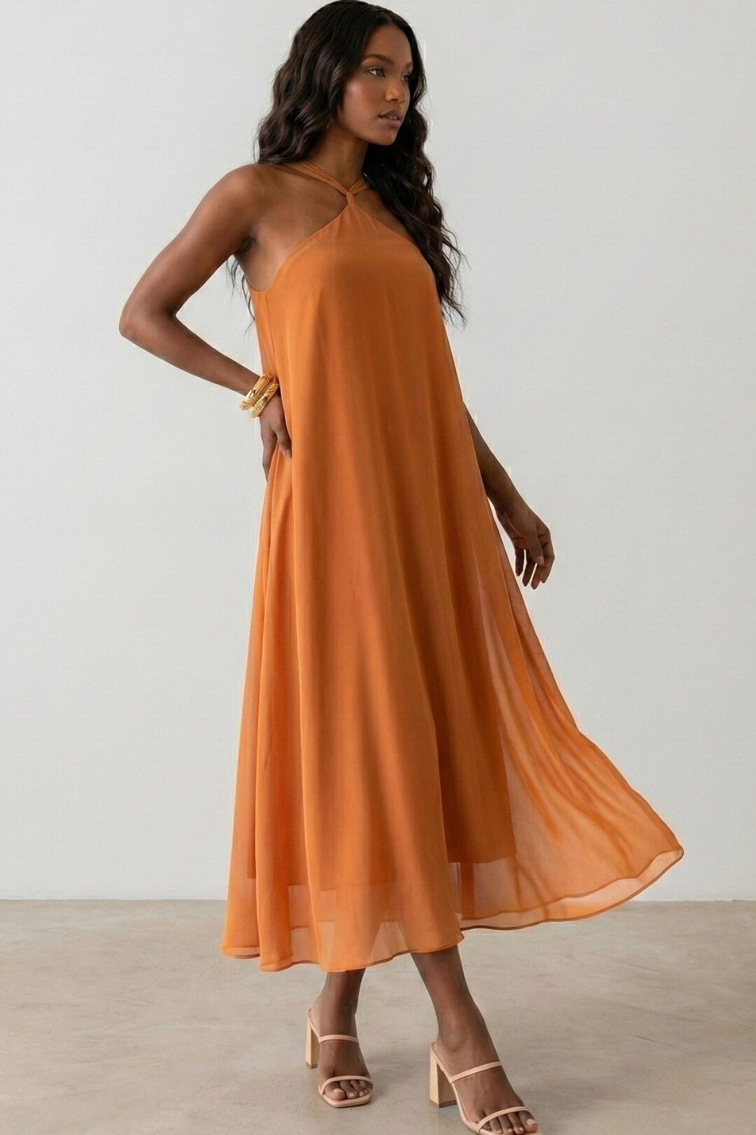 O grande destaque fica por conta do decote frente única, que valoriza o colo com sofisticação, enquanto as longas tiras que formam as alças criam um efeito de amarração delicado nas costas, adicionando um toque especial e feminino ao design. Totalmente forrado, o vestido oferece segurança e conforto ao vestir, mantendo a leveza do chiffon sem transparências indesejadas. Em um tom claro e elegante, é uma peça perfeita para eventos diurnos, casamentos ao ar livre, jantares especiais ou ocasiões em que você deseja um visual clean, chic e inesquecível ✨.