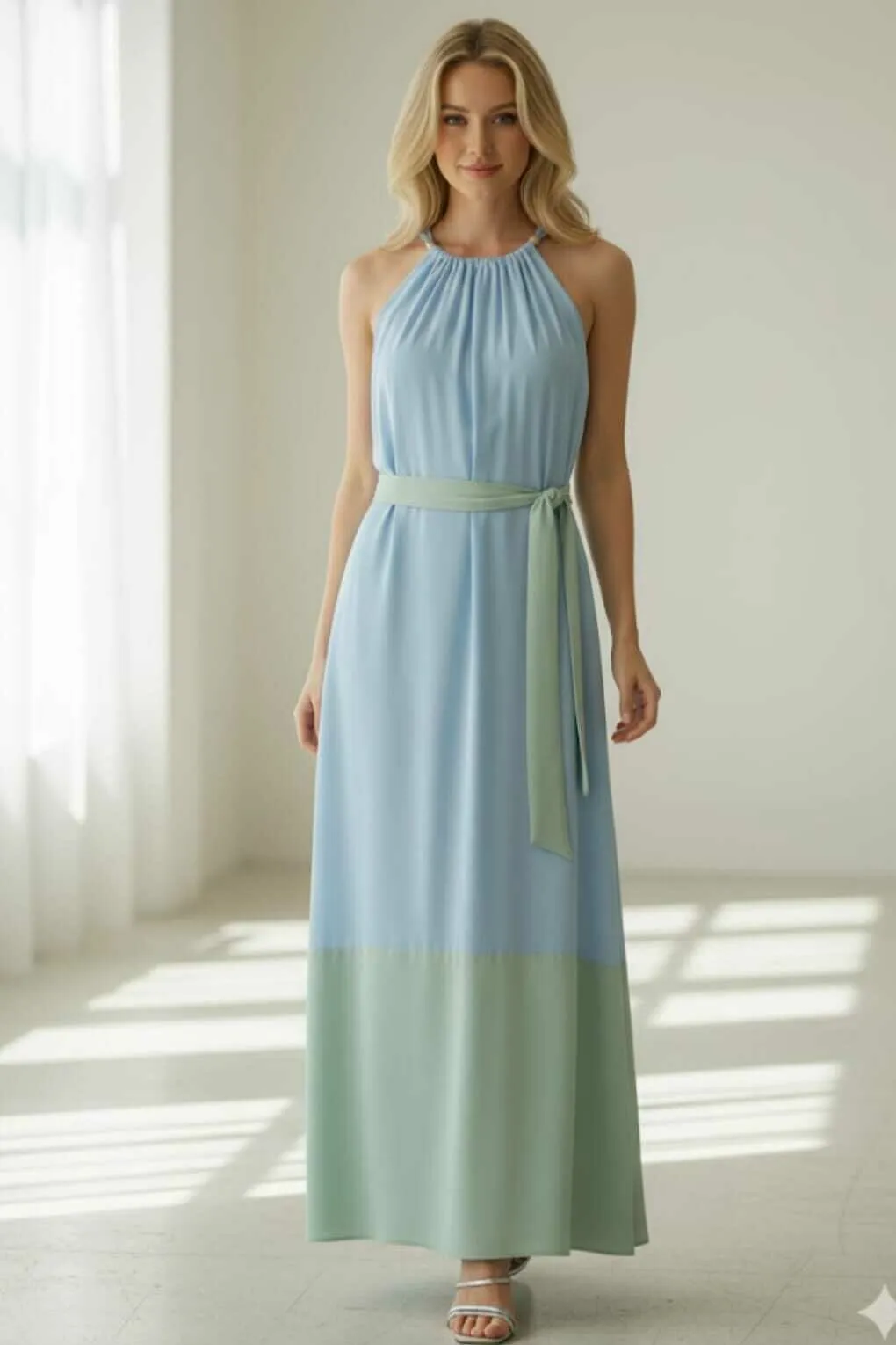 Dica de estilo 💡: use esse vestido longo feminino bicolor com sandálias de salto médio ou rasteiras sofisticadas para o dia; à noite, aposte em acessórios dourados e uma clutch estruturada para elevar a produção.