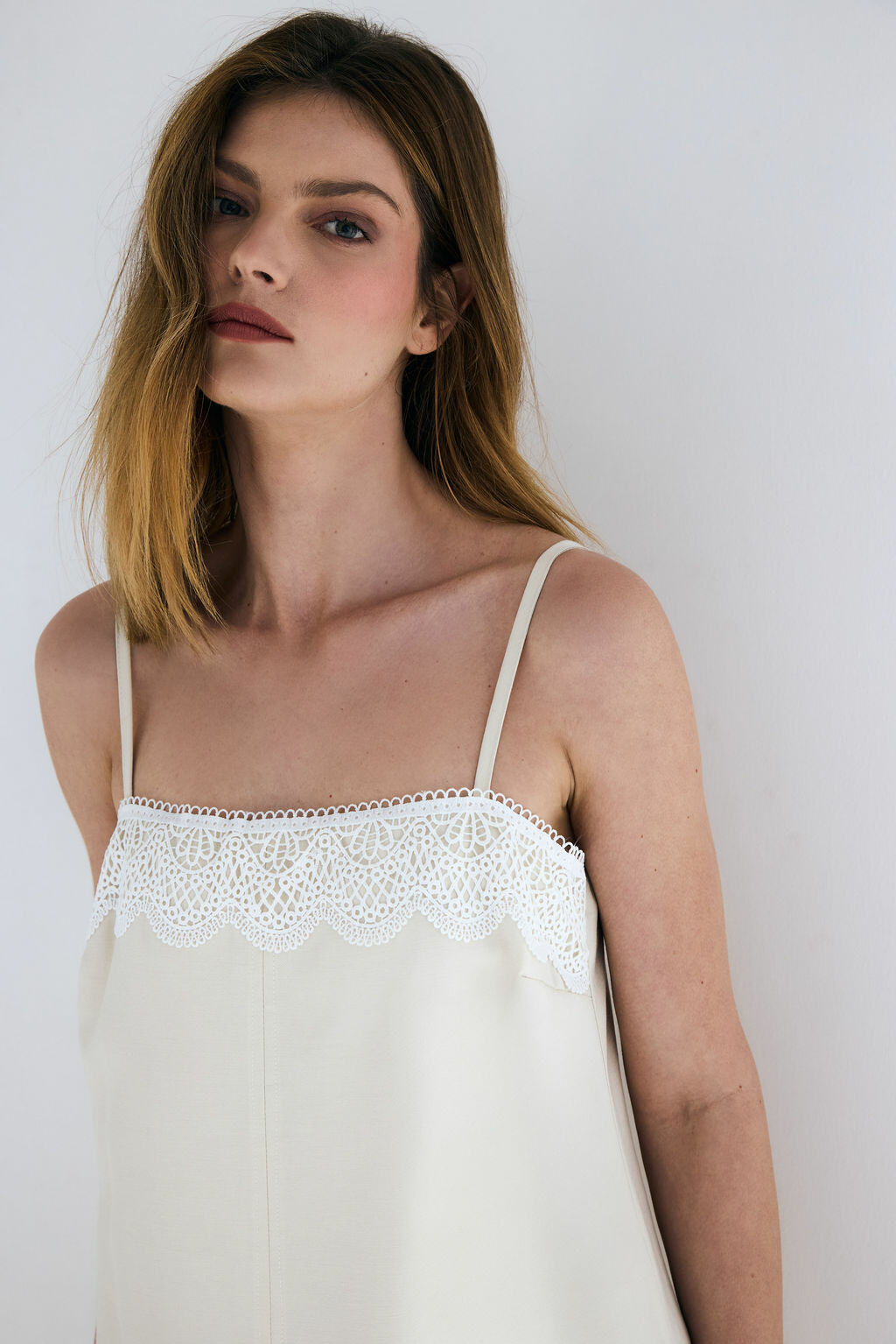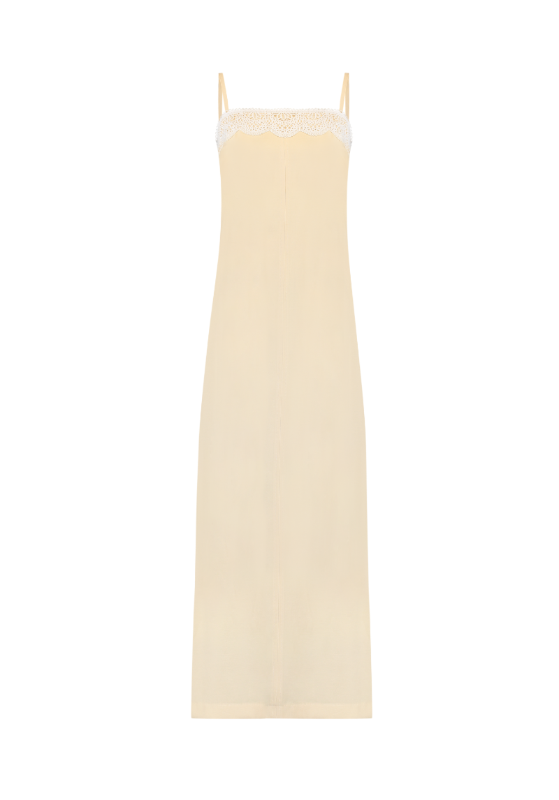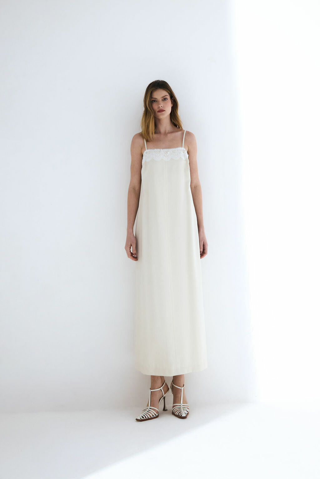 Ficha técnica: vestido midi confeccionado em viscose mista, com composição de 90% viscose e fibras complementares conforme especificação do fabricante, alças finas reguláveis, modelagem reta, detalhe de renda aplicada no decote, sem forro, cor clara e atemporal, peça de origem nacional, com cuidados de lavagem à mão ou em ciclo delicado, secagem à sombra e passagem em temperatura baixa para preservar a renda e o caimento do tecido.