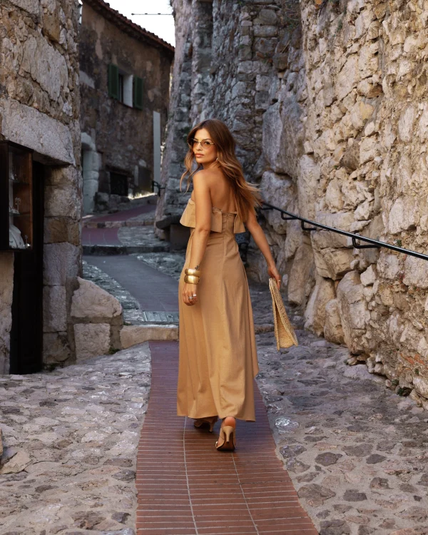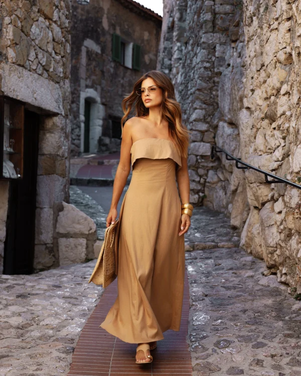 O vestido Karina é aquele tipo de peça que une sofisticação e frescor em um só olhar. Feito em viscose e linho, ele tem caimento leve e toque natural, perfeito para quem ama vestir-se bem sem abrir mão do conforto. O modelo tomara que caia valoriza os ombros e transmite feminilidade na medida certa, enquanto a silueta ampla e fluida cria movimento delicado a cada passo.