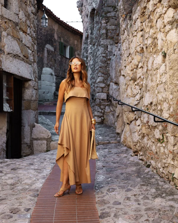 O vestido karina kaele une sofisticação e conforto em um design minimalista com babado no busto e barra assimétrica. O tecido leve acompanha o corpo sem apertar e cria balanço elegante a cada passo. Assim, a peça entrega presença imediata em jantares, eventos ao pôr do sol e viagens.