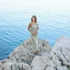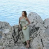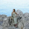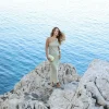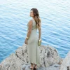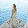 A modelagem é próxima ao corpo com queda fluida a partir do quadril, o que alonga a silhueta. Logo, escolha o tamanho habitual para um fit elegante; se preferir mais folga, considere um número acima. O comprimento maxi favorece diferentes alturas e, desse modo, rende fotos incríveis em viagens.