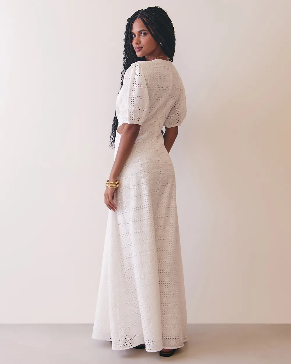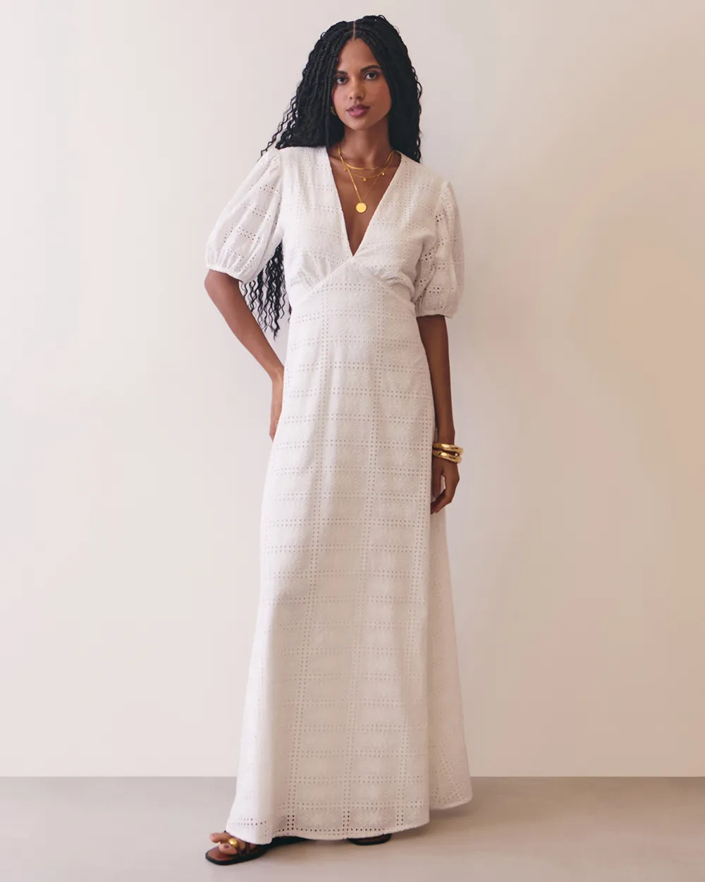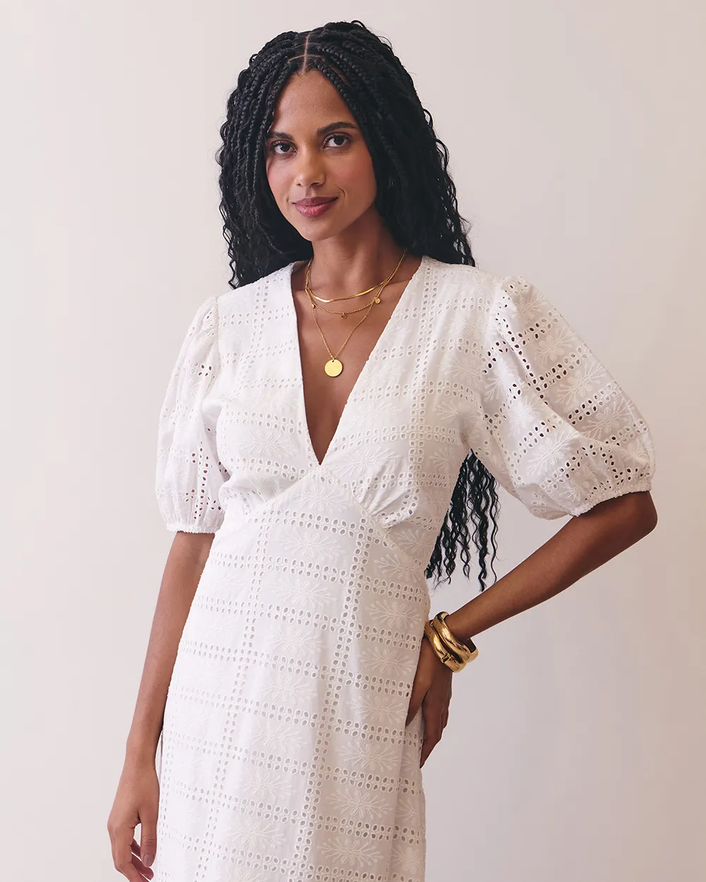 Ficha técnica: Vestido confeccionado em tecido laise, sem forro aparente, modelagem longa, decote em V, mangas amplas, textura delicada com recortes característicos da laise, cor clara, origem nacional, composição não informada pelo fabricante, com cuidados de lavagem recomendados como lavar à mão ou em ciclo delicado, não usar alvejantes e secar à sombra para preservar a delicadeza do tecido 🧺