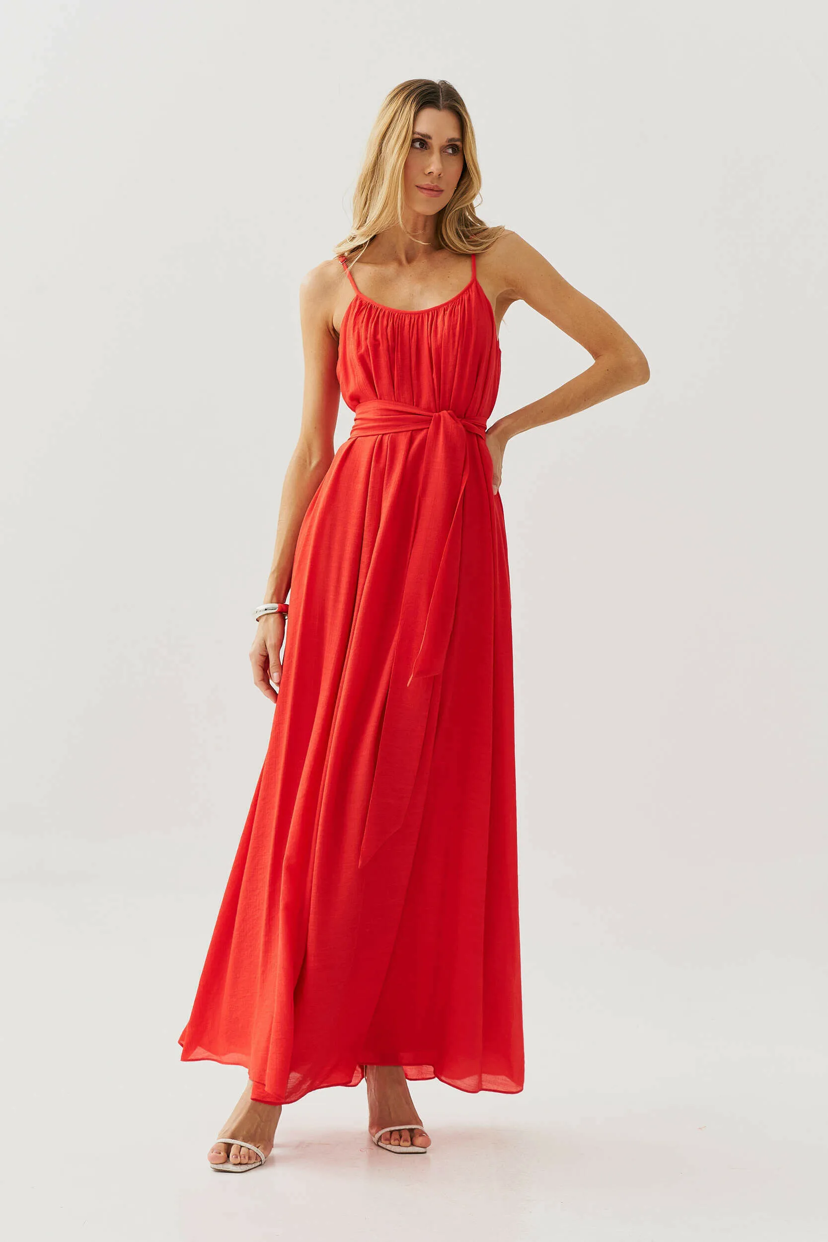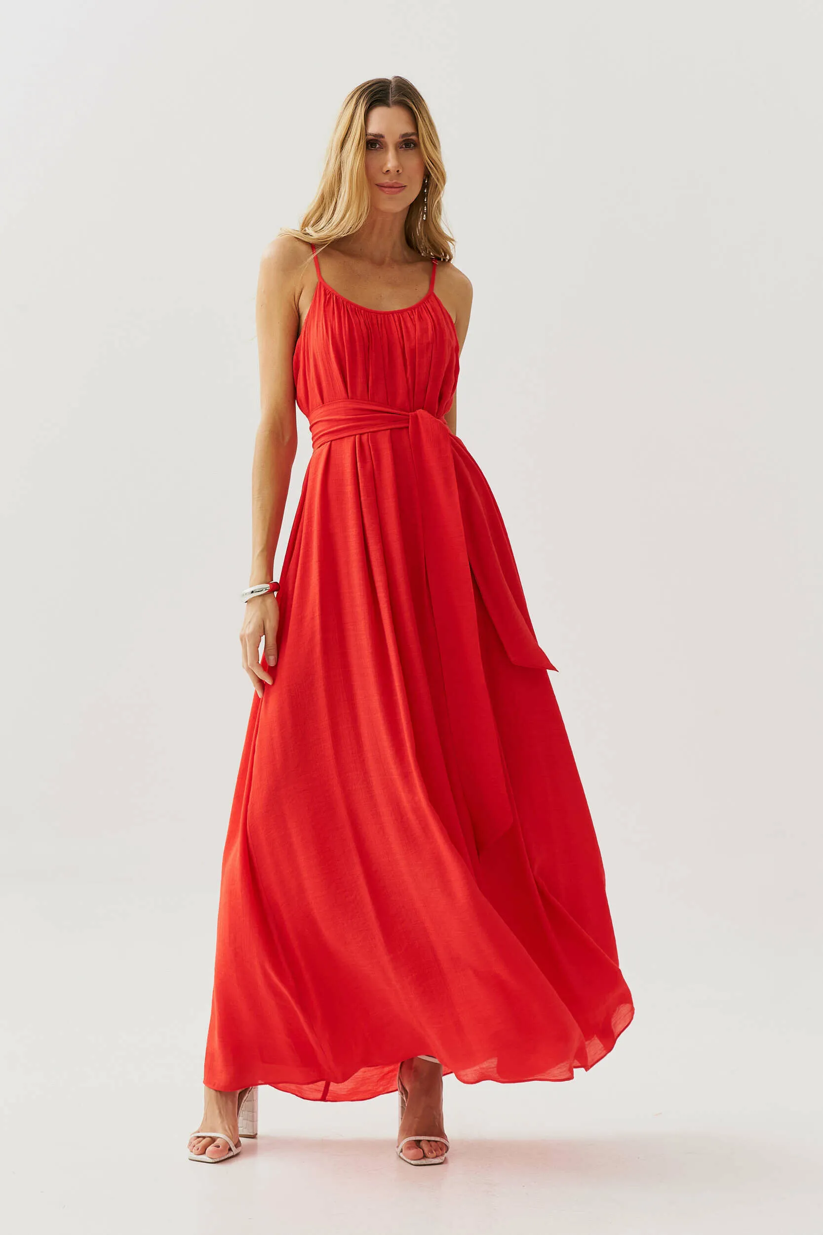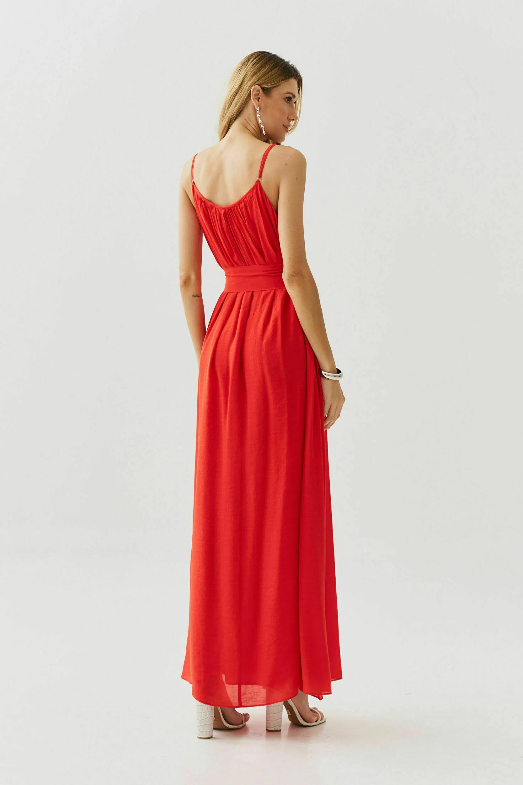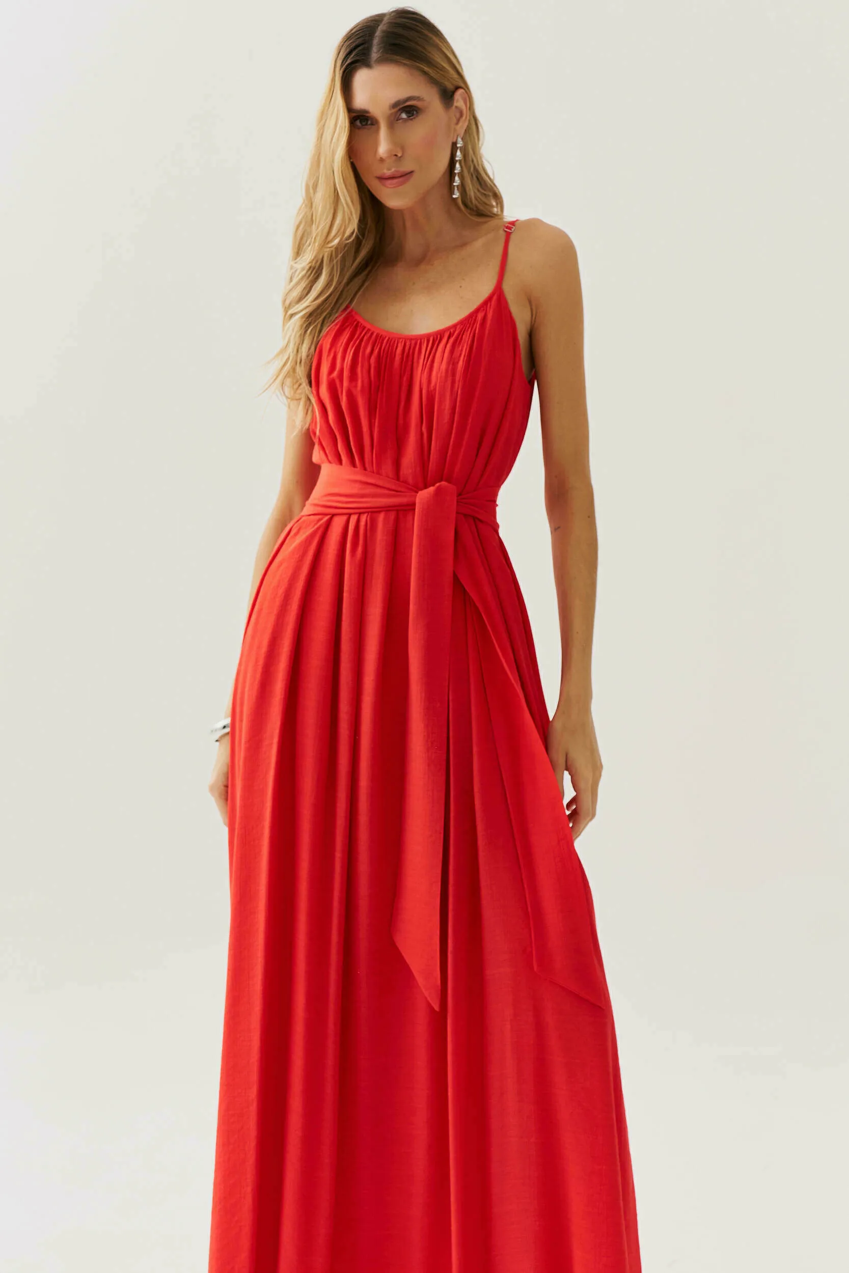 Composição: 64% viscose, 36% poliéster | Forro: 100% poliéster. Modelagem: longa e fluida, com alças finas reguláveis, decote franzido e faixa para amarração. Cor: vermelho. Origem: nacional 🇧🇷. Cuidados: lavar à mão com sabão neutro, secar à sombra e passar em temperatura baixa.