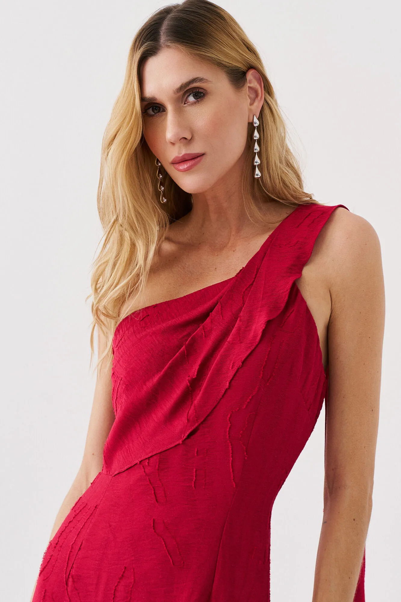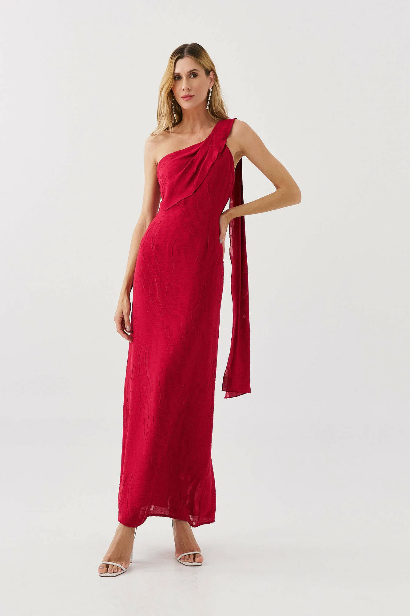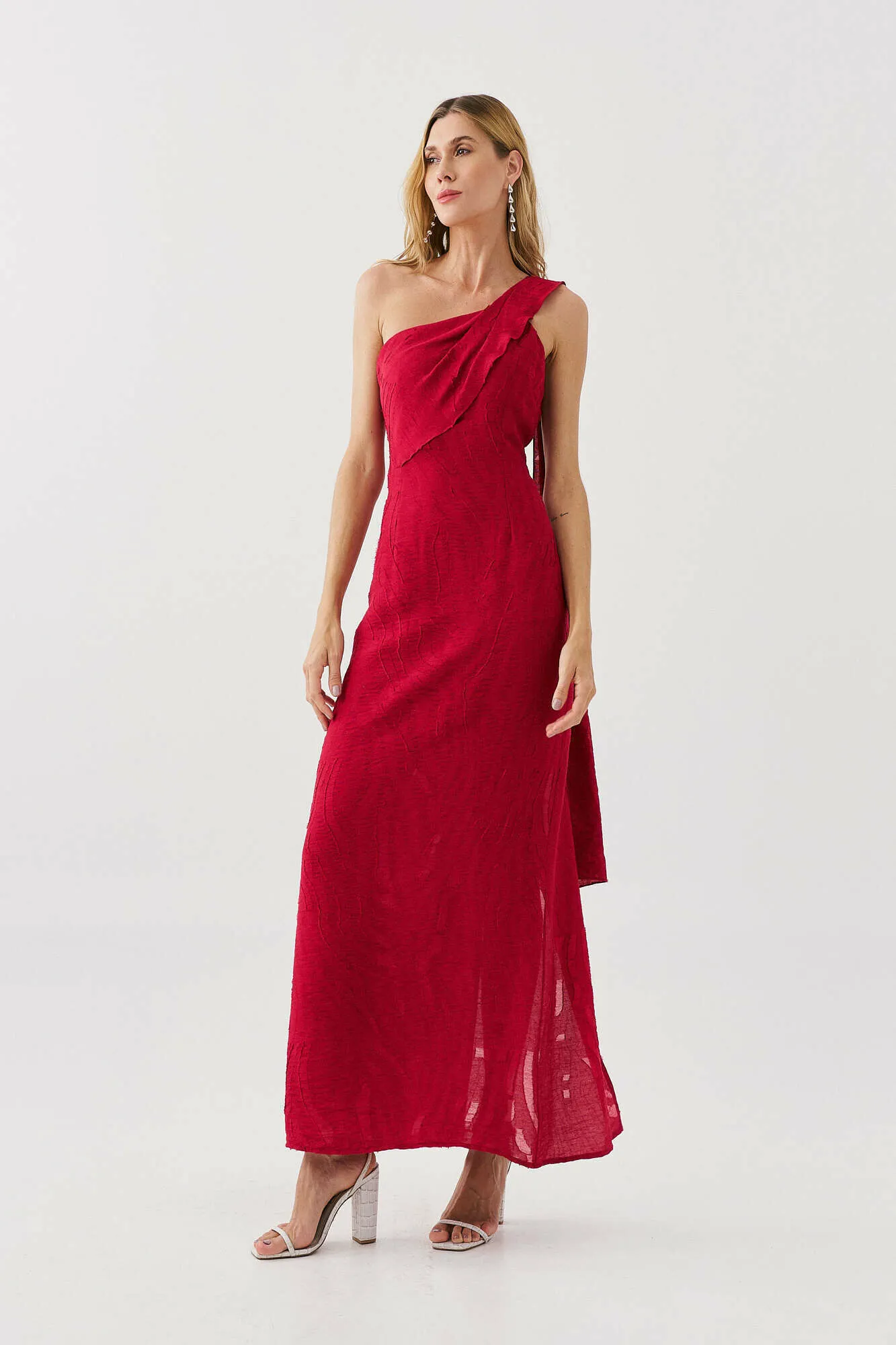 Composição: 64% viscose, 24% linho, 12% poliamida | Forro: 100% poliéster. Modelagem: longa, um ombro só com detalhe de tecido transpassado. Cor: vermelho. Origem: nacional 🇧🇷. Cuidados: lavar à mão com sabão neutro, secar à sombra e passar do avesso com ferro morno.