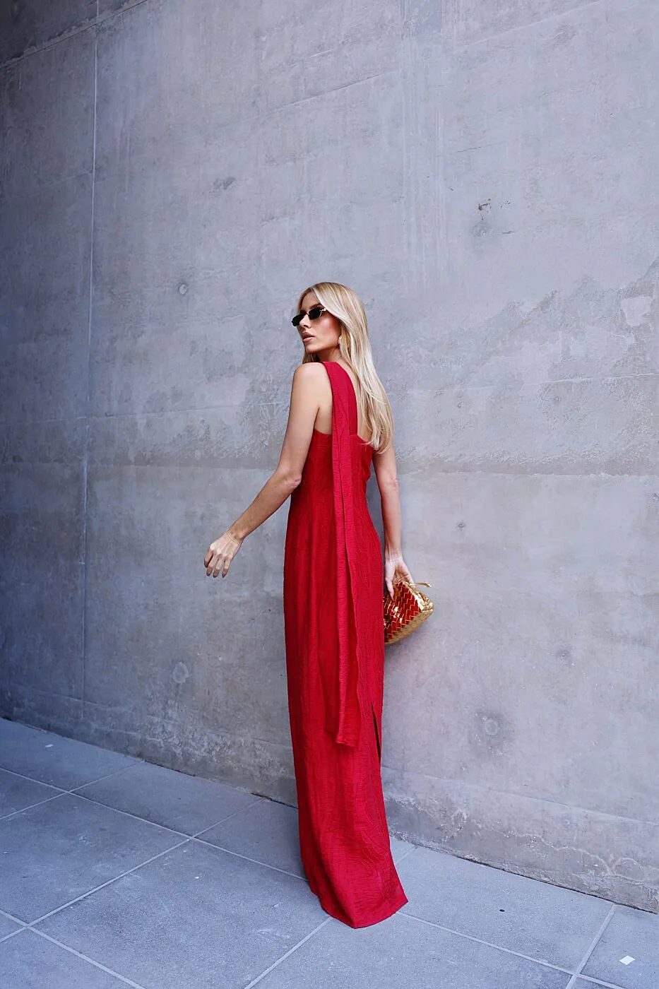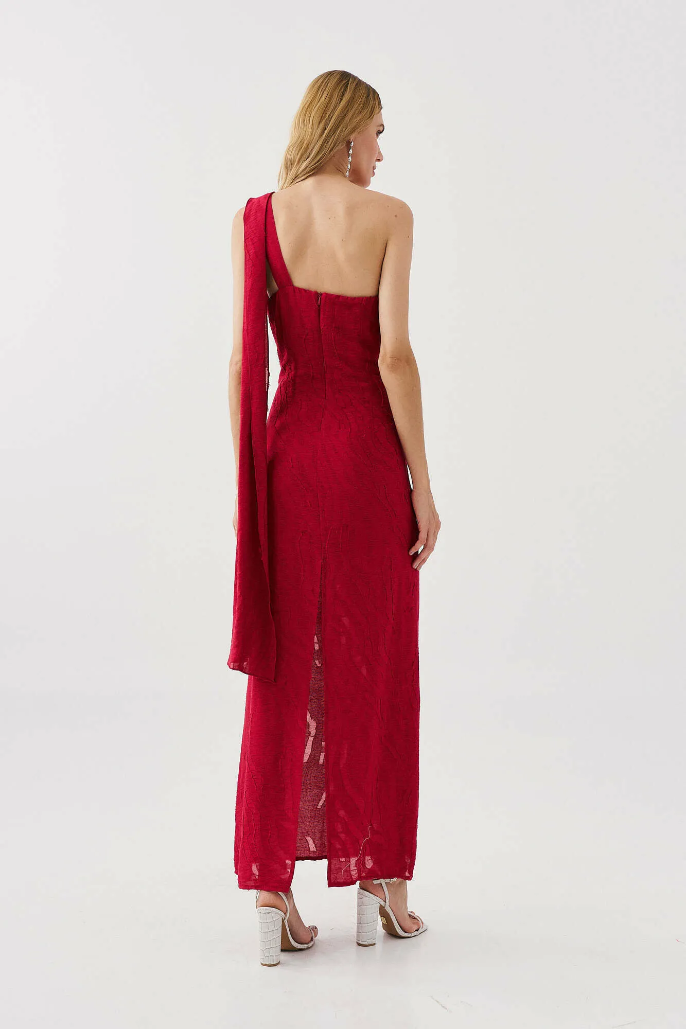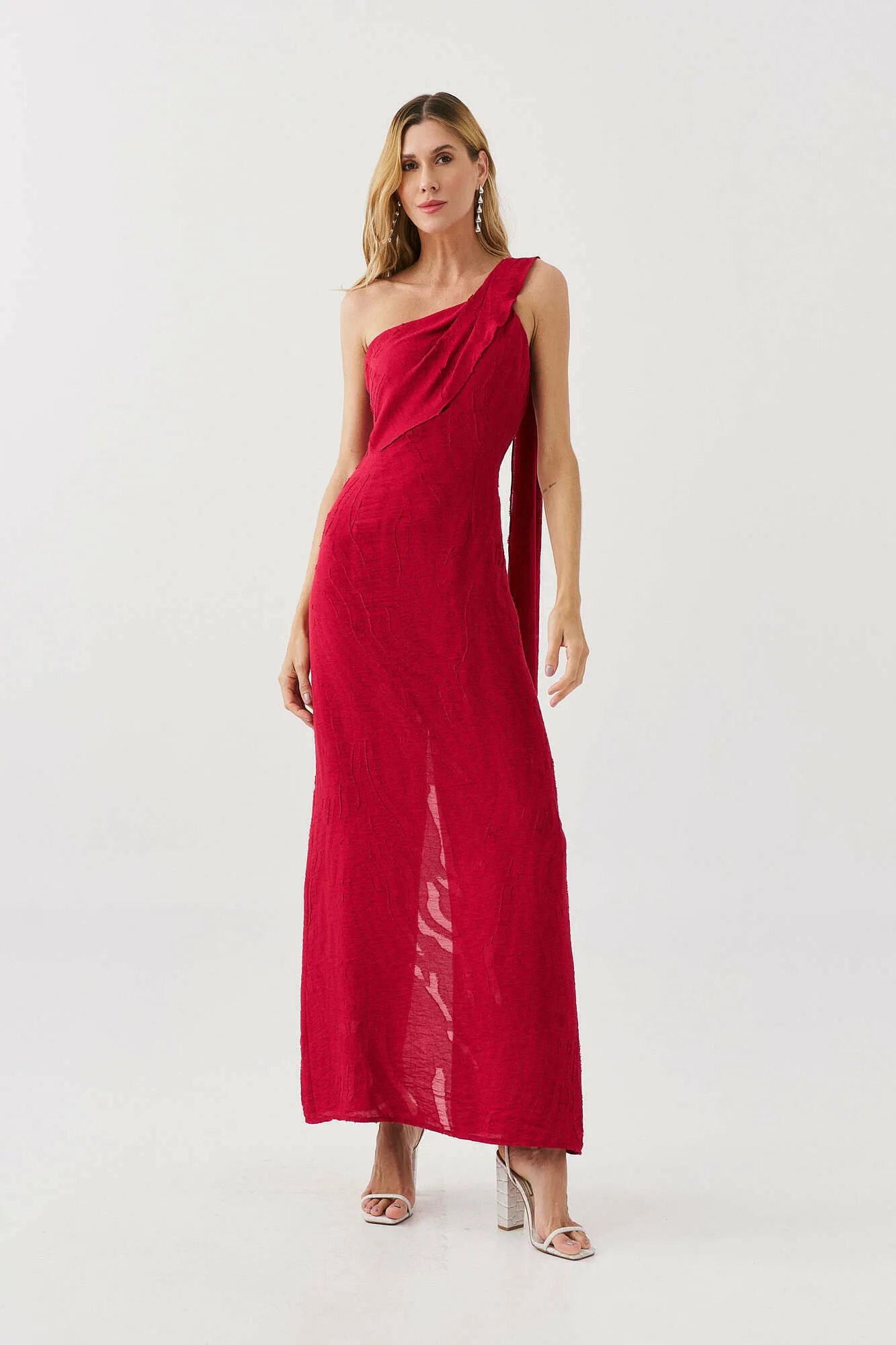 Composição: 64% viscose, 24% linho, 12% poliamida | Forro: 100% poliéster. Modelagem: longa, um ombro só com detalhe de tecido transpassado. Cor: vermelho. Origem: nacional 🇧🇷. Cuidados: lavar à mão com sabão neutro, secar à sombra e passar do avesso com ferro morno.