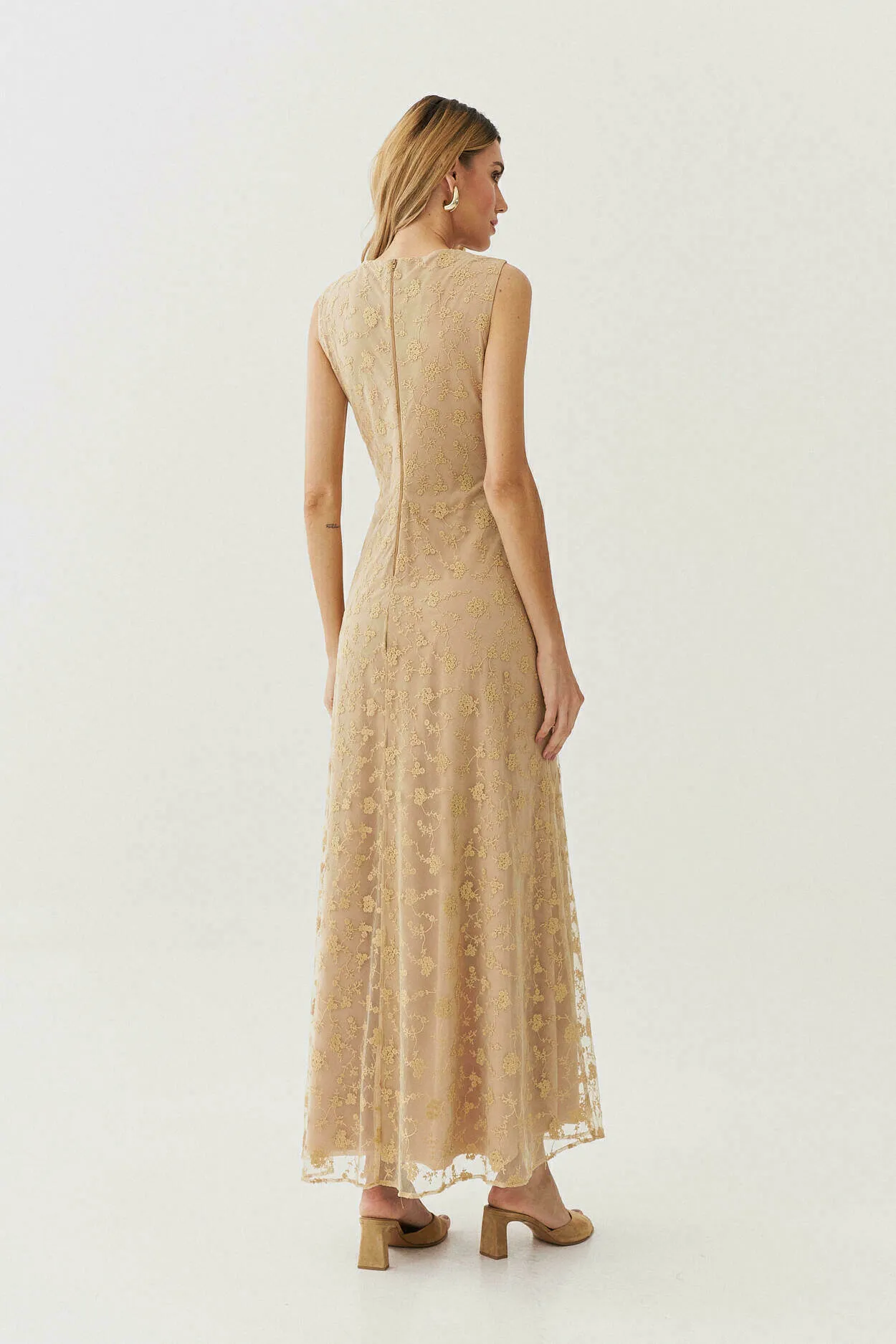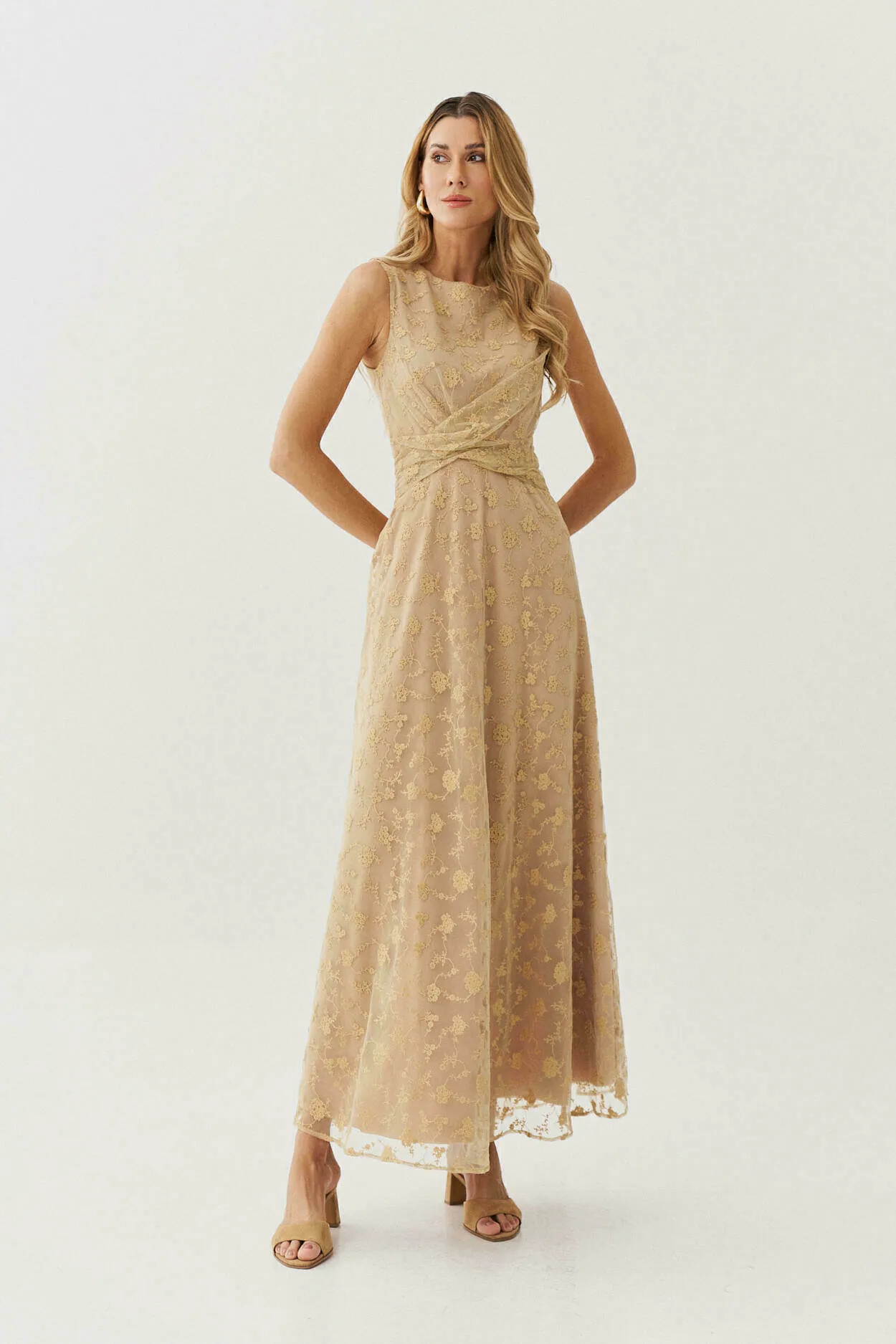 Composição: 60% poliéster, 40% poliamida | Forro: 100% poliéster. Modelagem: longa e fluida, com torção frontal, tule bordado e fechamento em zíper nas costas. Cor: dourado suave. Origem: nacional 🇧🇷. Cuidados: lavar à mão com sabão neutro, não torcer e evitar passar ferro diretamente sobre o tule bordado.