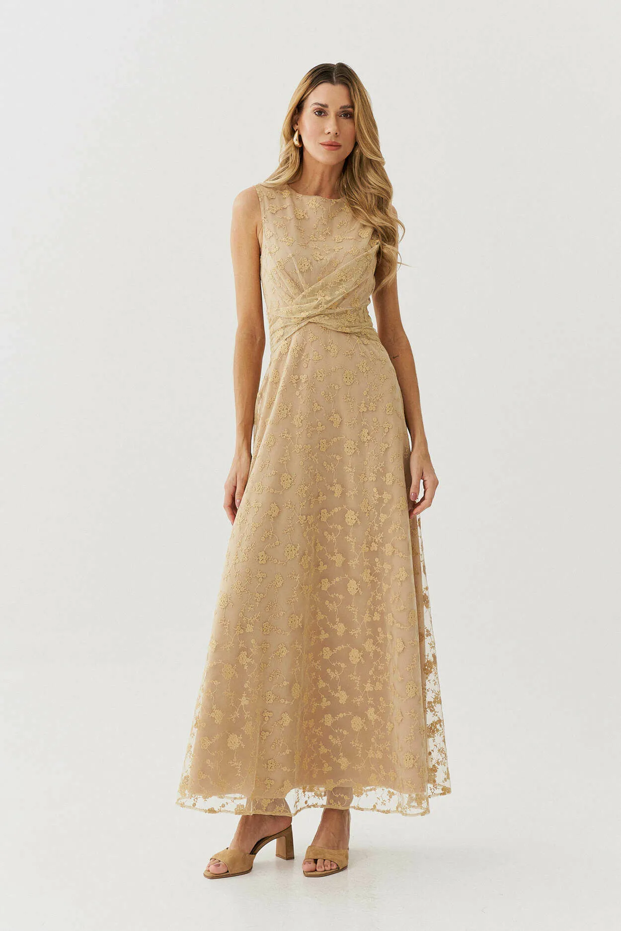 m vestido que traduz romantismo e elegância em cada detalhe ✨ — o Vestido Longo de Tule Bordado com Torção Frontal é uma peça delicada e encantadora, ideal para ocasiões especiais. Confeccionado em tule bordado com motivos florais, ele exala feminilidade e leveza, enquanto o torcido frontal valoriza a silhueta com um efeito sutil de cintura marcada. O decote fechado equilibra o visual e realça a sofisticação do bordado, enquanto o caimento fluido traz movimento e suavidade a cada passo 🌸. O forro em poliéster garante conforto e segurança ao vestir, e o fechamento posterior por zíper mantém o acabamento impecável. A tonalidade dourada suave adiciona um brilho sofisticado, perfeito para eventos de gala, casamentos ou celebrações ao entardecer.