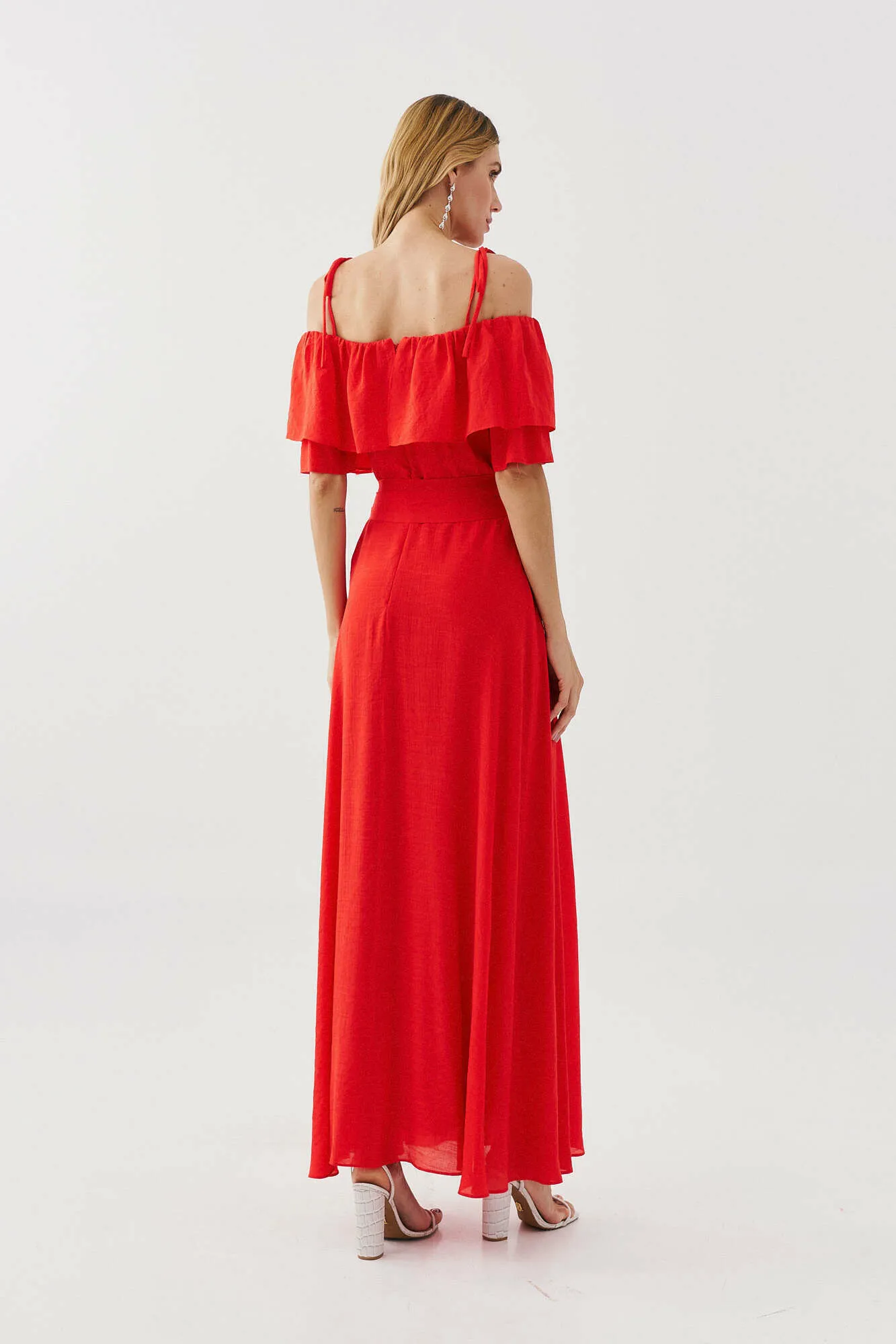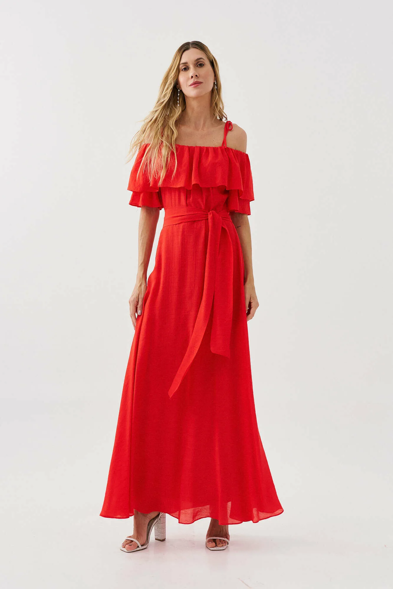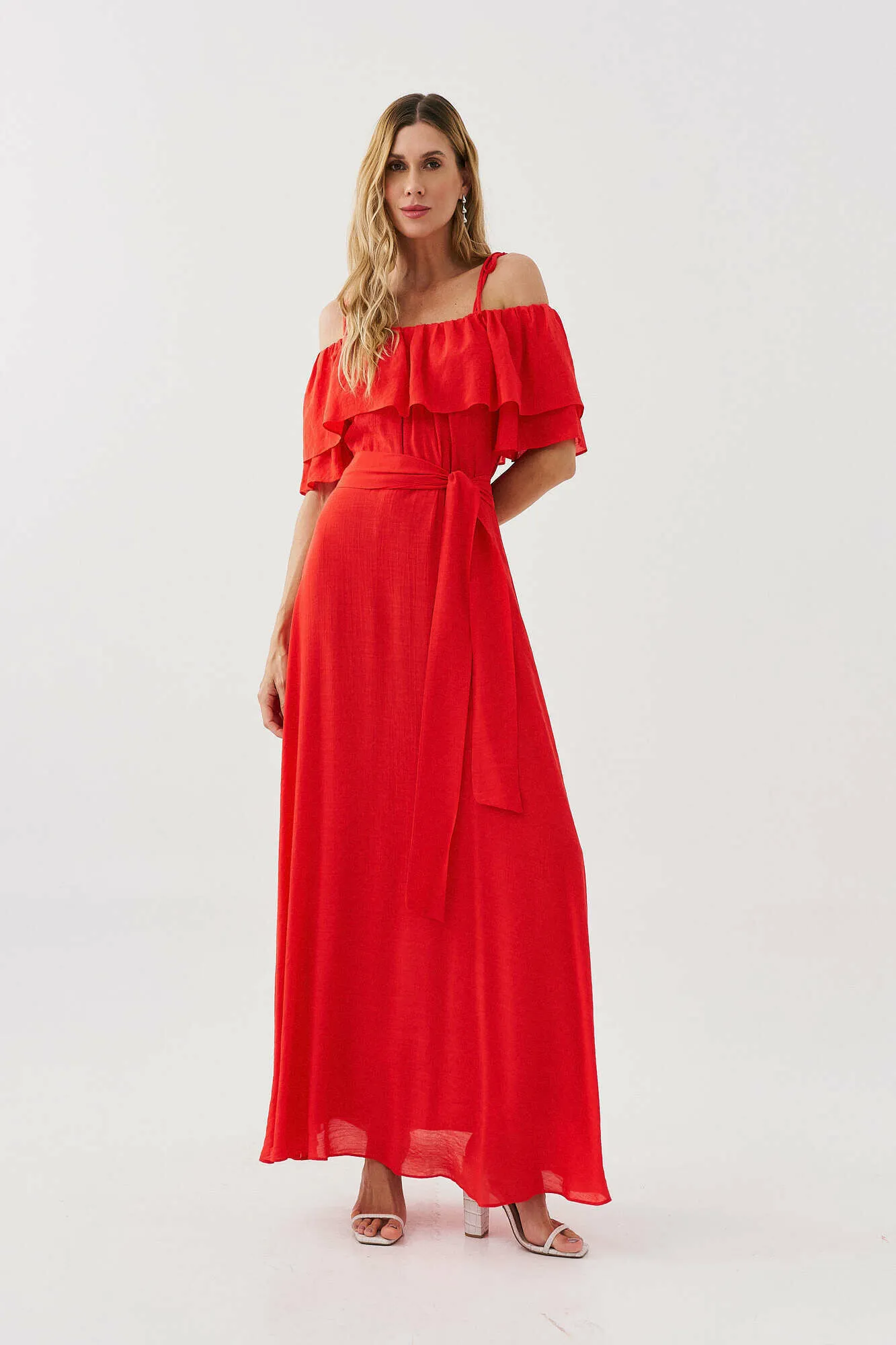 Composição: 64% viscose, 36% poliéster | Forro: 100% poliéster. Modelagem: longa, ombro a ombro com babado, alças com amarração e faixa para ajuste na cintura. Cor: verde-claro. Origem: nacional 🇧🇷. Cuidados: lavar à mão com sabão neutro, secar à sombra e passar em temperatura média.