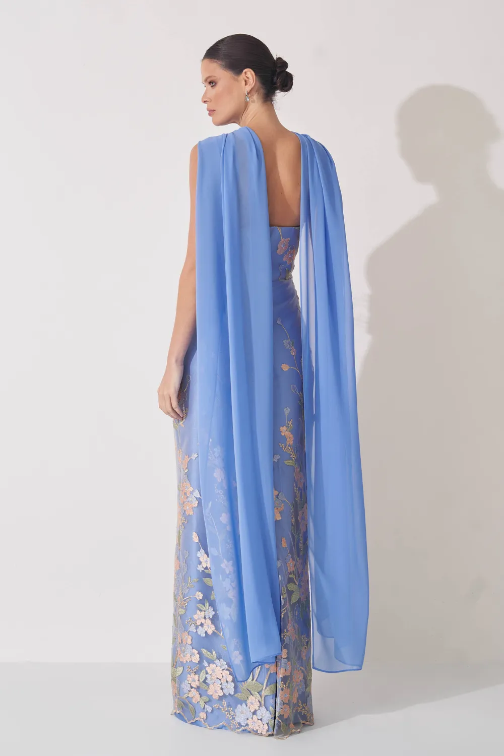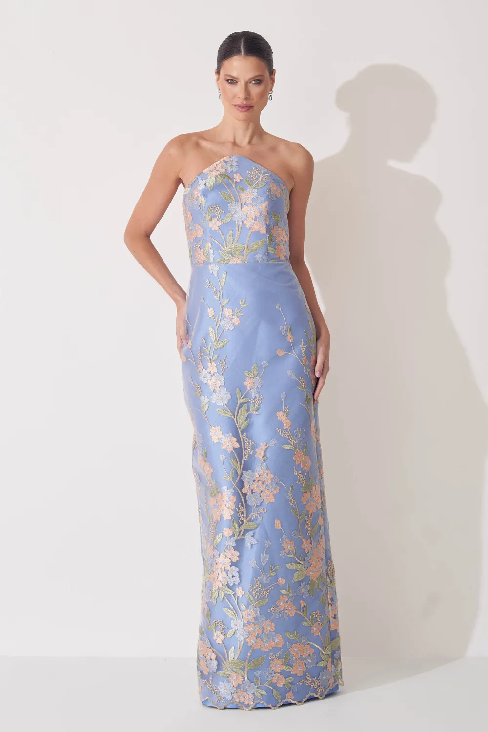 Ficha técnica: confeccionado em 100% poliéster, com base em zibeline estruturado e sobreposição de tule bordado. Modelagem longa sem alças, decote curvado, passante interno para sustentação e lenço removível em chiffon. Origem nacional. Requer lavagem delicada à mão, não alvejar e secar à sombra para preservar a estrutura e o bordado do tecido.