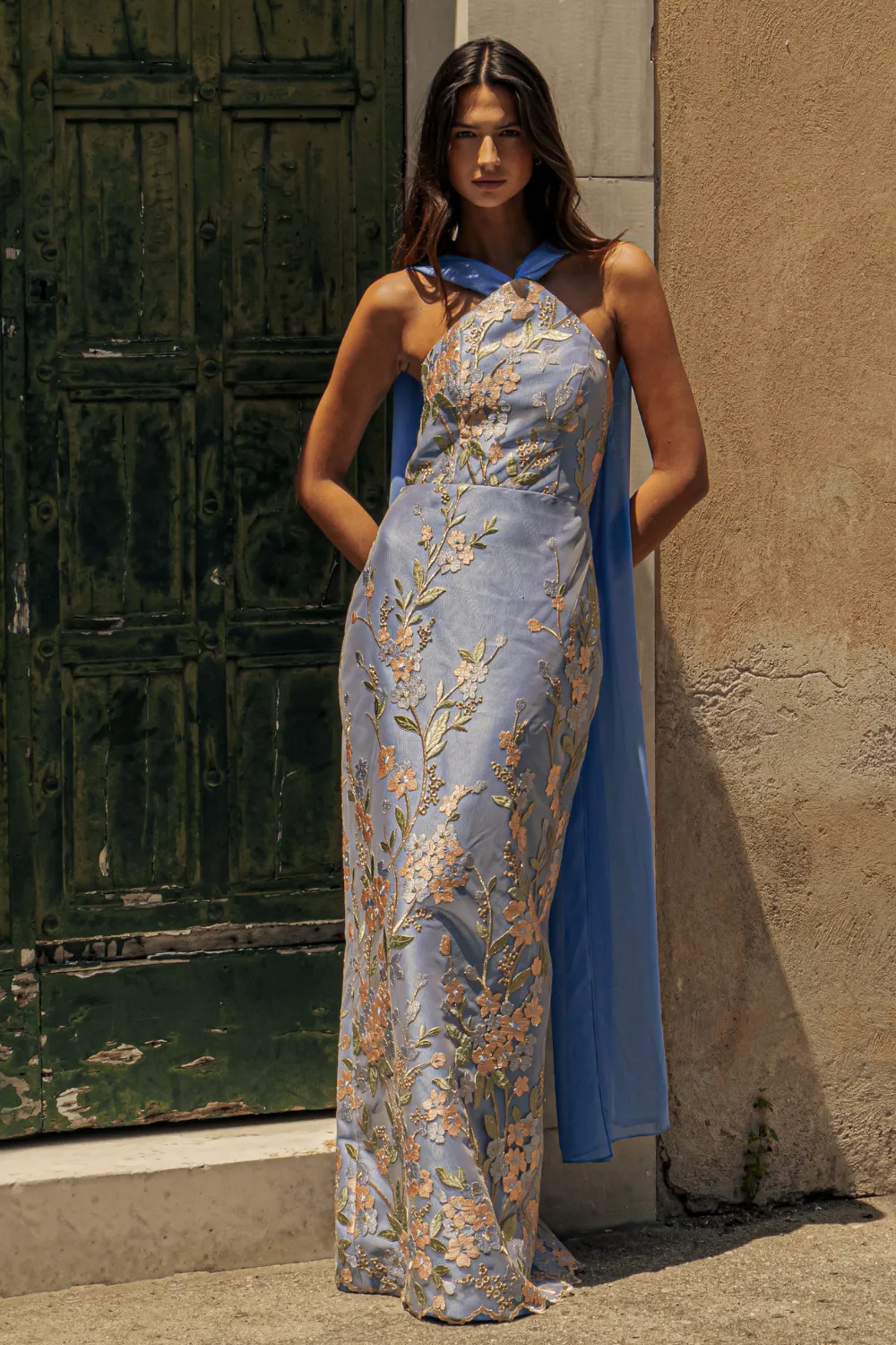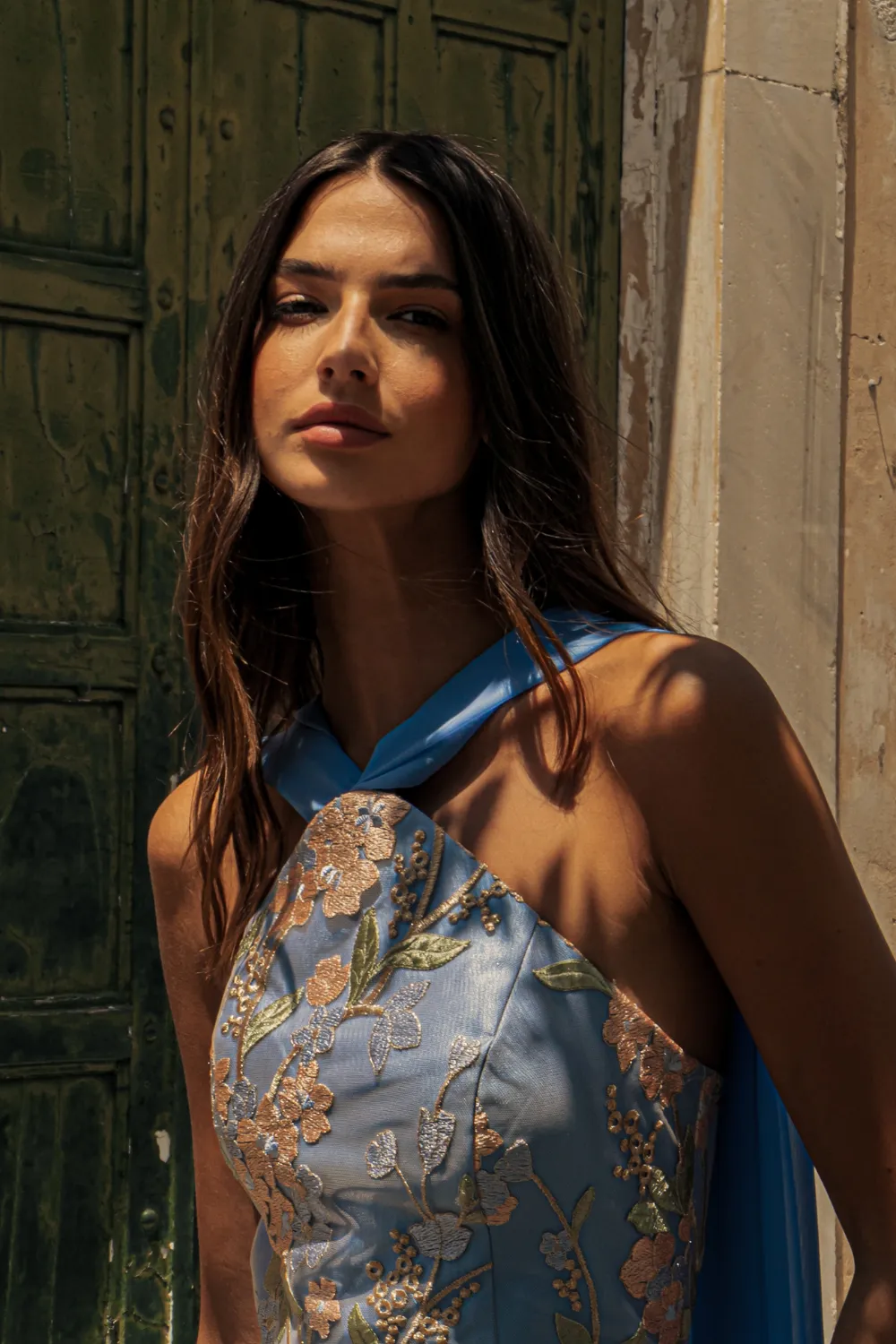 Dica de estilo: combine o Vestido Amélia com brincos de pedrarias e sandálias de salto alto metalizadas para um look de gala. Para um toque mais delicado, use o lenço sobre os ombros e aposte em acessórios perolados — o resultado é um visual etéreo e inesquecível.
