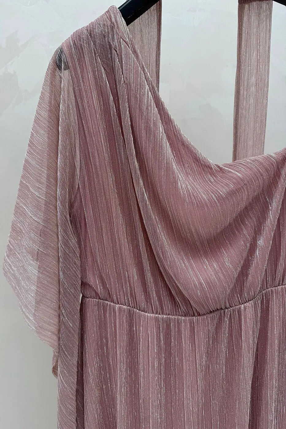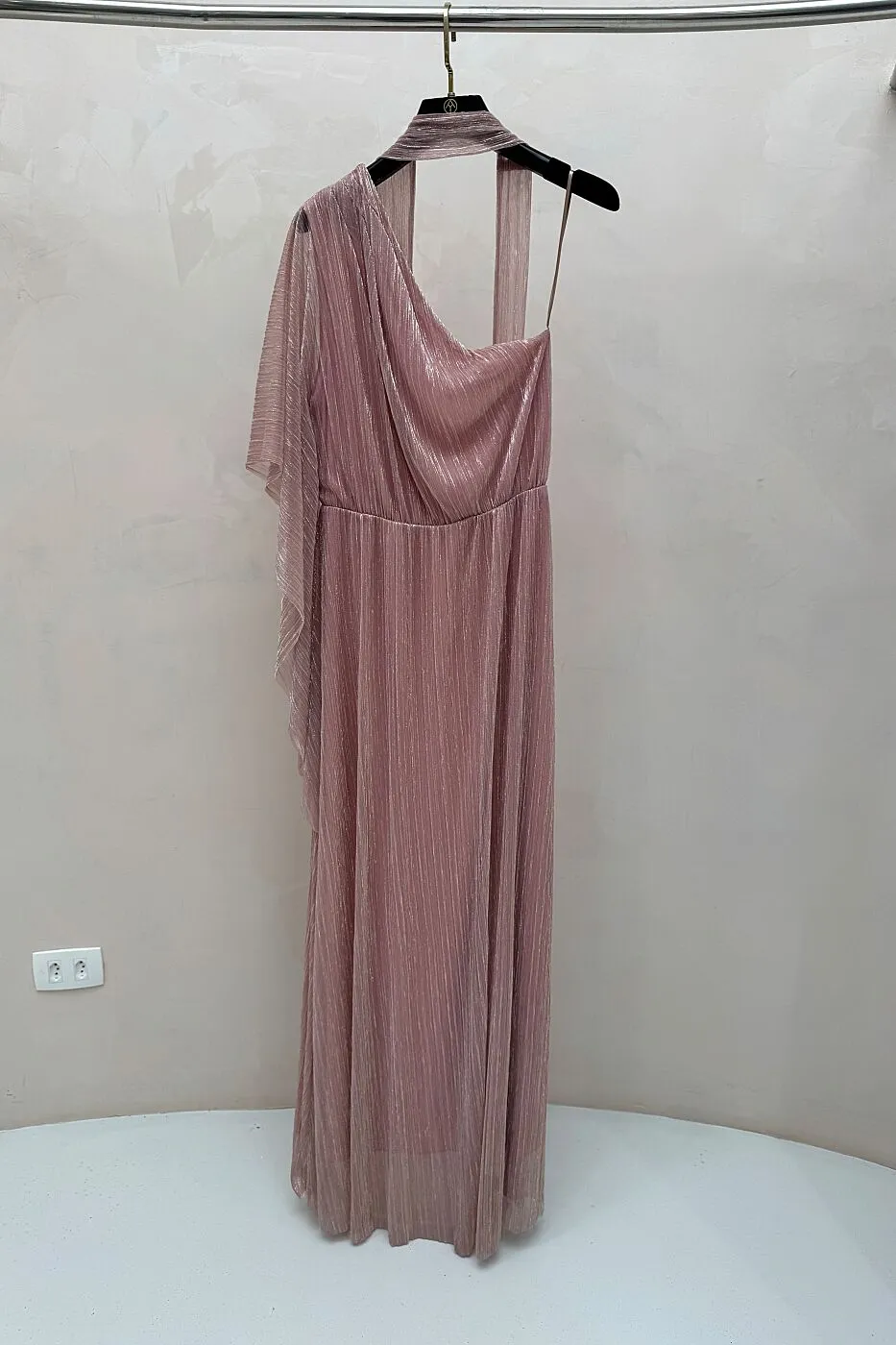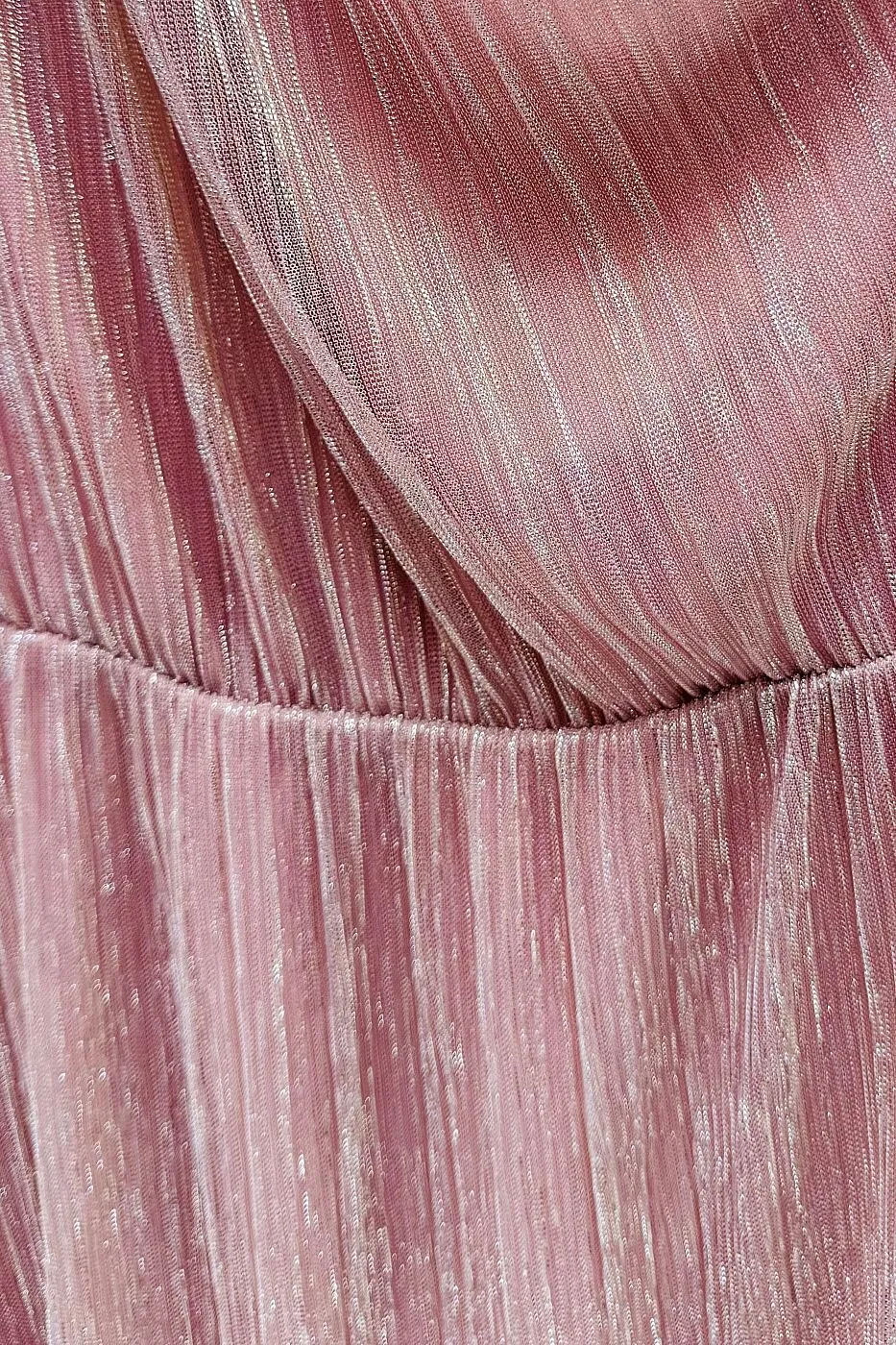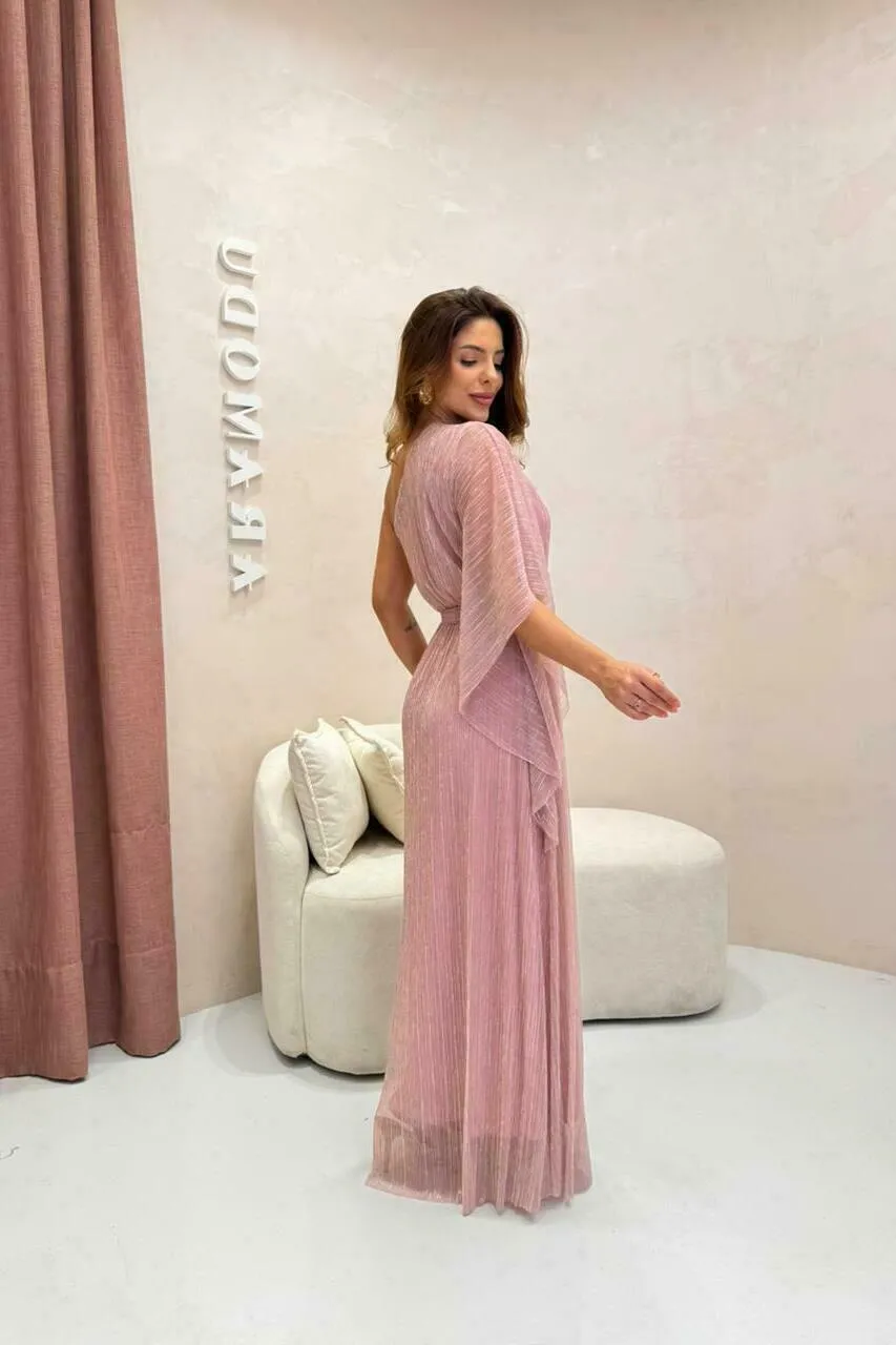 Ficha técnica: vestido confeccionado em tule com lurex, composição não informada, modelagem longa, design assimétrico, caimento fluido e leve, transparência sutil característica do tule, cor rosa, origem nacional. Cuidados de lavagem: lavar à mão, não torcer, secar à sombra e passar apenas a vapor, evitando contato direto com o lurex.