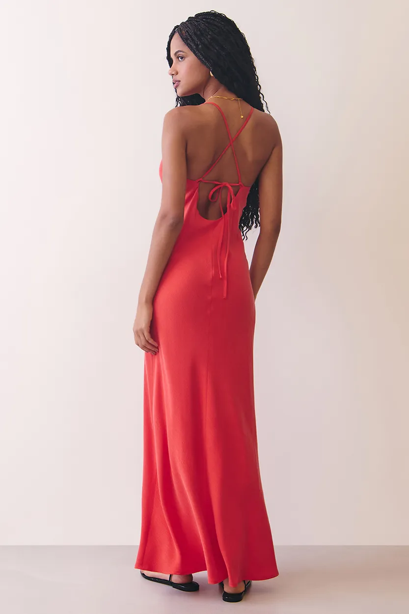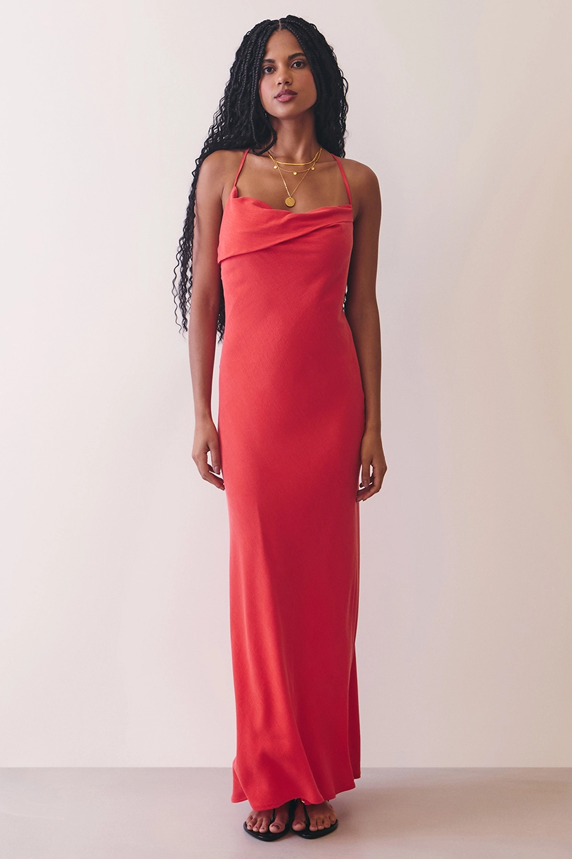 Ficha técnica: tecido composto por 60% liocel e 40% viscose; modelagem longa e ajustada; decote drapeado com pala no busto; alças finas; cor coral; origem nacional; cuidados de lavagem: lavar à mão com sabão neutro, não torcer, secar à sombra e passar em temperatura baixa.