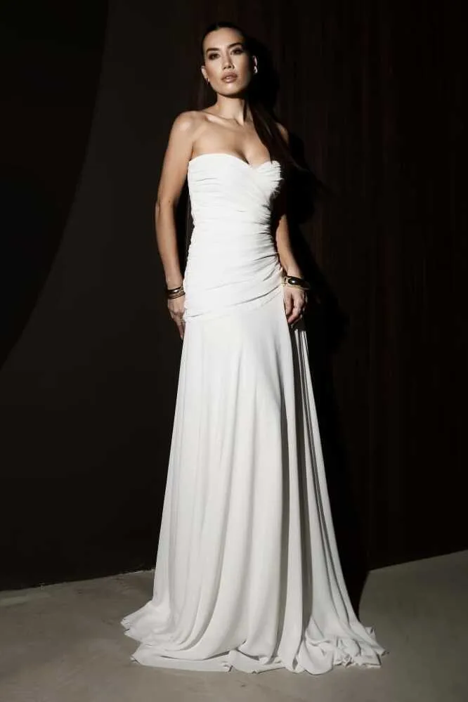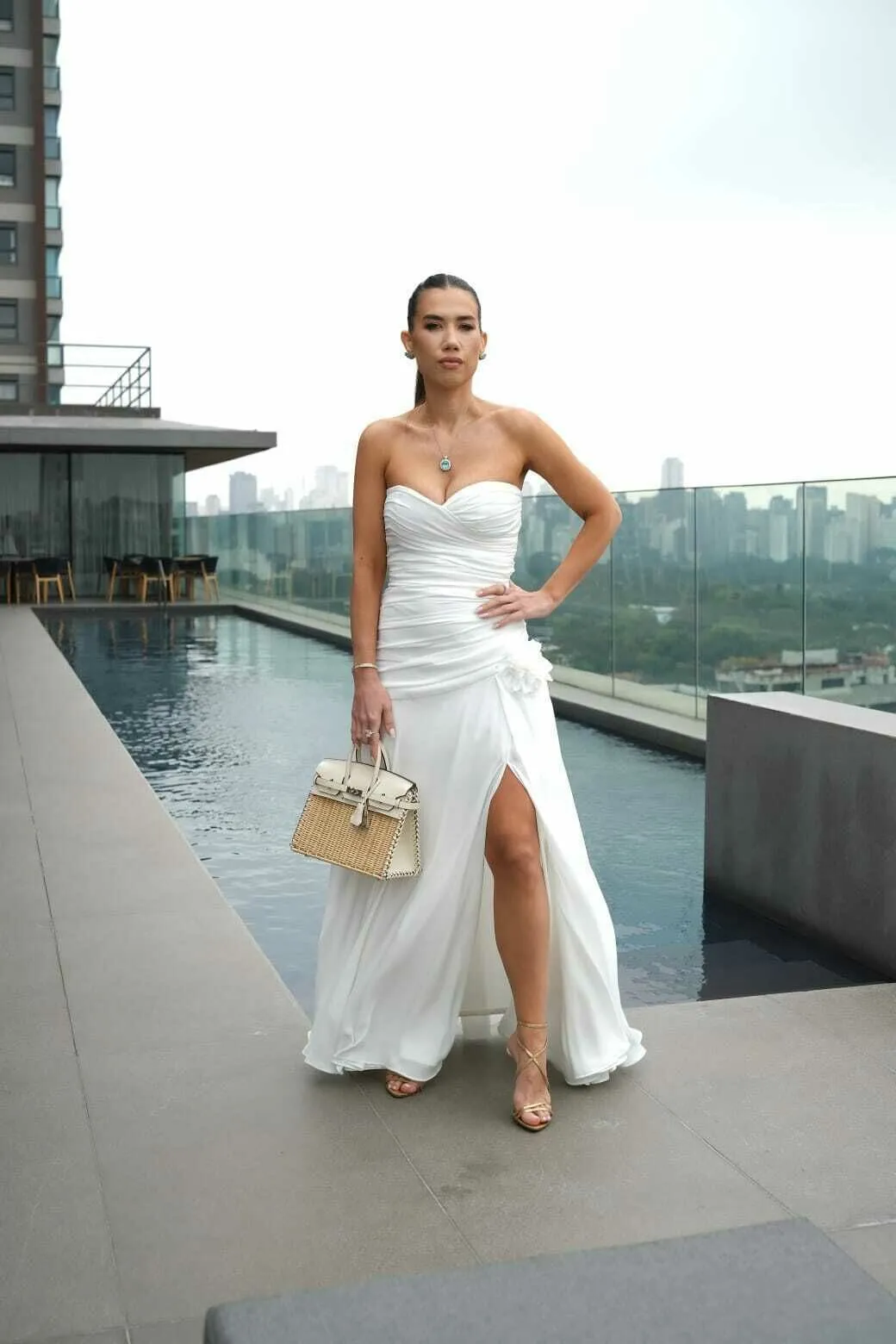 Dica de estilo: aposte em brincos longos e sandálias de salto fino para um visual glamouroso e equilibrado. Para um toque mais romântico, adicione uma clutch perolada e penteado preso — o decote sem alças ganha ainda mais destaque e elegância.