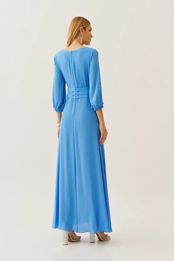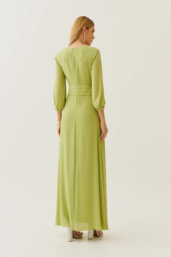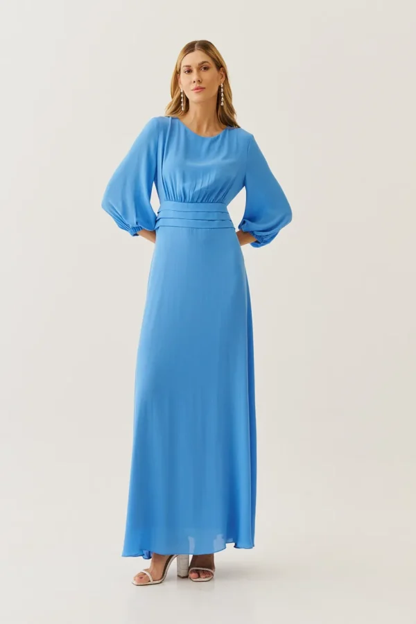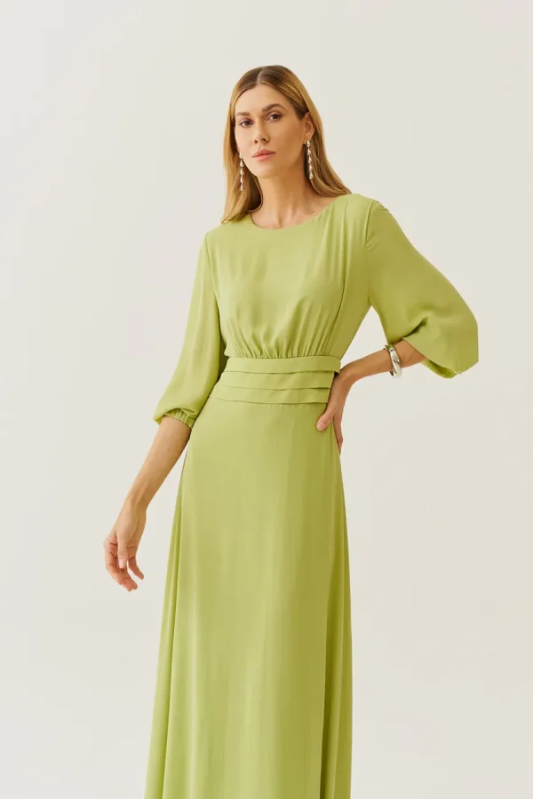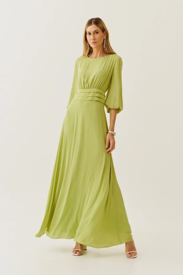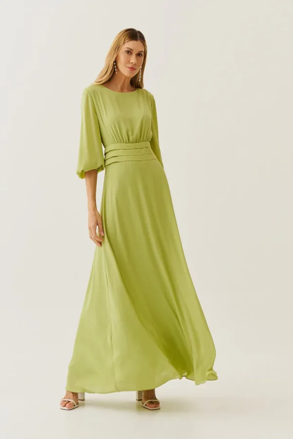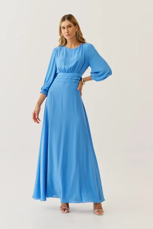 Sofisticado e cheio de movimento, esse vestido longo em crepe é a escolha perfeita para quem deseja transmitir leveza e elegância ao mesmo tempo. As pregas na cintura realçam a silhueta de forma delicada, enquanto as mangas fluidas com punho elástico trazem um ar romântico. O caimento solto da saia cria uma sensação de frescor e liberdade, tornando-o ideal para ocasiões especiais.