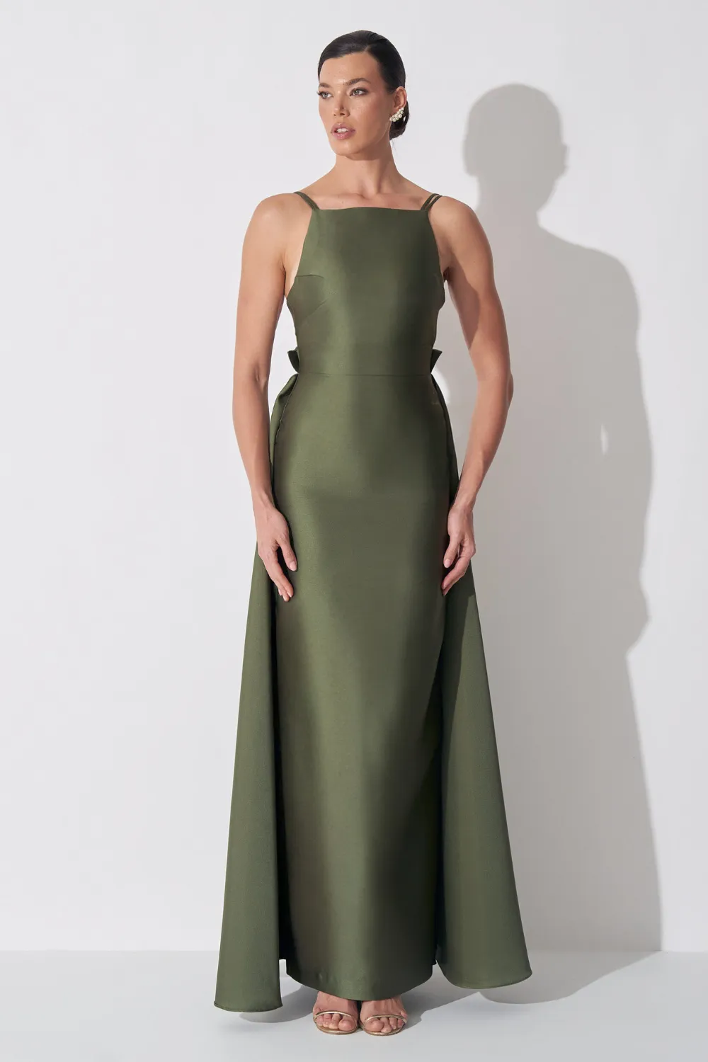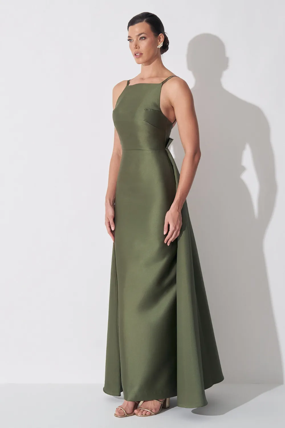 Ficha técnica: 100% poliéster. Tecido em zibeline estruturado com brilho acetinado. Modelagem longa com busto ajustado, decote canoa, alças finas, decote profundo nas costas e saia reta com sobressaia rodada. Origem: nacional. Cuidados: lavar a seco ou manualmente com sabão neutro, não torcer, secar à sombra e passar em baixa temperatura pelo avesso.
