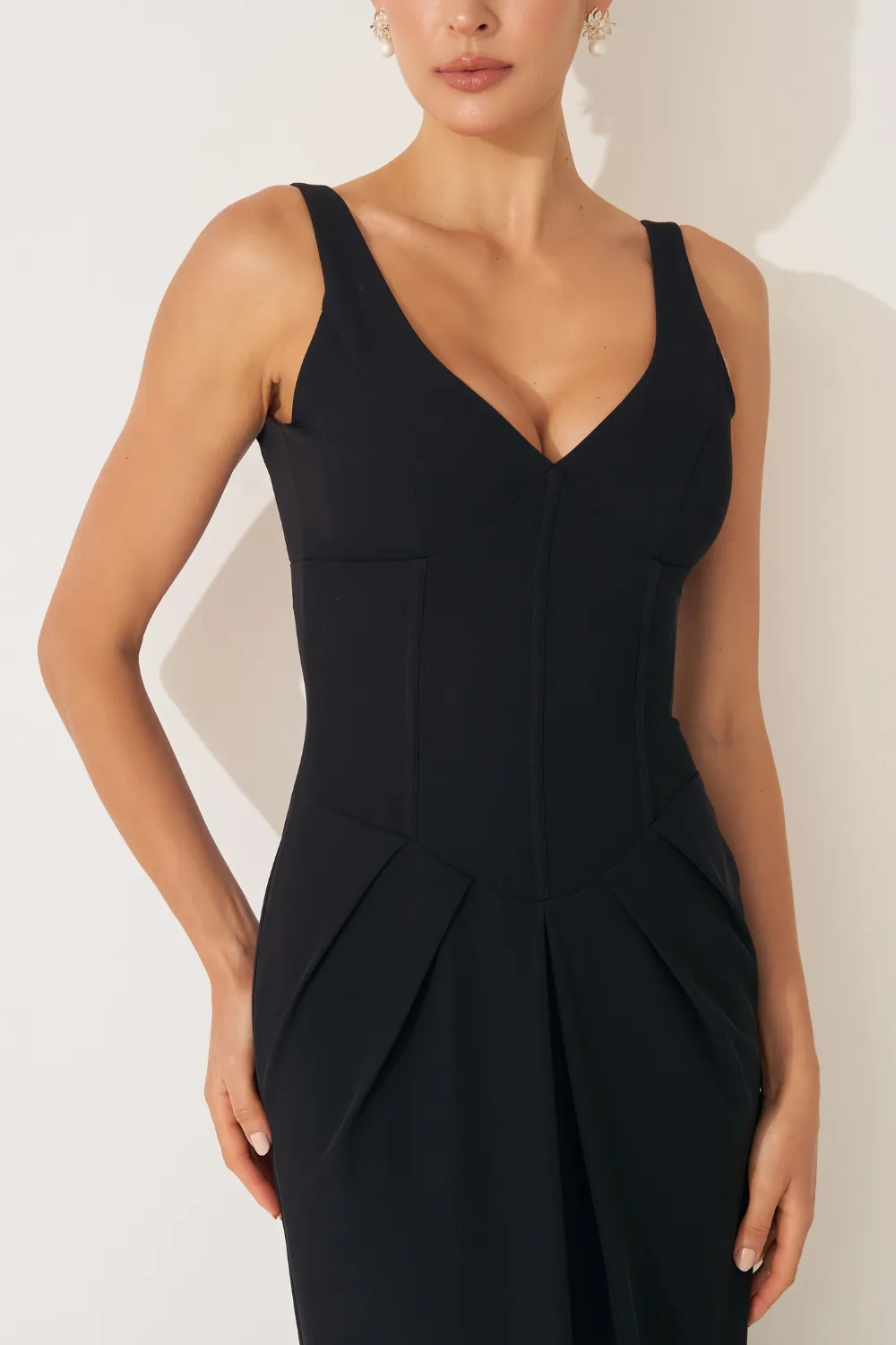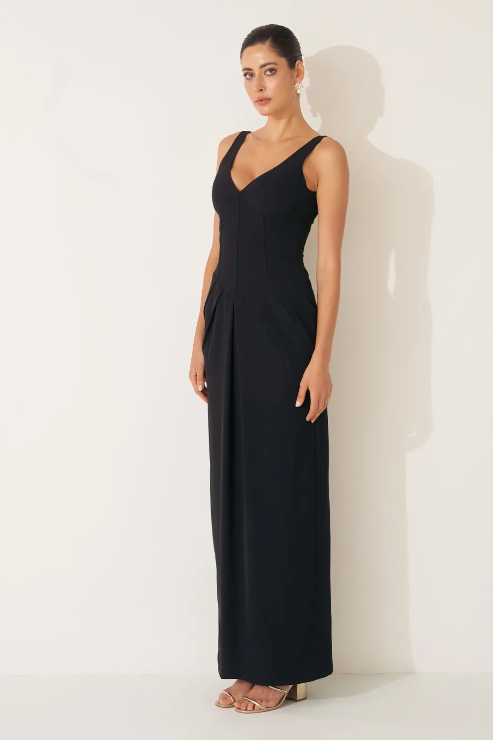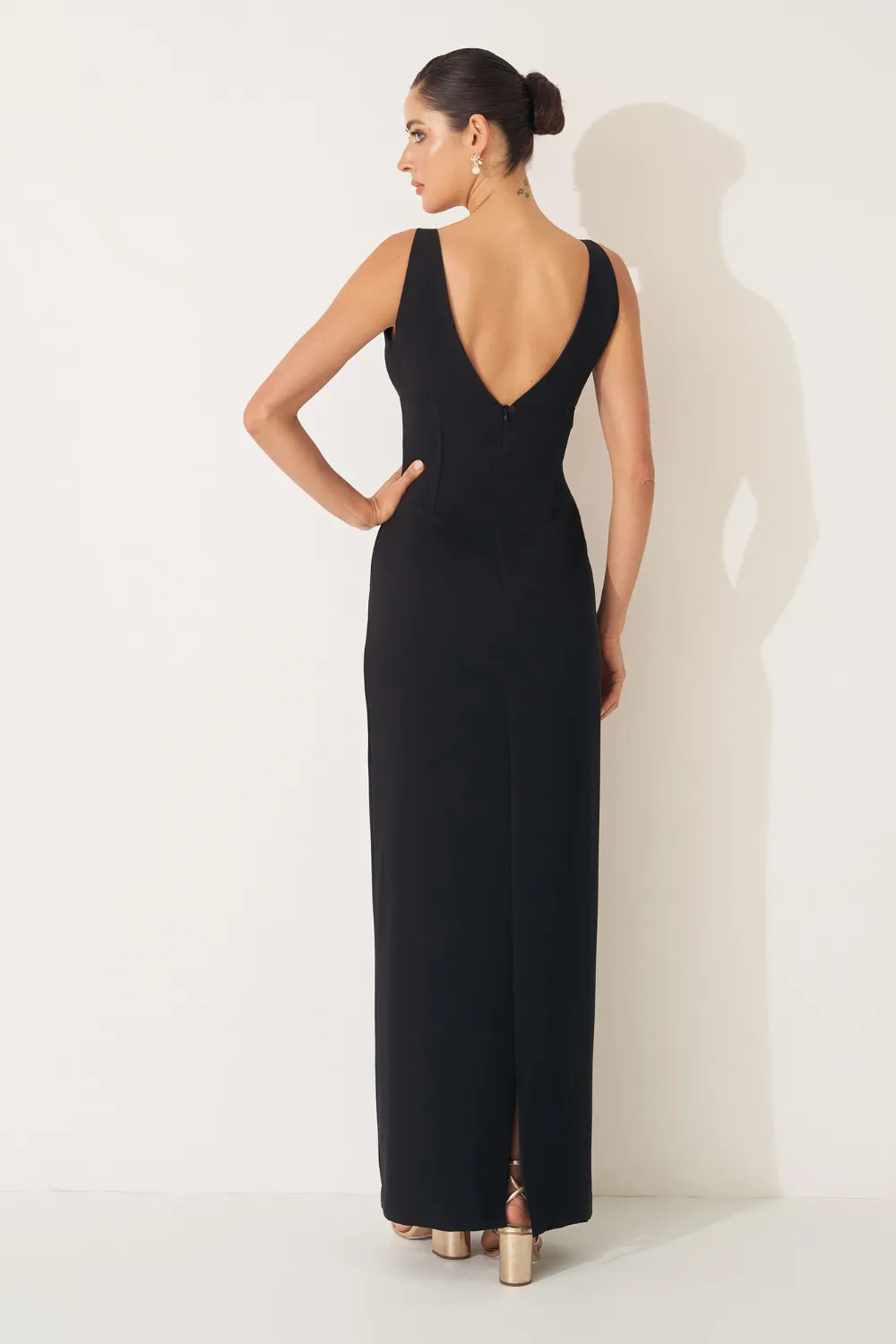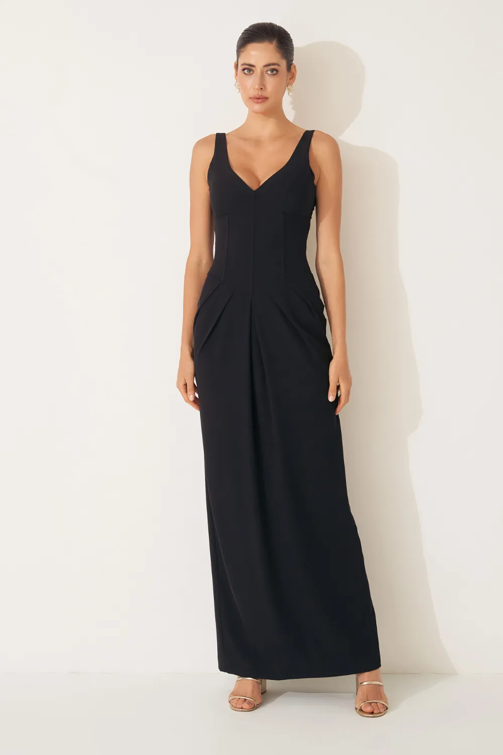 O Vestido Longo Mavie traduz com perfeição a elegância clássica com um toque contemporâneo. Confeccionado em crepe alfaiataria com leve elasticidade, ele oferece estrutura, conforto e um caimento impecável que realça a silhueta com naturalidade. O decote em V com alças largas equilibra sensualidade e sofisticação, valorizando o colo de forma discreta e refinada. O corset marcado na cintura cria um efeito modelador impecável, delineando as curvas com precisão, enquanto a saia longa e levemente evasê confere movimento e harmonia ao visual. É uma peça versátil e poderosa, ideal para eventos formais, casamentos ou ocasiões noturnas em que a elegância fala mais alto.