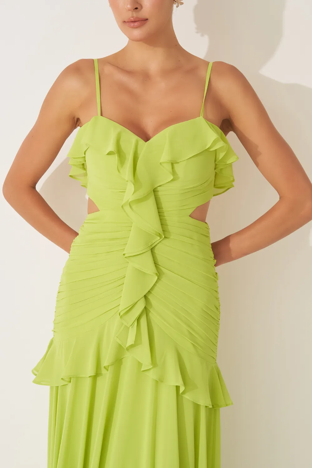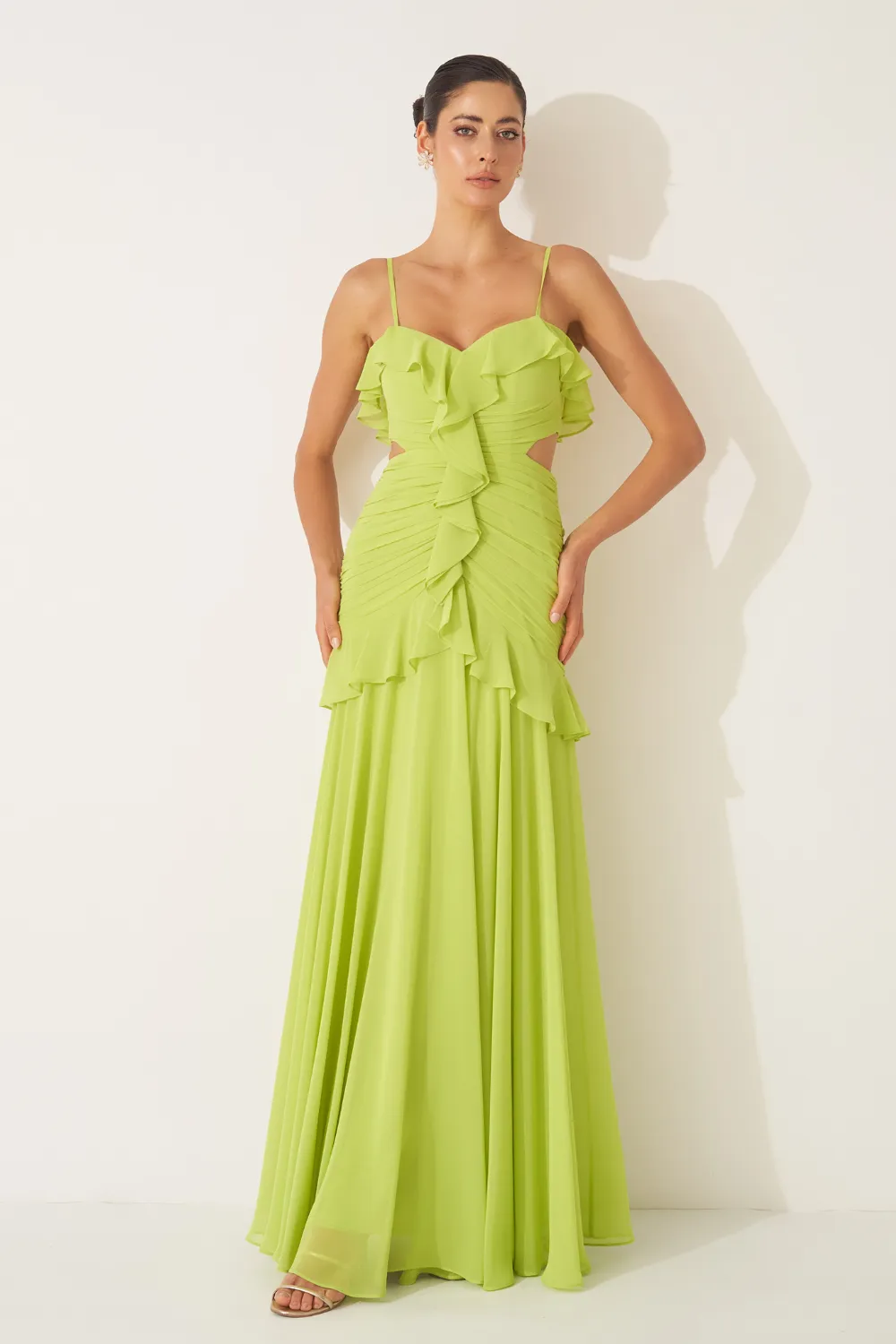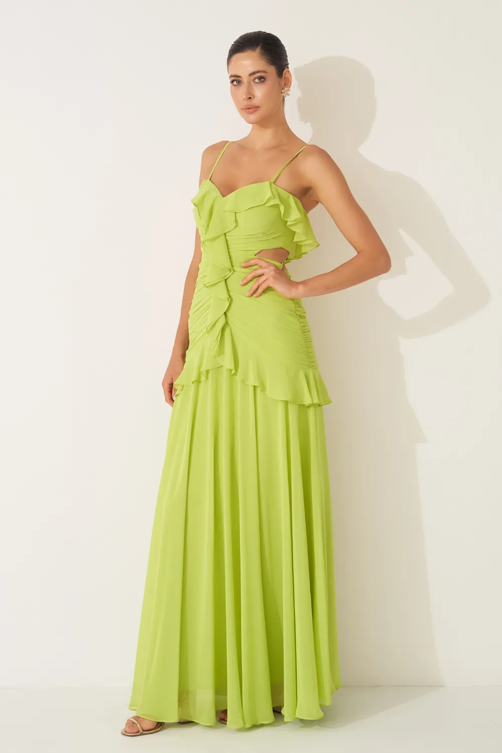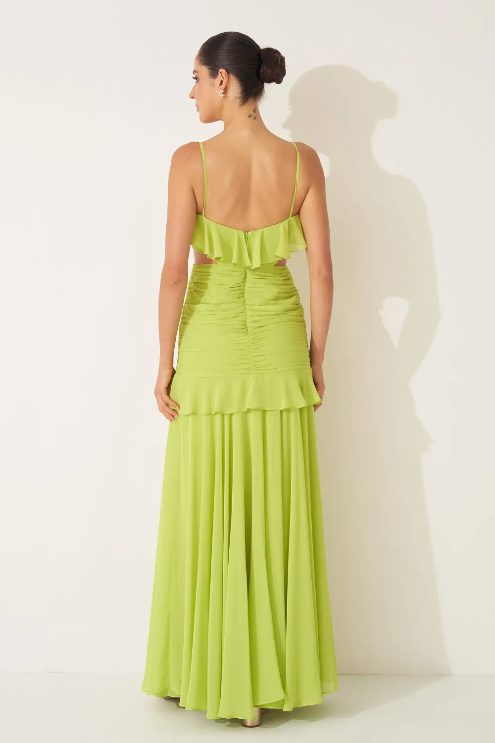 Ficha técnica: 100% poliéster. Tecido em chiffon leve e fluido. Modelagem longa com busto em formato coração, babados verticais até o quadril e alças finas. Caimento etéreo e elegante. Origem: nacional. Cuidados: lavar à mão com sabão neutro, não torcer, secar à sombra e passar a vapor em baixa temperatura pelo avesso.