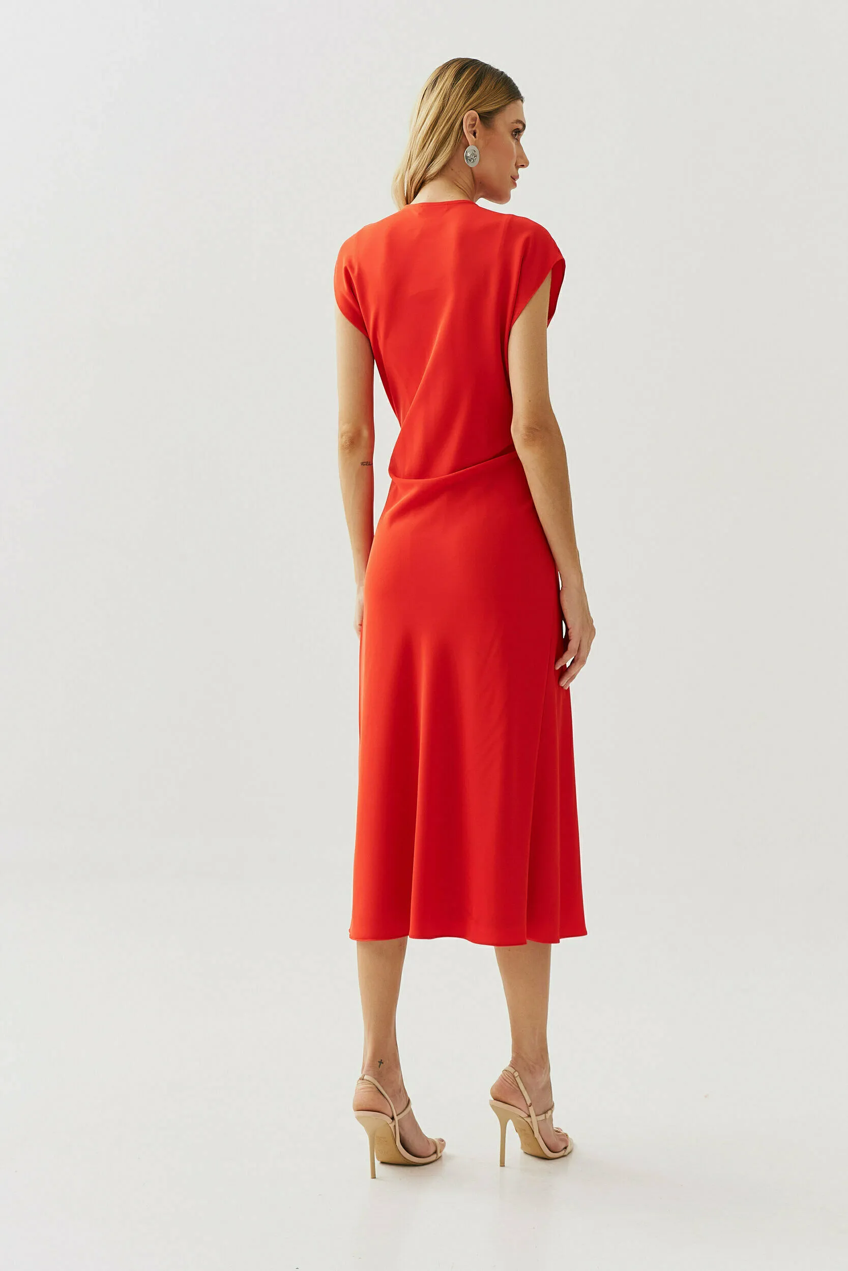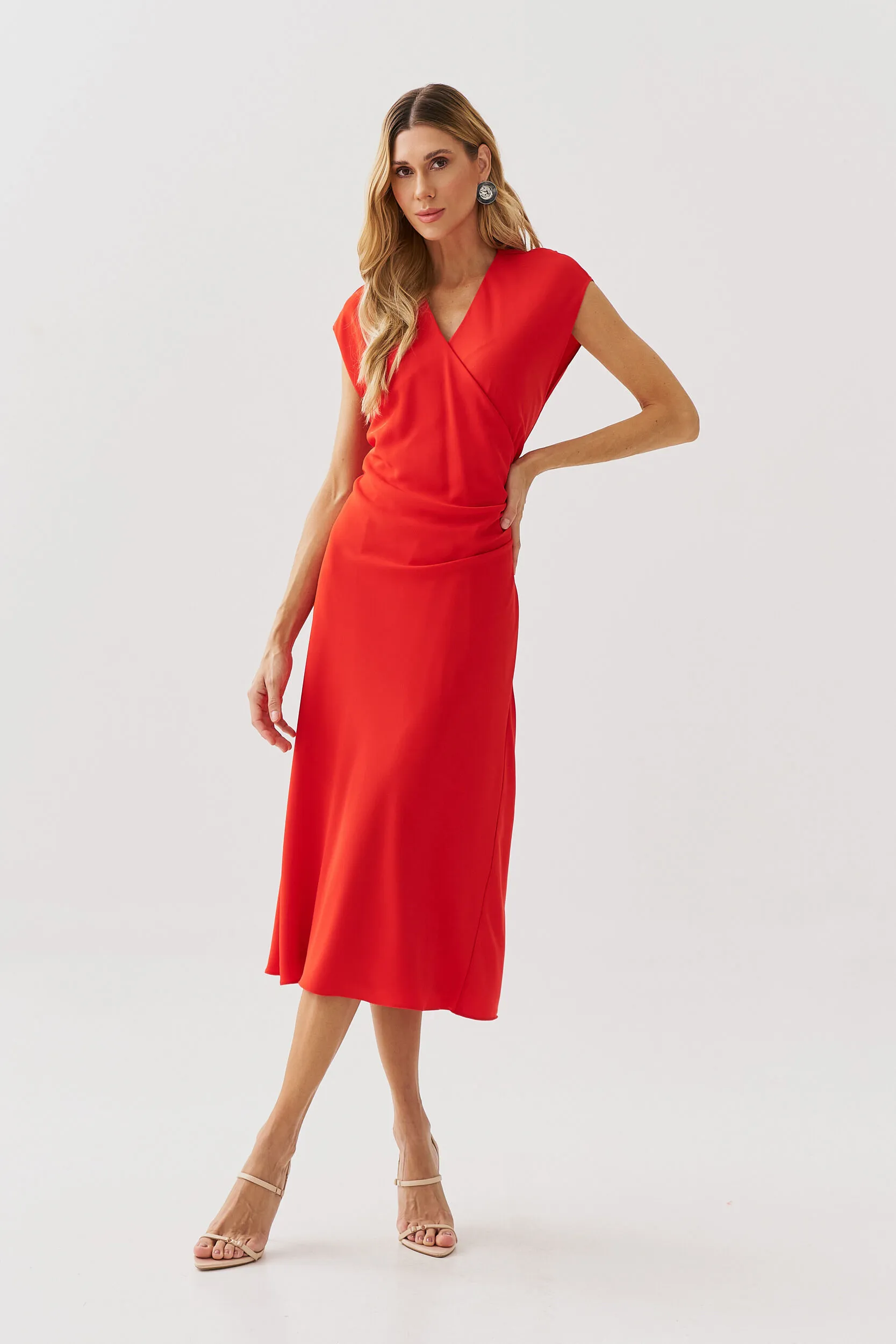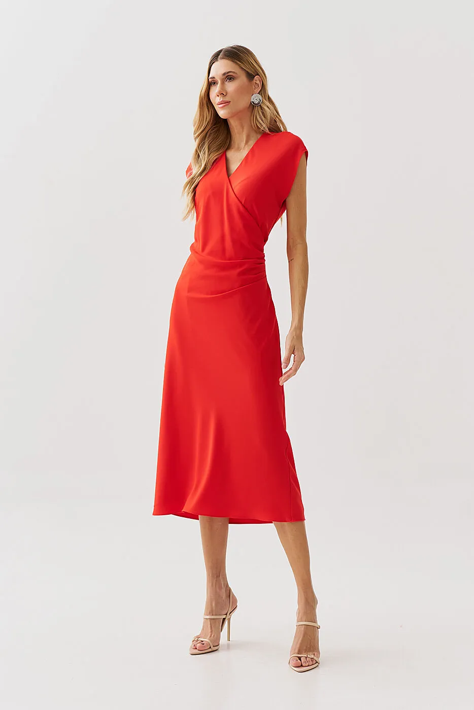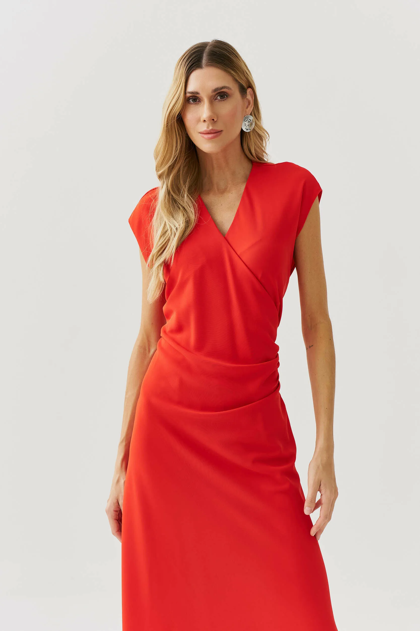 O decote em V transpassado alonga a silhueta e traz um toque de sensualidade equilibrada, enquanto as pregas laterais delicadamente posicionadas criam um efeito drapeado que realça a cintura e proporciona movimento fluido à saia midi. A modelagem é sofisticada e confortável, ideal para almoços elegantes, eventos diurnos ou jantares especiais.