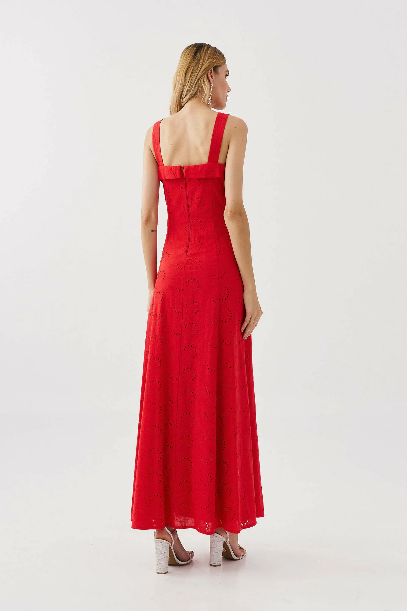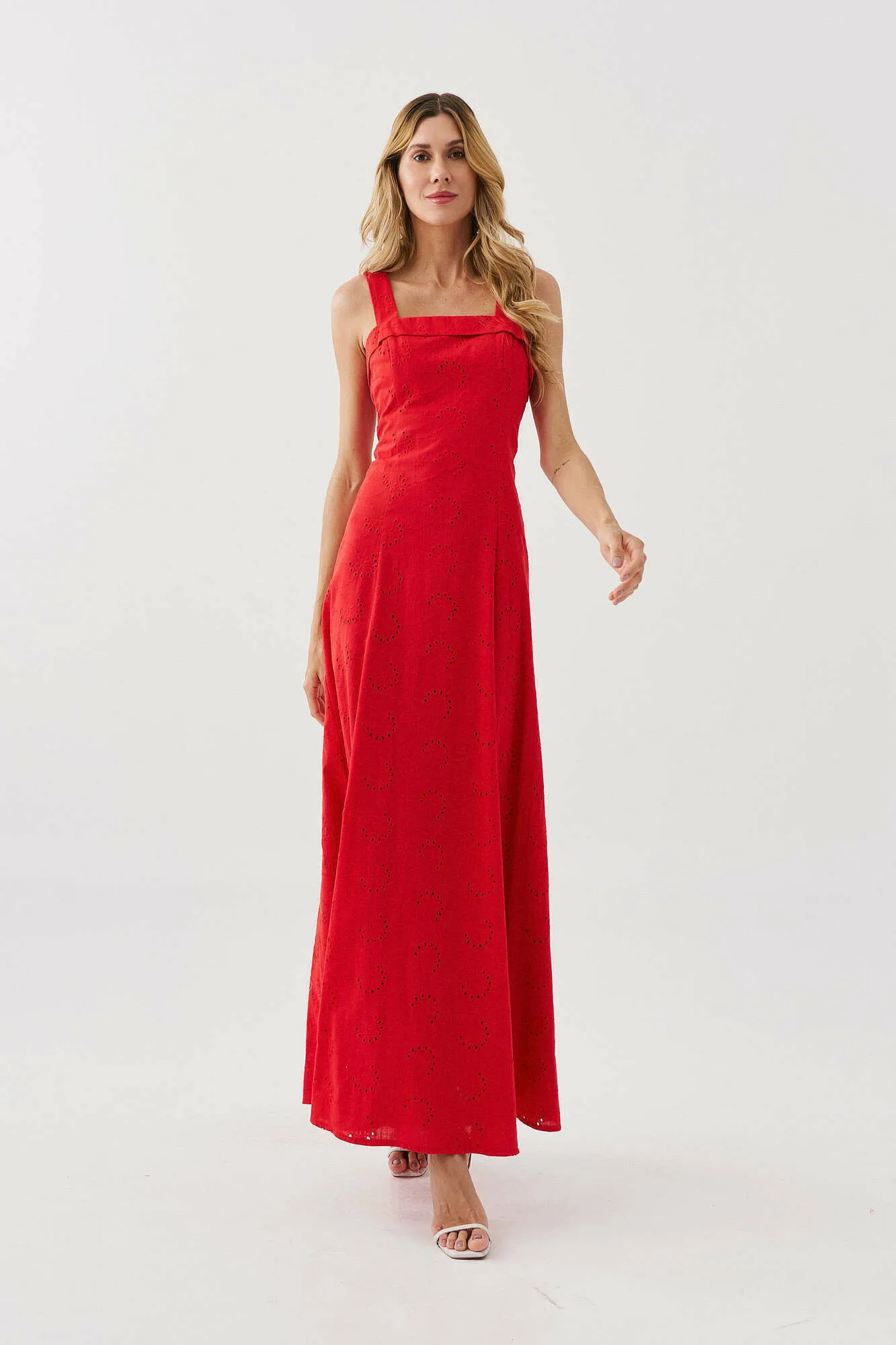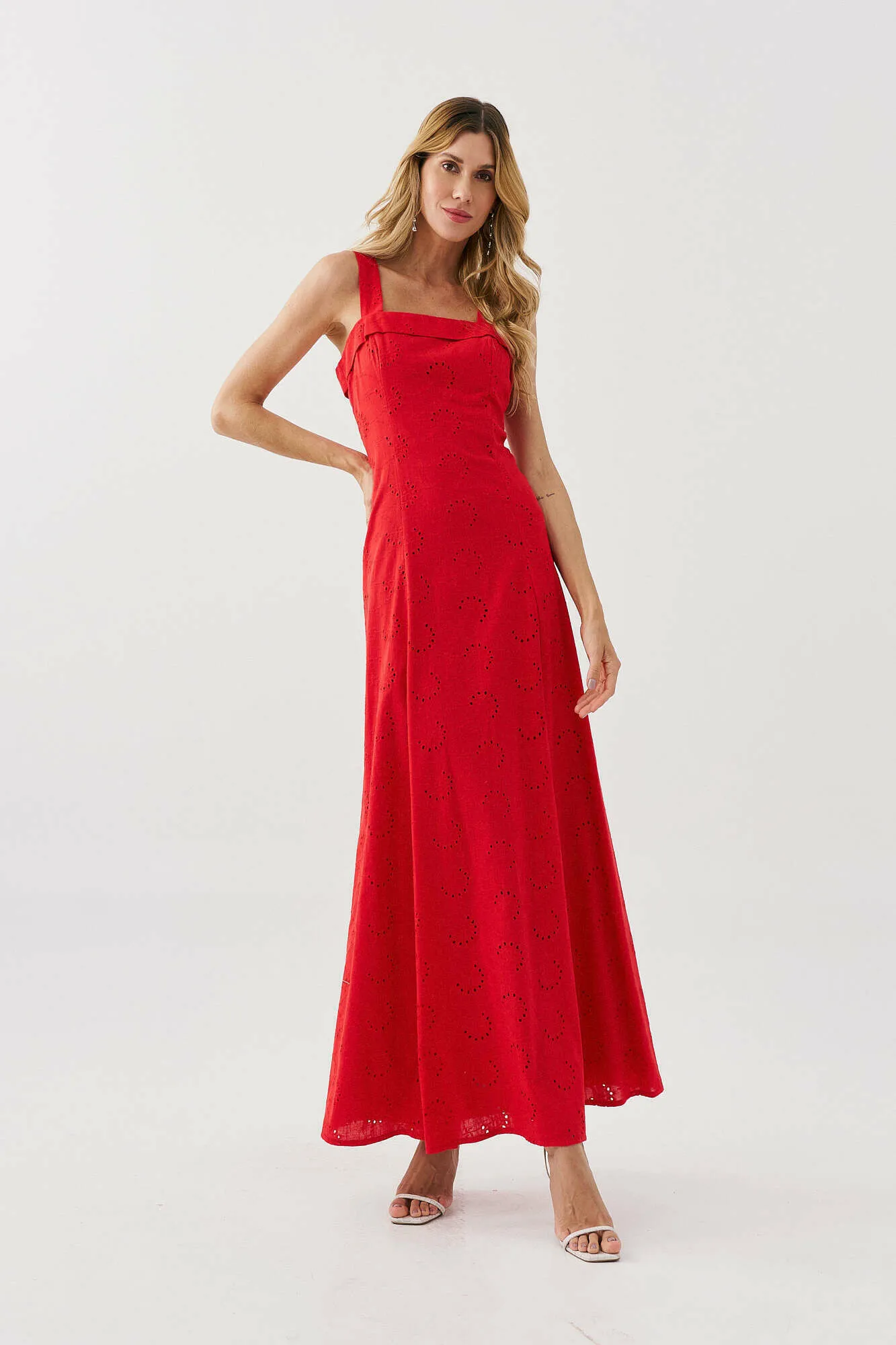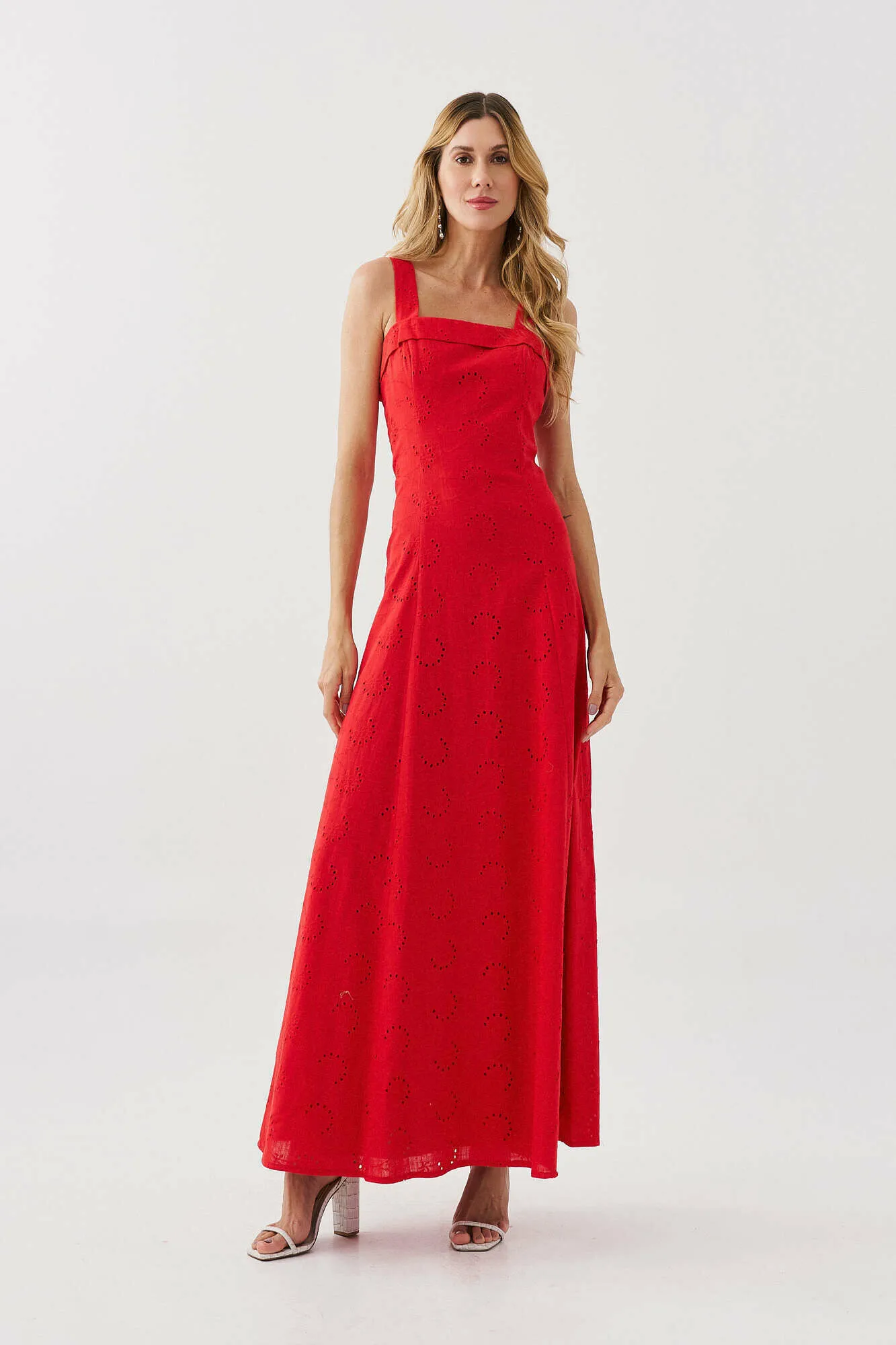 Modelagem: midi, com decote reto e alças largas.