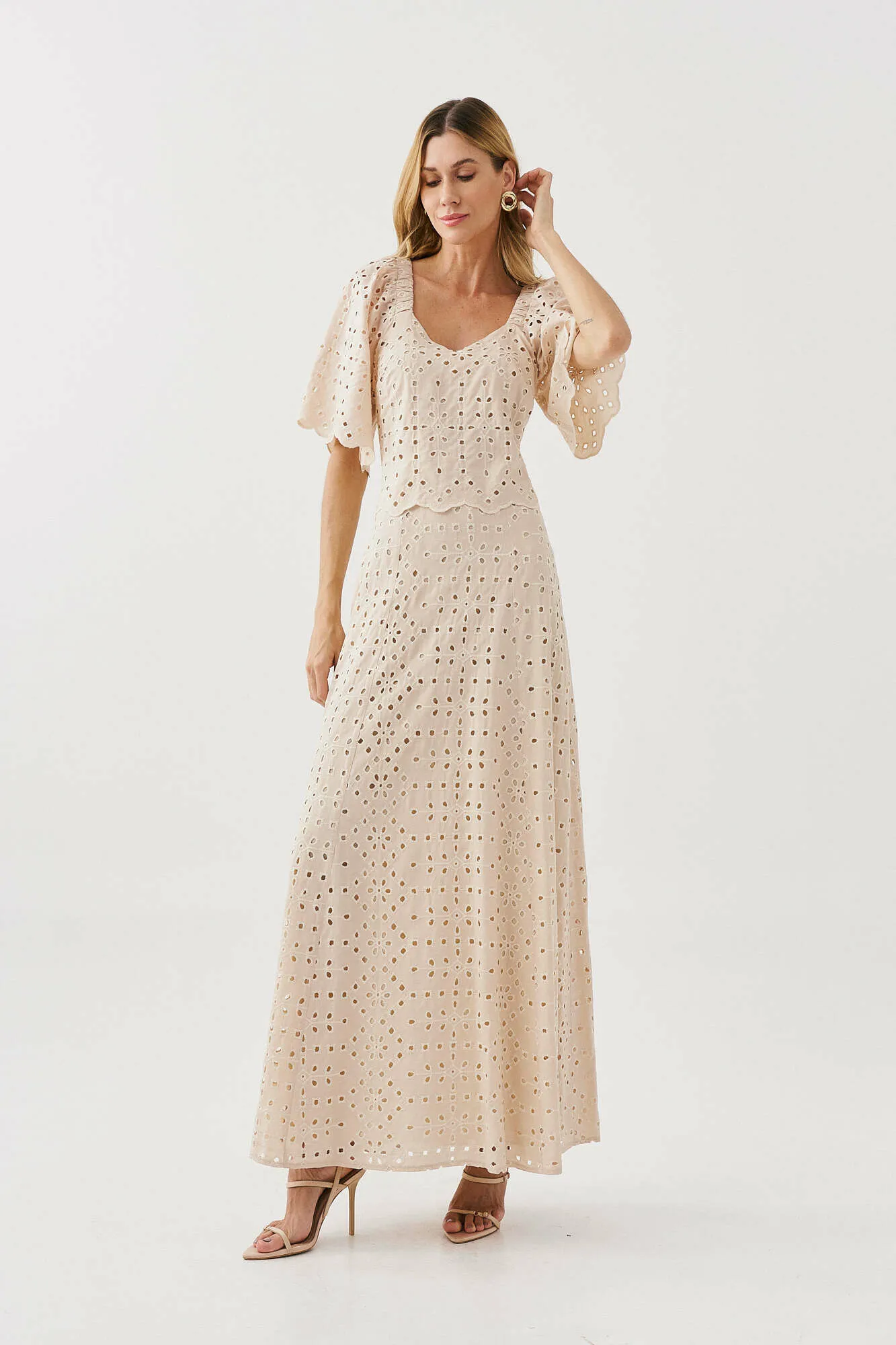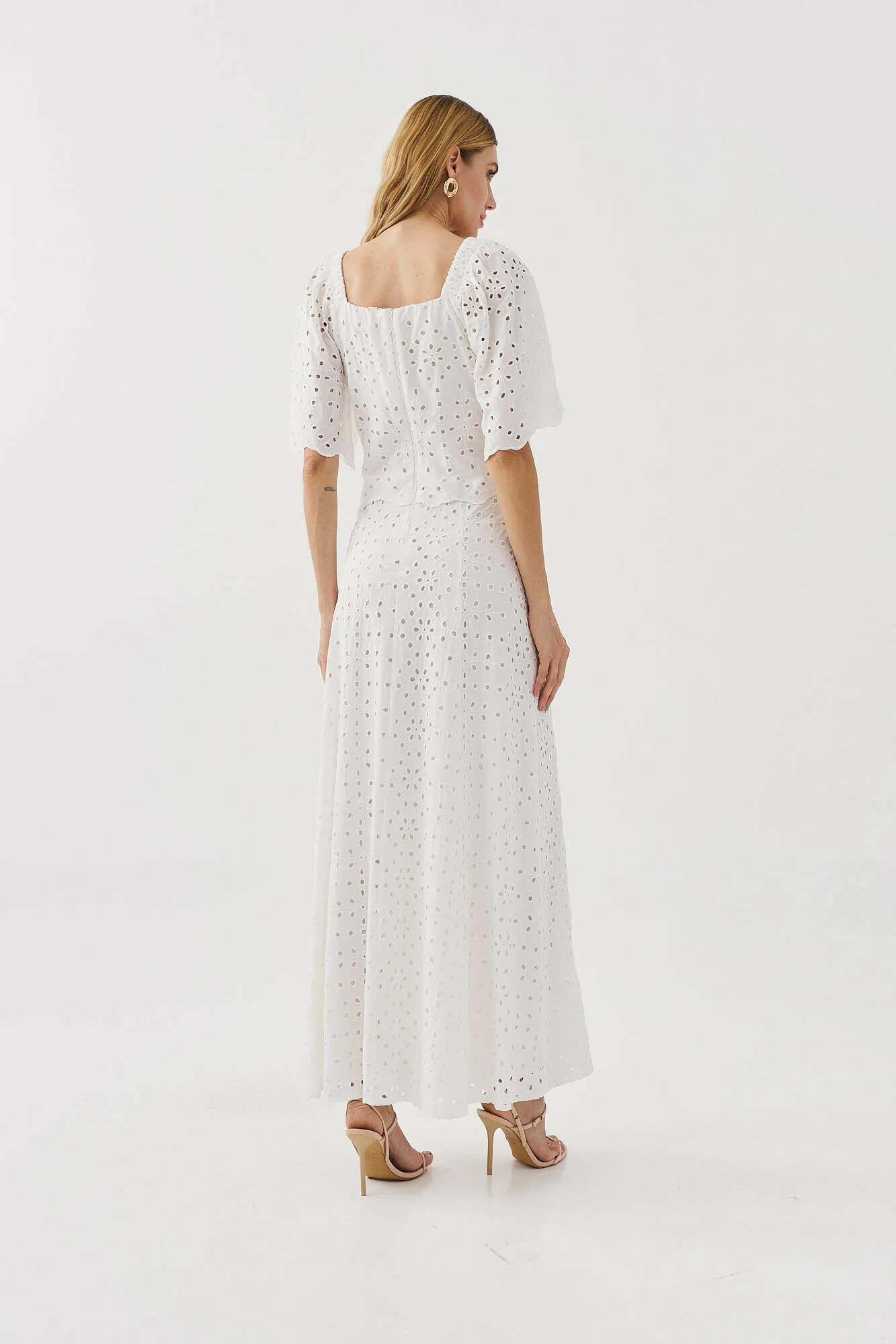 Ficha técnica: Vestido midi confeccionado em laise 100% algodão, com forro interno em poliéster. Modelagem acinturada, decote em “V”, mangas curtas bufantes e barrado trabalhado. Cor: branco. Origem: nacional. Cuidados: lavar à mão com sabão neutro, não usar alvejante, secar à sombra e passar em temperatura média.