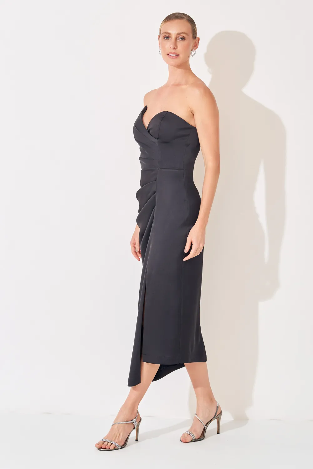 O Vestido Midi Adeline é a personificação da elegância moderna com um toque ousado e refinado. Confeccionado em crepe acetinado, ele combina estrutura e fluidez em equilíbrio perfeito, resultando em um caimento impecável que realça a silhueta com sofisticação. O decote assimétrico sem alças valoriza o colo com elegância e contemporaneidade, revelando um visual feminino e marcante. As pregas delicadas no busto, cintura e quadril moldam o corpo com naturalidade, destacando as curvas de forma sutil e harmoniosa. O acabamento acetinado adiciona brilho suave, tornando o Vestido Adeline uma escolha ideal para eventos noturnos, jantares elegantes e celebrações especiais que pedem um toque de modernidade e glamour.