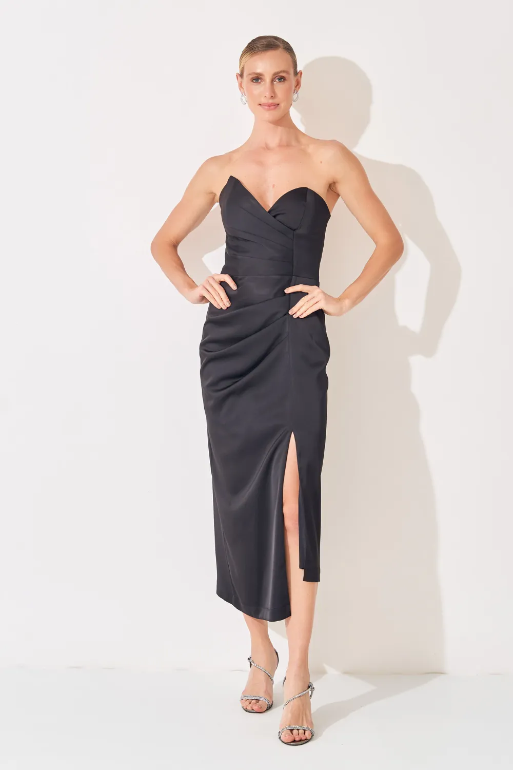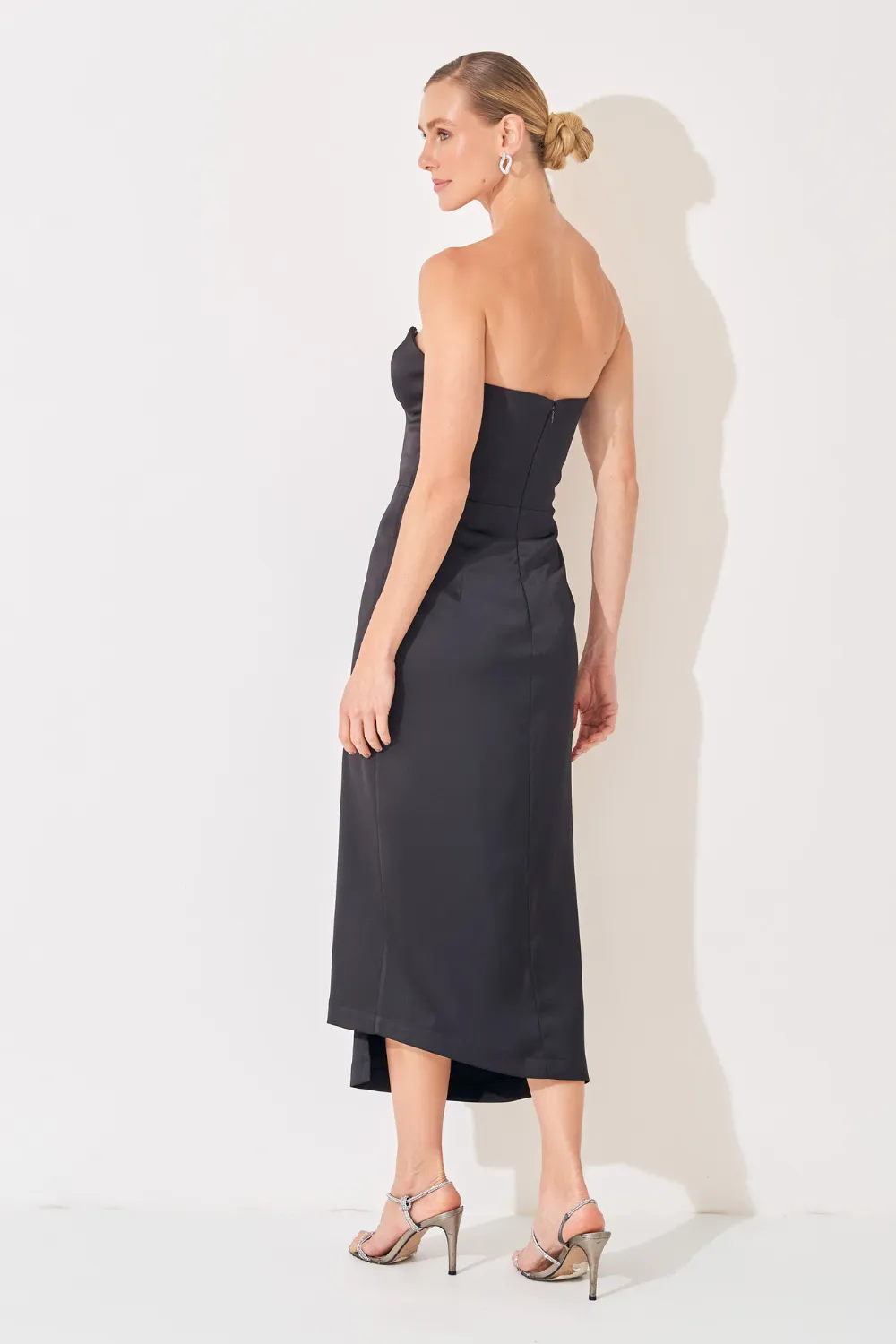 Ficha técnica: confeccionado em 100% poliéster, em crepe acetinado de caimento estruturado e brilho sutil. Modelagem midi ajustada com decote assimétrico sem alças e pregas delicadas no busto, cintura e quadril. Origem nacional. Requer lavagem delicada à mão, não alvejar e secar à sombra para preservar o brilho e a textura do tecido.