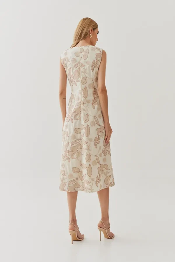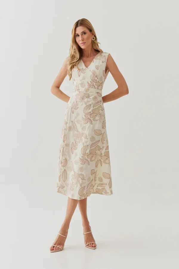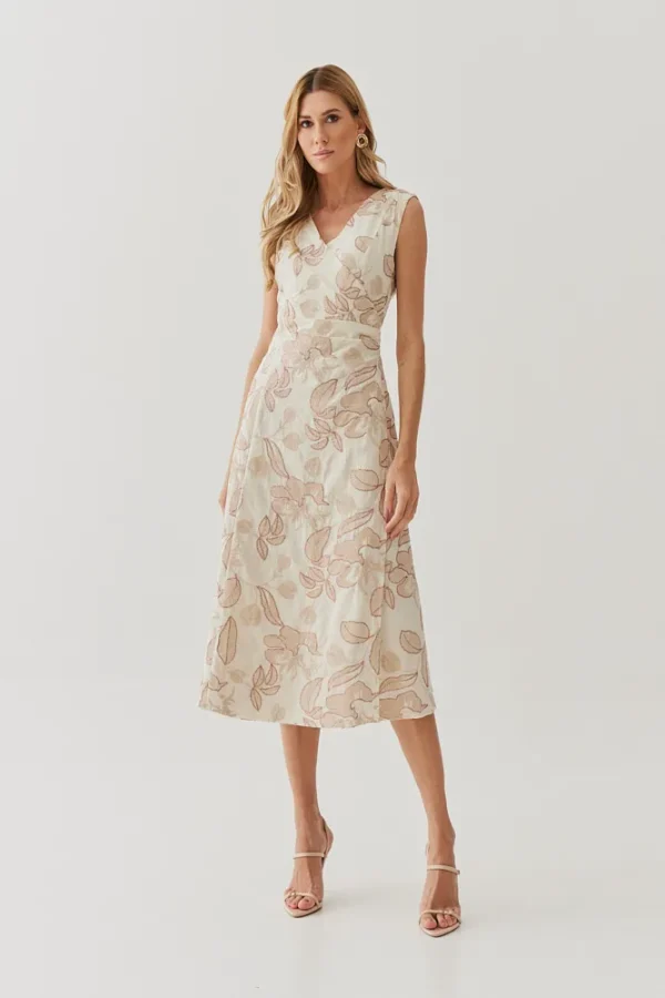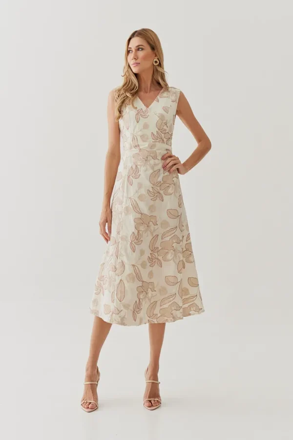 Um vestido que une romantismo e elegância em cada detalhe. O algodão bordado traz textura delicada e sofisticada, enquanto o decote transpassado valoriza o colo de forma sutil e feminina. As pregas na cintura moldam a silhueta com naturalidade, criando um caimento impecável. O comprimento midi completa a peça com versatilidade, perfeita para ocasiões que pedem charme sem exagero.