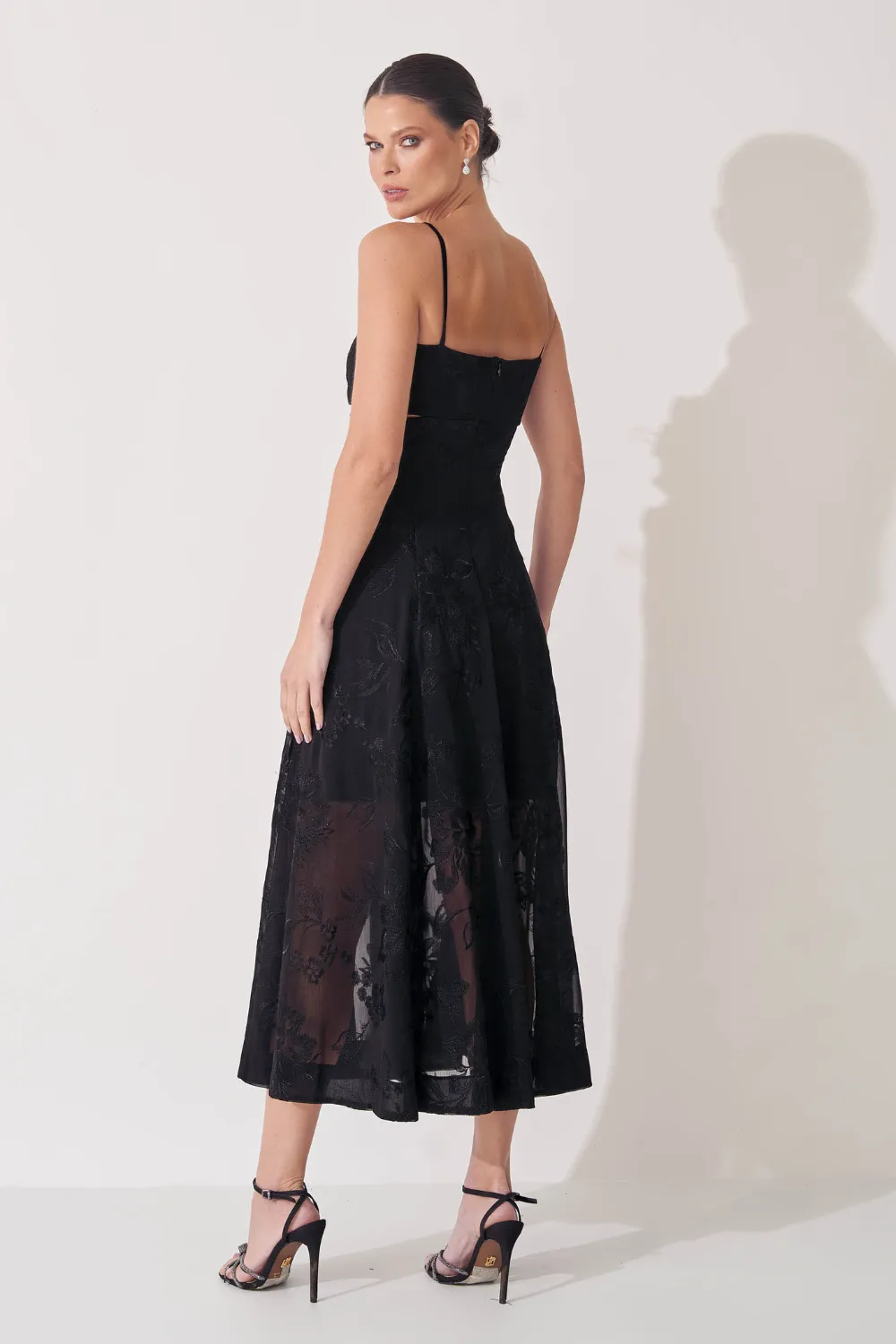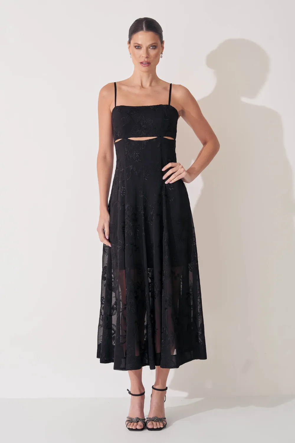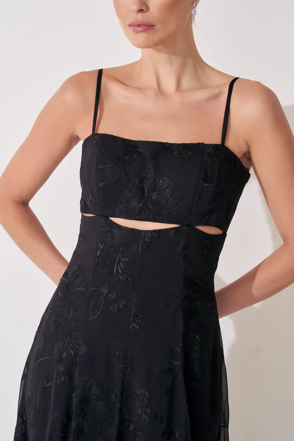 Ficha técnica: 100% poliéster. Tecido em chiffon maquinetado leve e fluido. Modelagem midi com decote quadrado, alças finas, recorte abaixo do busto e saia rodada com transparência suave. Origem: nacional. Cuidados: lavar à mão com sabão neutro, não torcer, secar à sombra e passar a vapor em baixa temperatura pelo avesso.