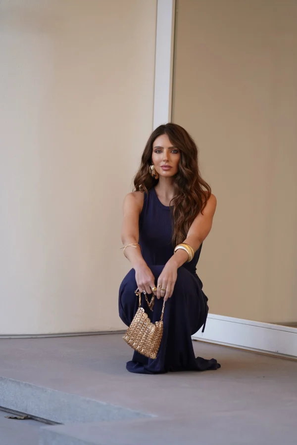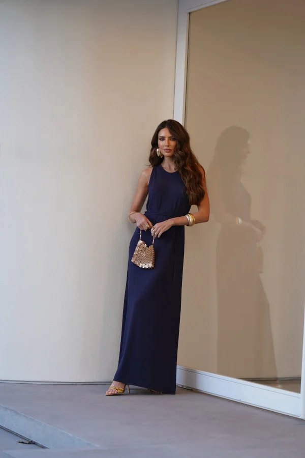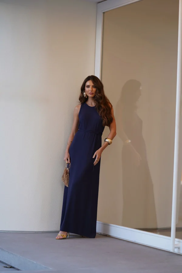 O comprimento longo, a ausência de mangas e a faixa na cintura criam uma silhueta elegante e feminina, sem esforço. Uma peça que transita facilmente do dia à noite, bastando trocar os acessórios para transformar o look.