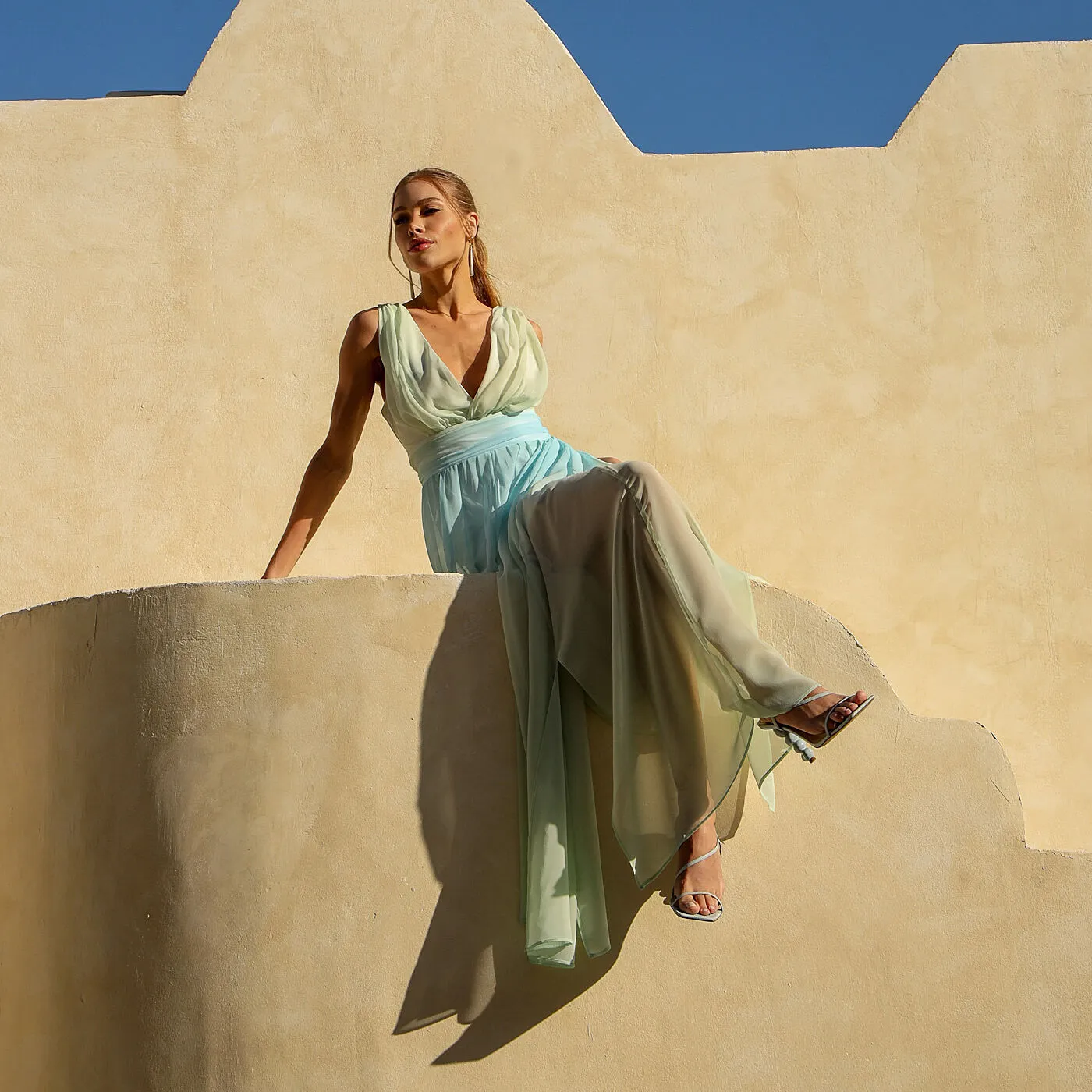 Chiffon Raquel Est. Ombré – Vestido longo com recortes e fendas no barrado. Possui busto franzido com decote em V profundo, além de cintura marcada. Forrado para maior conforto, conta com fechamento por zíper invisível nas costas. Peça elegante e fluida