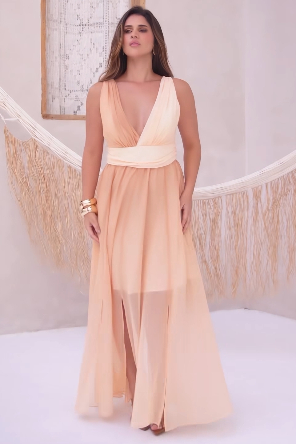 O busto franzido com decote em V profundo valoriza o colo de forma elegante e sensual na medida certa, enquanto a cintura marcada define a silhueta com delicadeza, alongando visualmente o corpo ✨. Os recortes e fendas no barrado adicionam leveza, movimento e um toque contemporâneo, revelando a perna de forma sutil e sofisticada ao caminhar. Totalmente forrado, o vestido garante conforto e segurança ao vestir, além de um acabamento impecável. O fechamento por zíper invisível nas costas mantém a estética limpa e elegante, reforçando o cuidado nos detalhes. É a escolha perfeita para eventos especiais, casamentos ao ar livre, festas ao entardecer ou ocasiões em que você quer se sentir feminina, confiante e inesquecível 🤍.