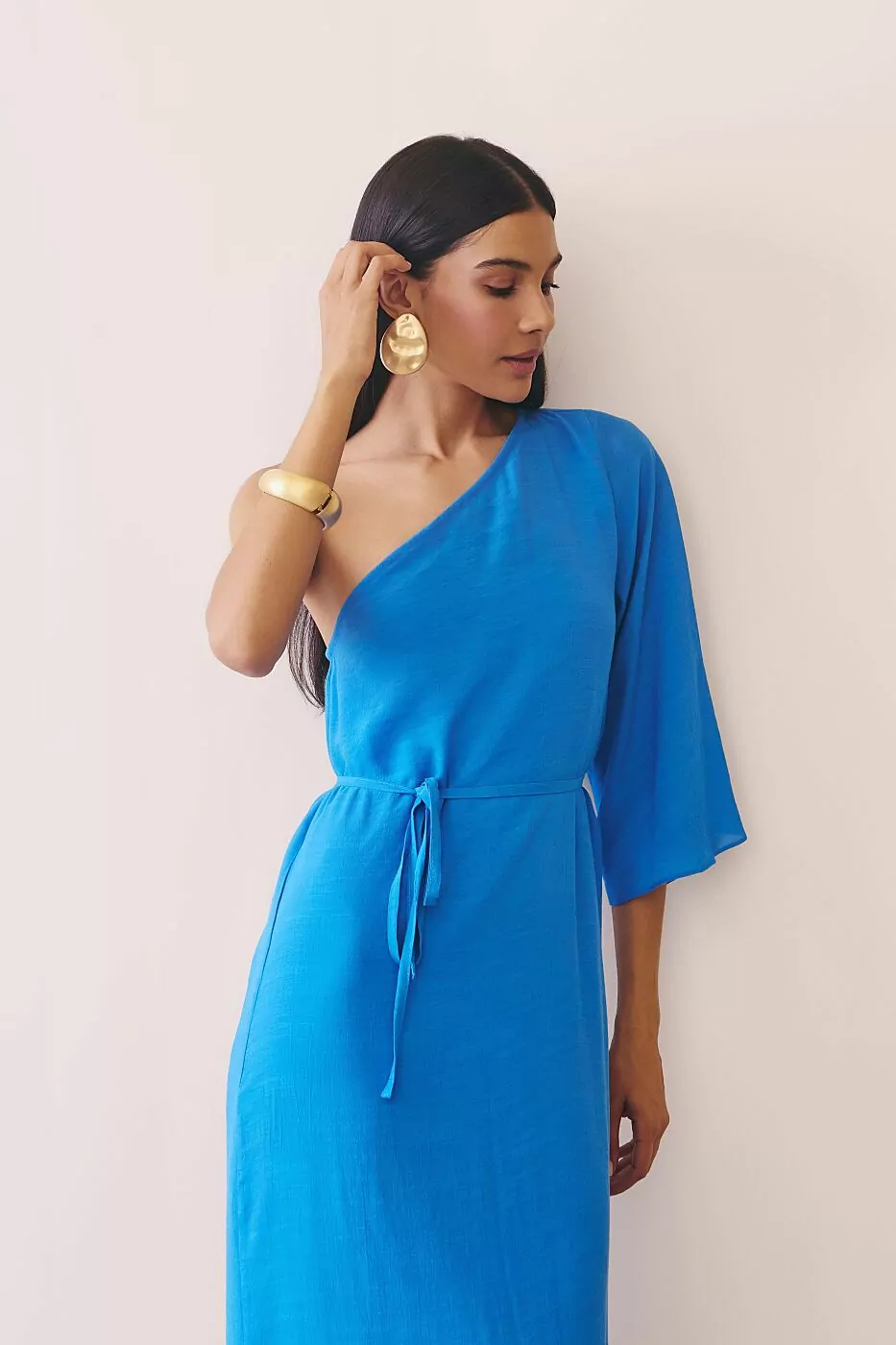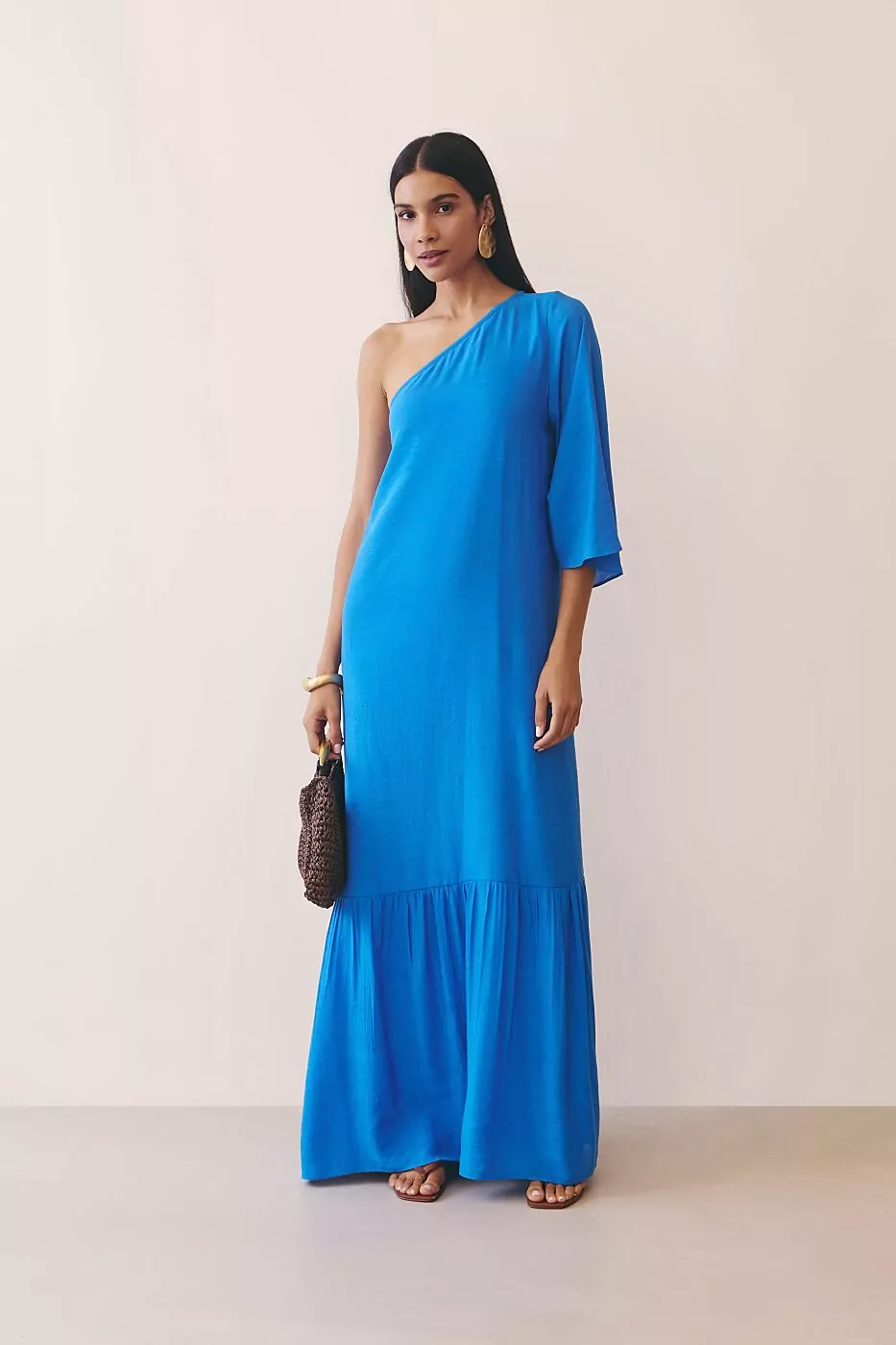 Ficha técnica: 64% viscose, 36% poliéster. Modelagem longa e fluida, com decote de um ombro só e detalhe franzido na barra. Cor: azul vibrante. Origem: nacional. Cuidados: lavar à mão, secar à sombra e passar em temperatura baixa.